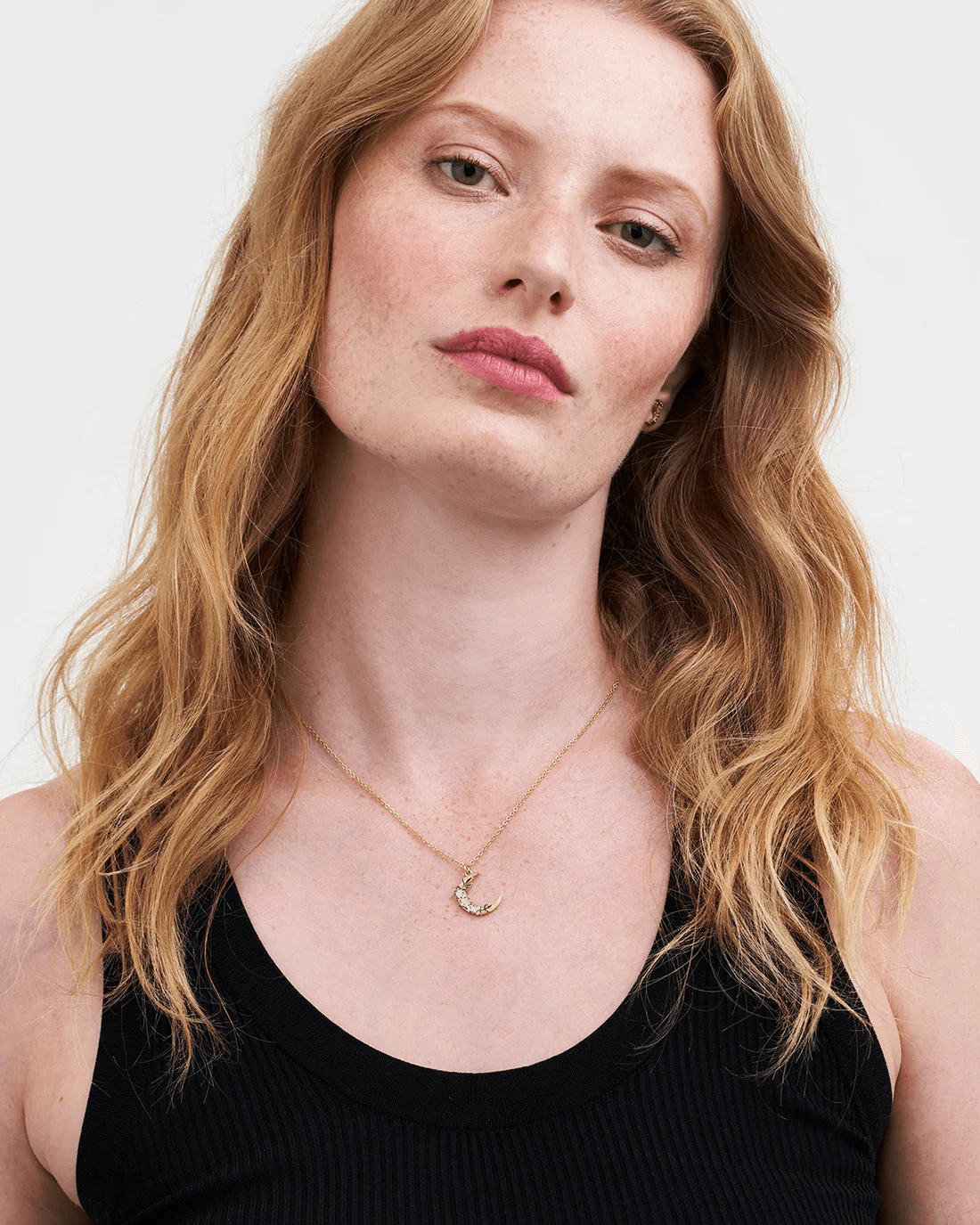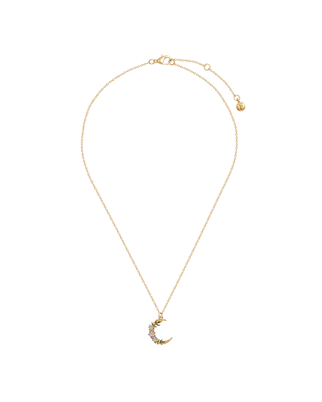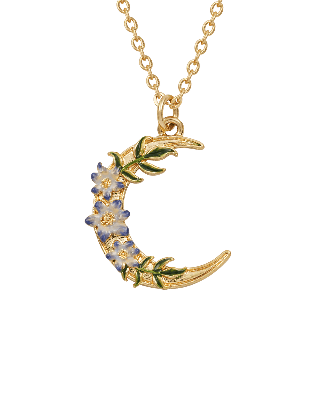Al caer la noche es cuando la flor de la belladona revela su verdadera belleza, reflejada en este delicado collar con colgante Belladona y Luna. Cuidadosamente pintadas a mano sobre el esmalte, las flores descansan sobre la luna creciente, confeccionada en latón chapado en oro de 22 quilates. Mágico y místico, si te gusta que tu bisutería tenga un aire vintage, querrás llevar este colgante celestial desde el amanecer hasta el anochecer.