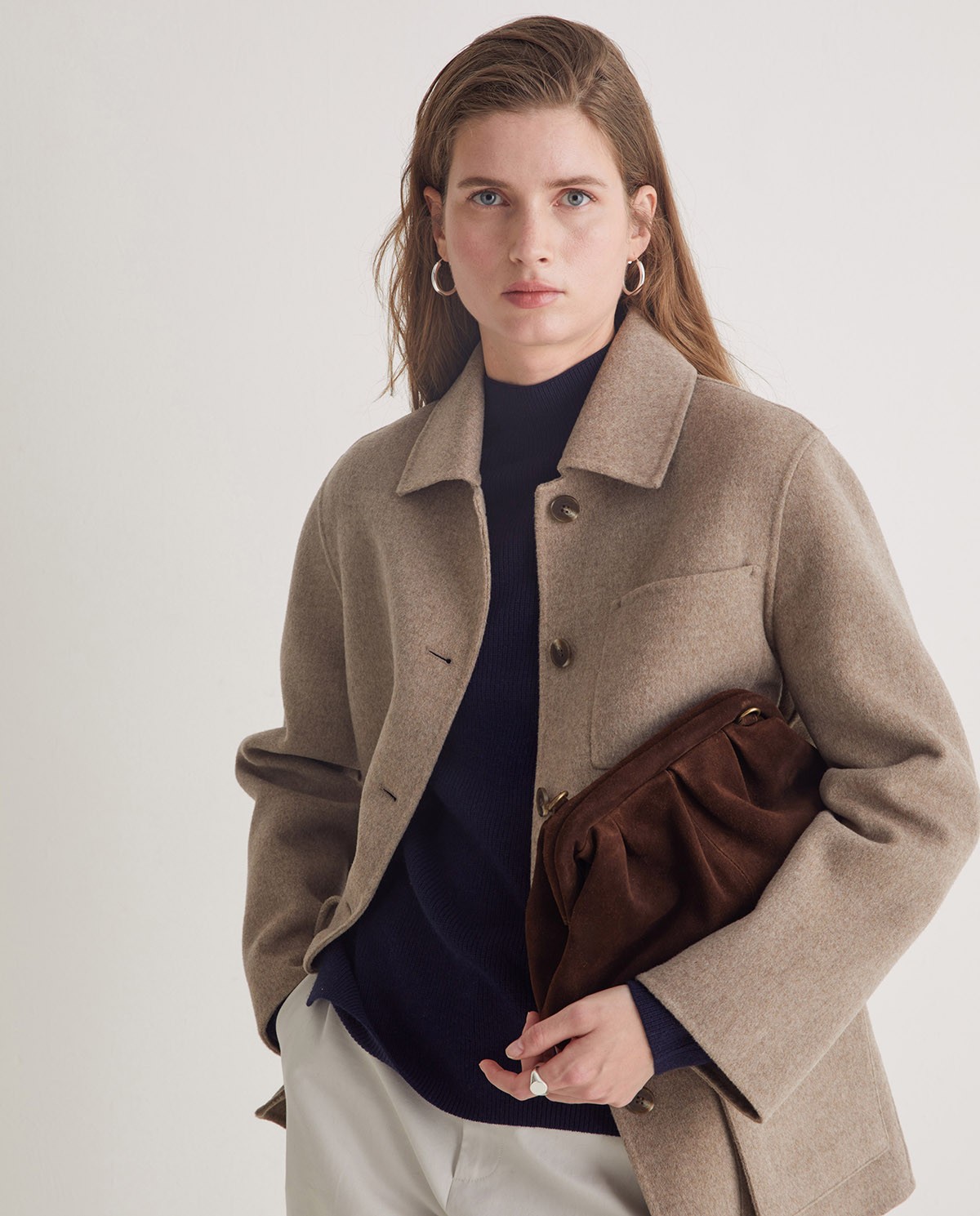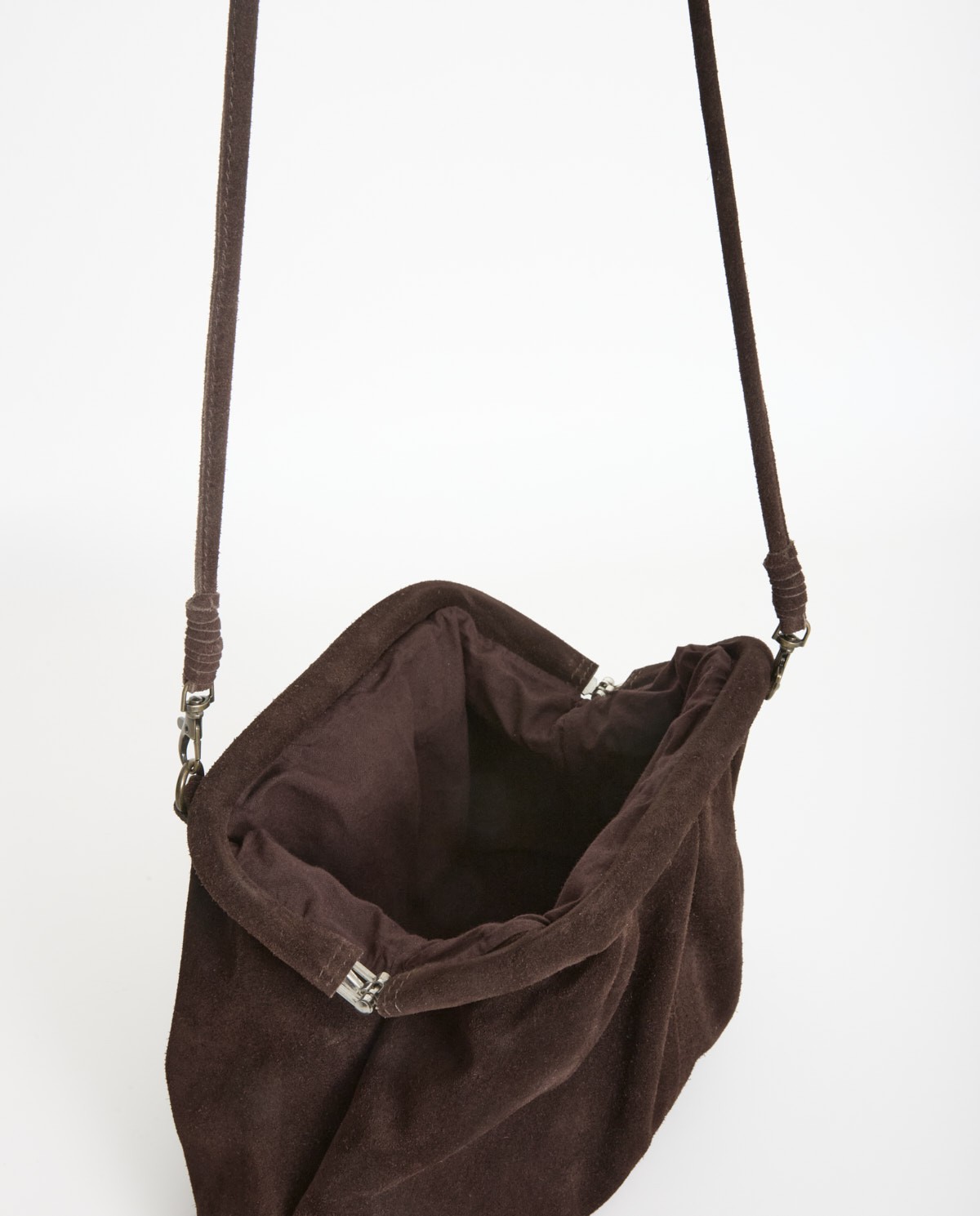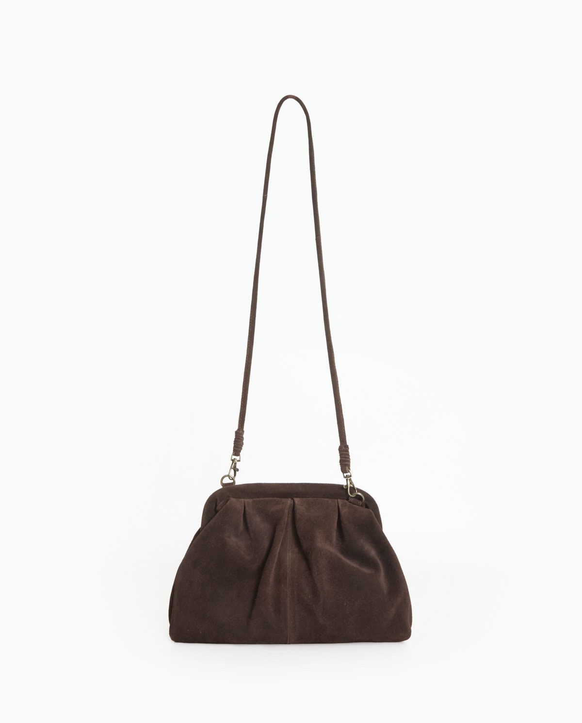 Bolso estilo clutch. Realizado en piel de serraje. Forrado en tejido de algodón. Cierre de click. Correa larga y extraíble para llevar al hombro, cruzado o de mano.