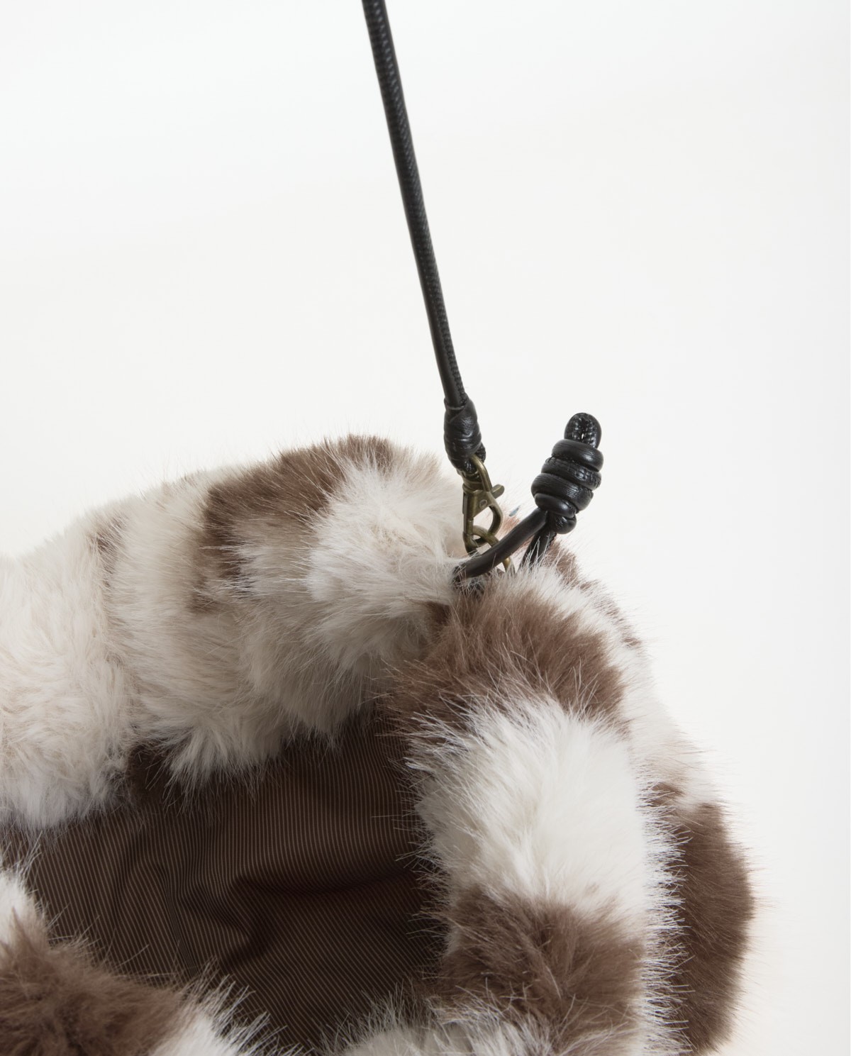 Bolso de pelo con forro interior. Asa de hombro de piel extraíble. Cierre con cordón de piel ajustable. Medidas: 42 x 26 x 13 cm.
