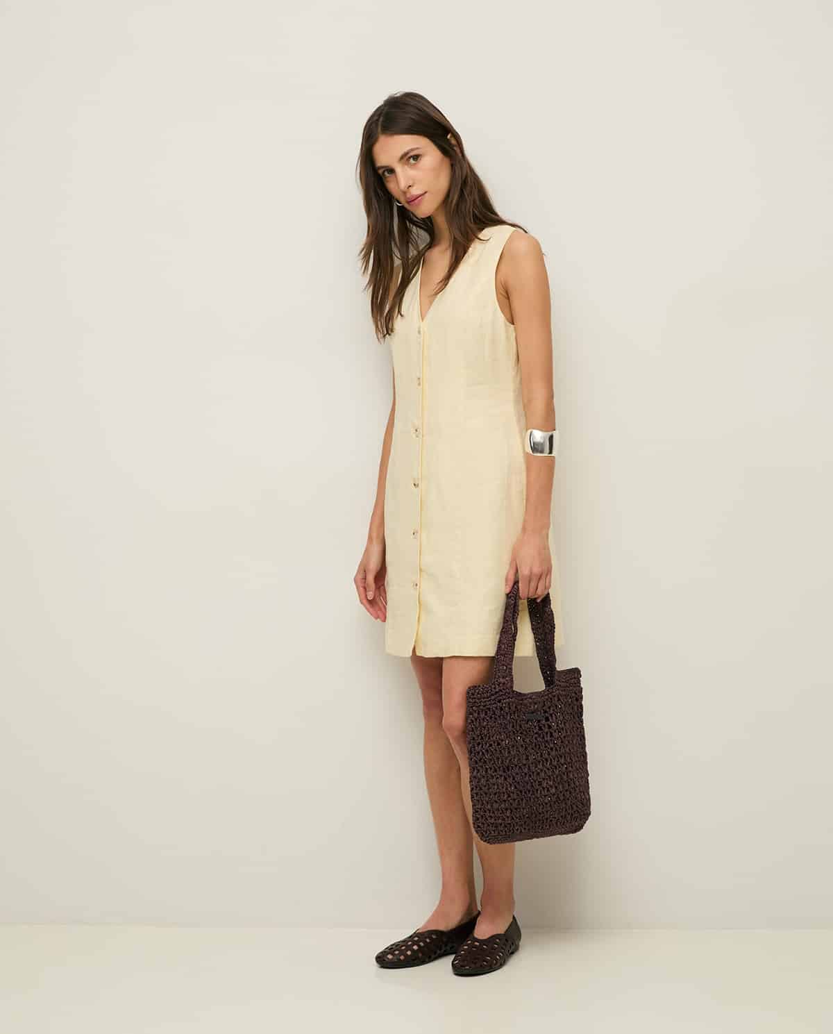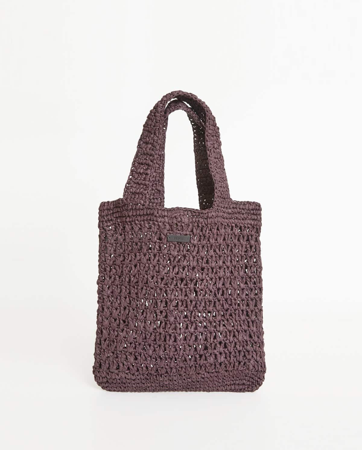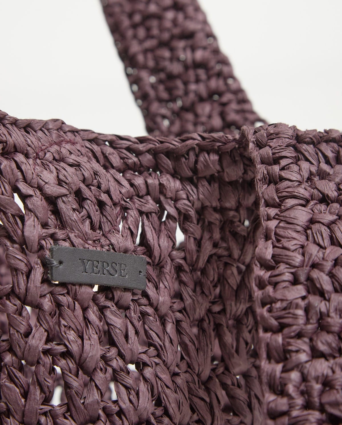 Bolso tote hecho a mano color chocolate. Cierre con imán. Trenzado abierto con asas cortas integradas en la estructura del bolso. Detalle logo Yerse frontal. Medidas: 32 x 32cm.