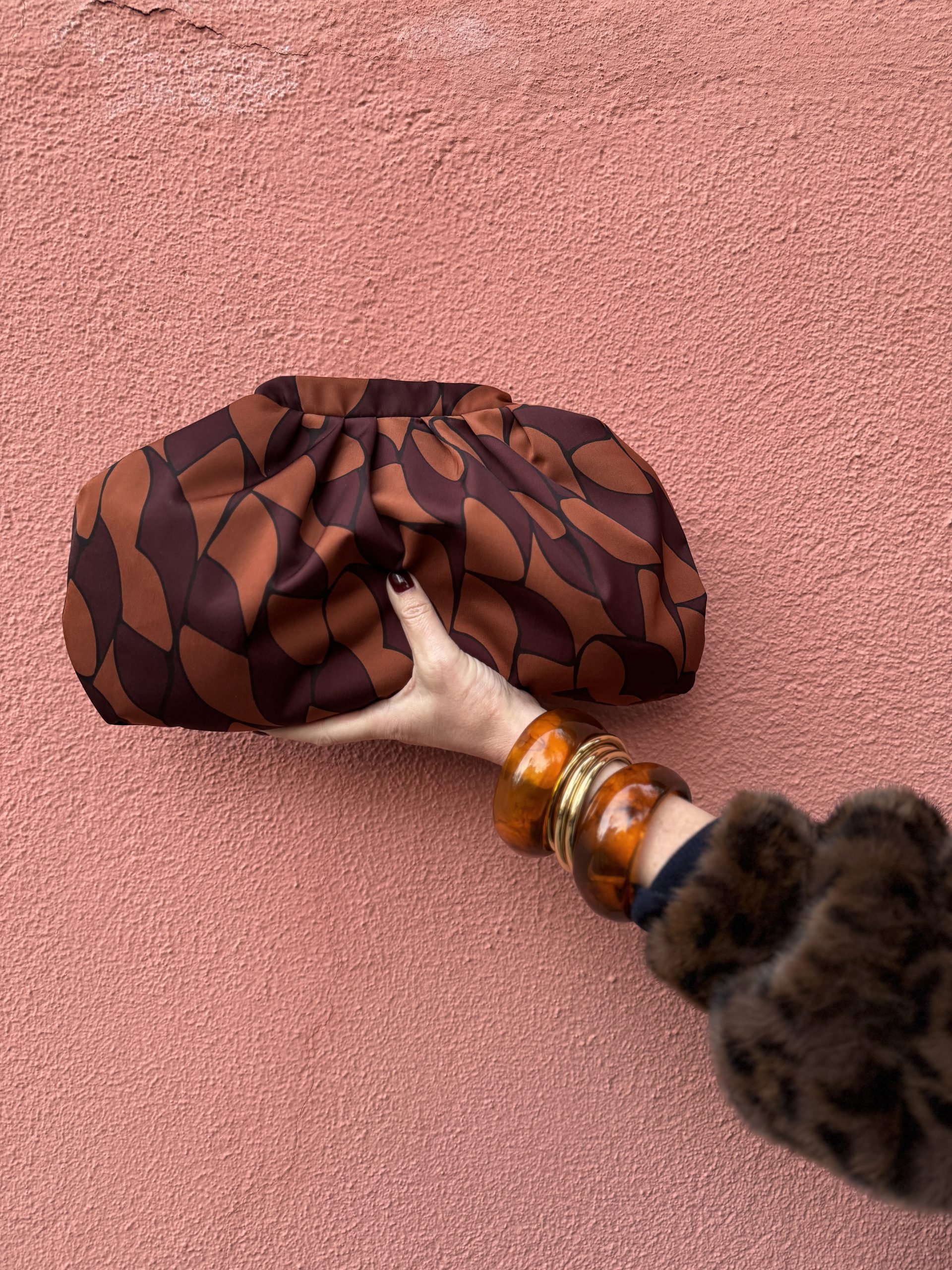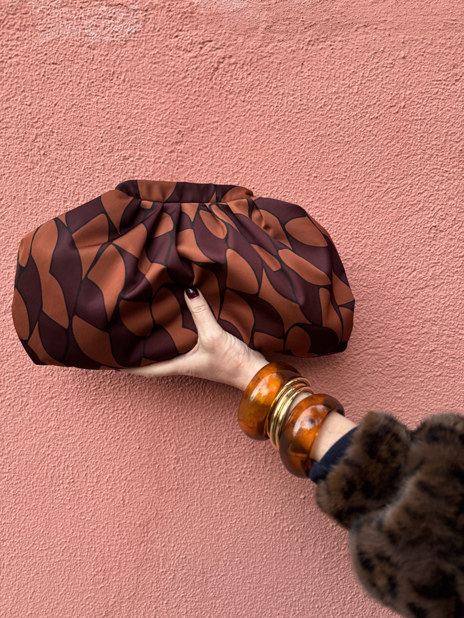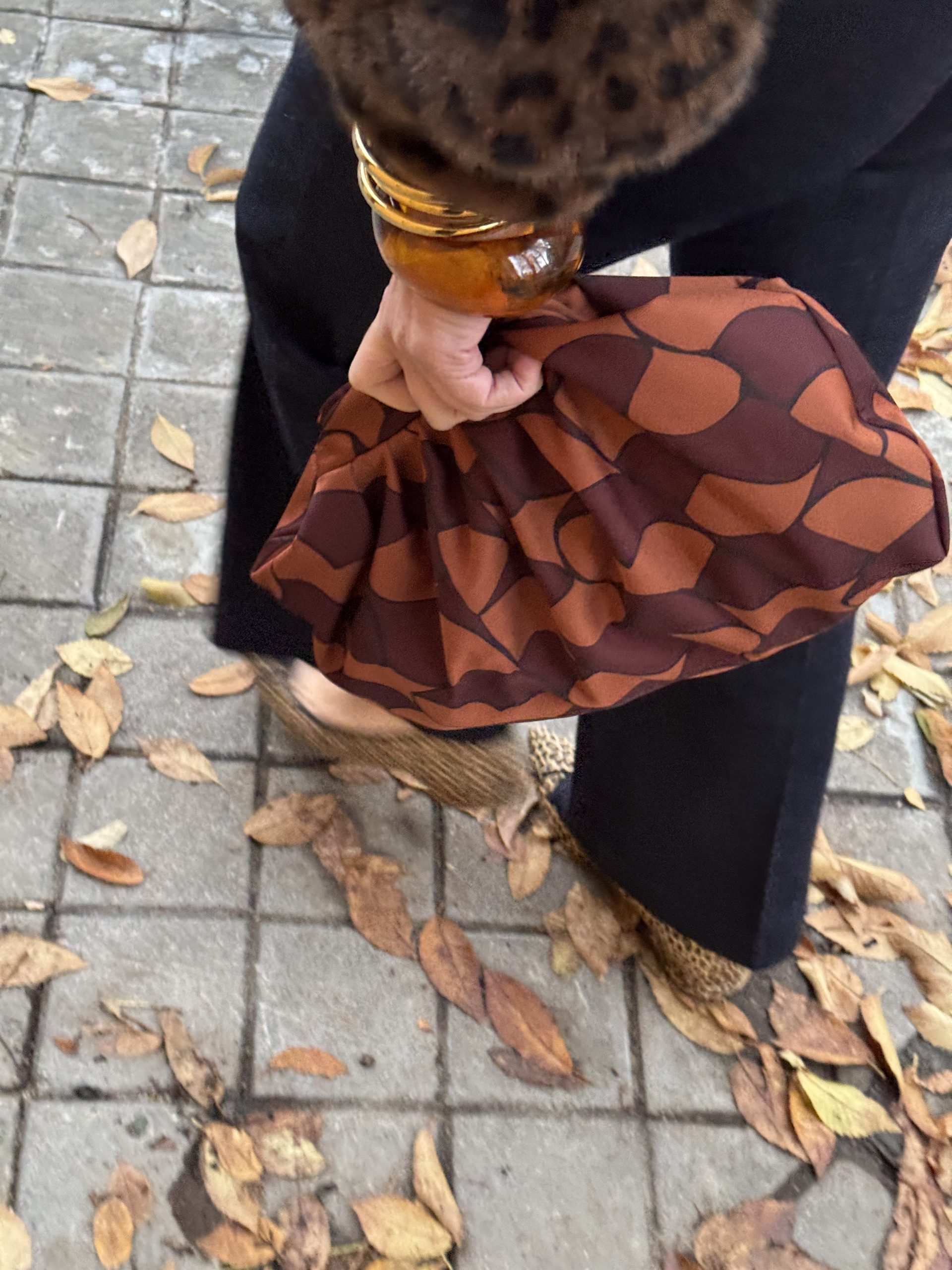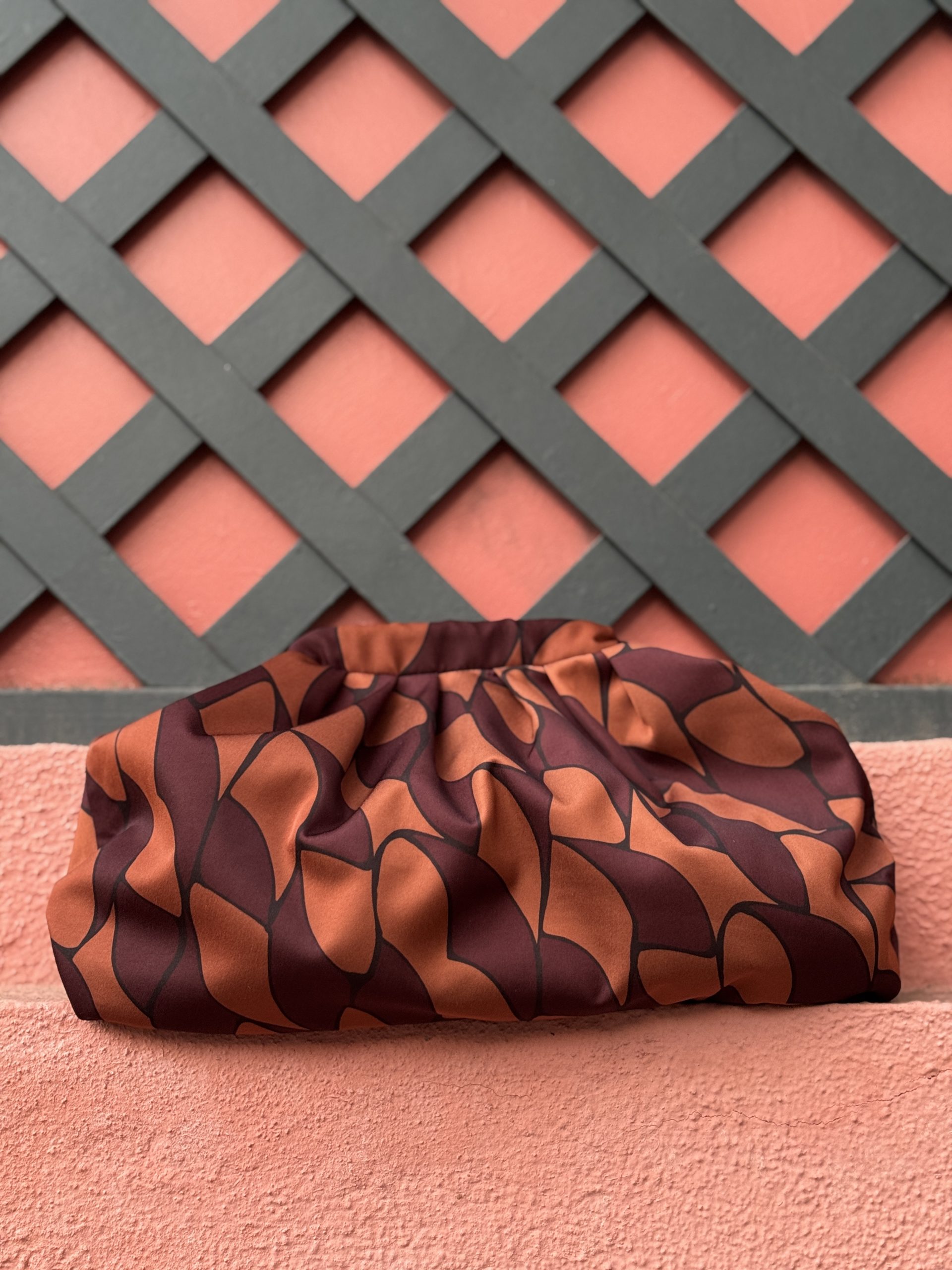 TELA EN CREPE EN COLORES MARRONES, FORRO NEGRO DE LONETA DE ALGODÓN Y UNAS TABLILLAS PARA PODER PONERLE UN ASA, CADENA PARA LLEVARLA COLGADA.