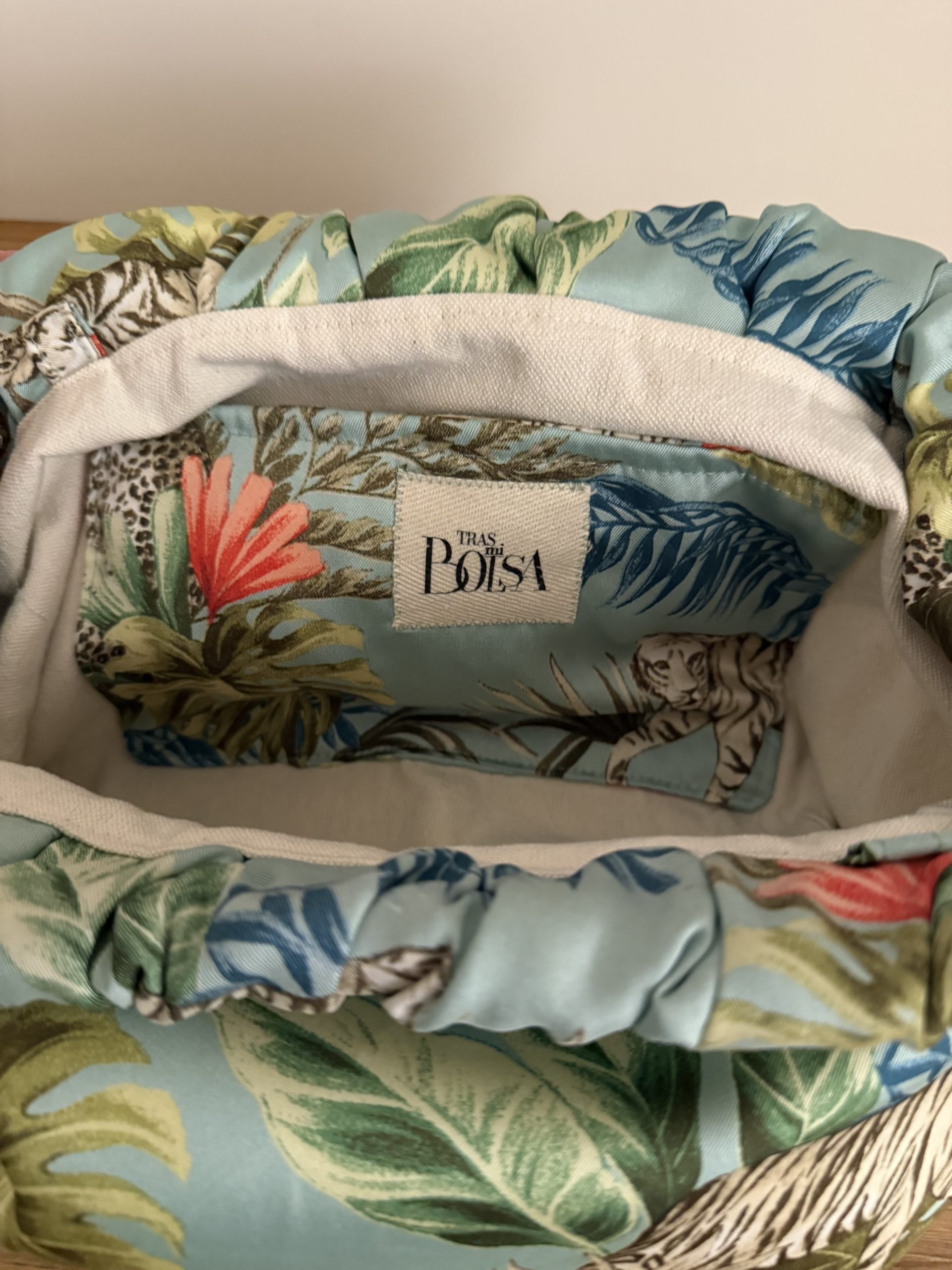 TELA EN VISCOSA ESTAMPADO SELVA. COLORES VIVOS, FONDO EN VERDE AGUA. FORRO LONETA GRUESA CRUDA CON BOLSILLO INTERIOR.