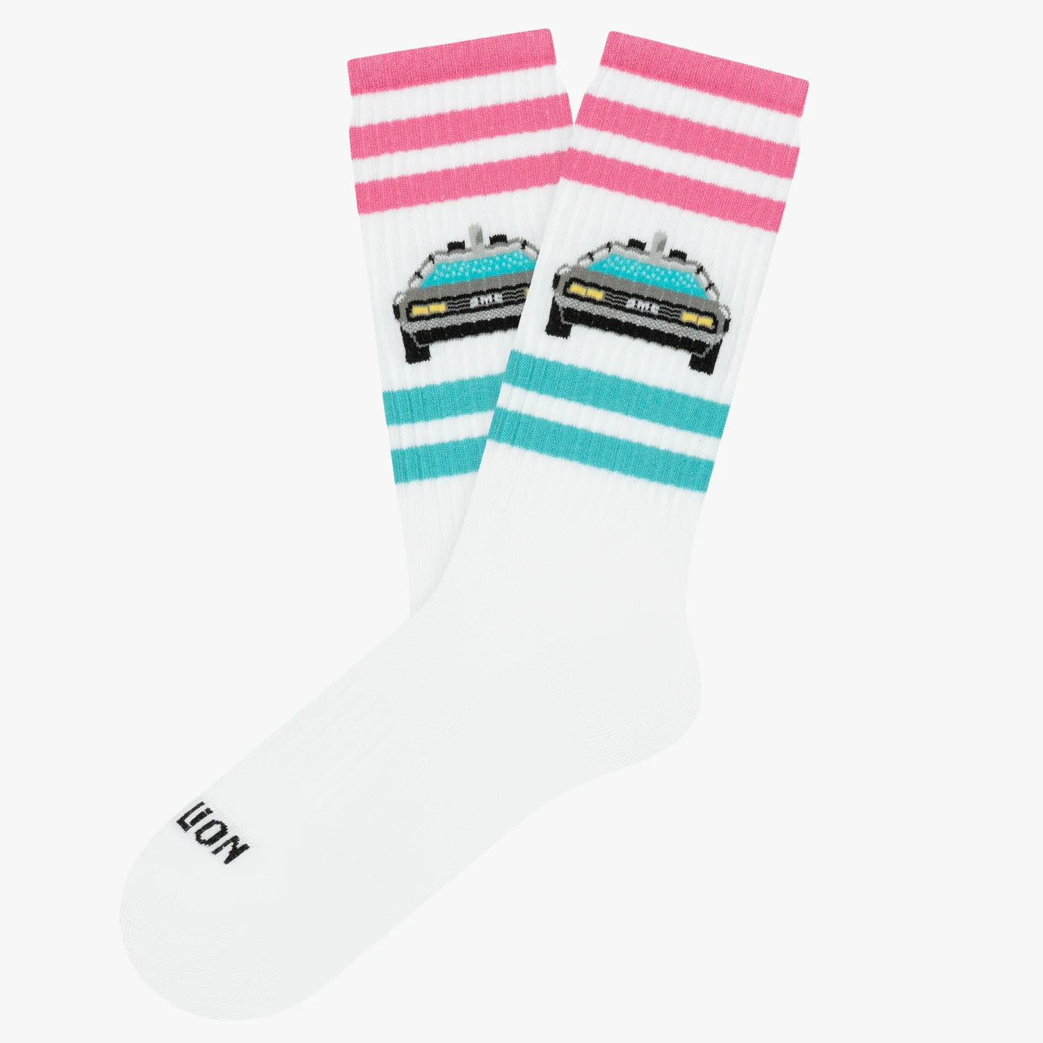 DESCUBRE EL UNIVERSO DE LA FAMOSA PELÍCULA DE DE ROBERT ZEMECKIS, REGRESO AL FUTURO, Y VIAJA EN EL TIEMPO A BORDO DEL DELOREAN COMO MARTY MCFLY CON ESTOS CALCETINES TAN ORIGINALES. REGRESA A LOS AÑOS 80 CON ESTE INCREIBLE DISEÑO ATEMPORAL QUE PODRÁS COMBINAR CON TUS MEJORES OUTFITS. ABRÓCHATE EL CINTURÓN... ¡EL DELOREAN SE PONE EN MARCHA!