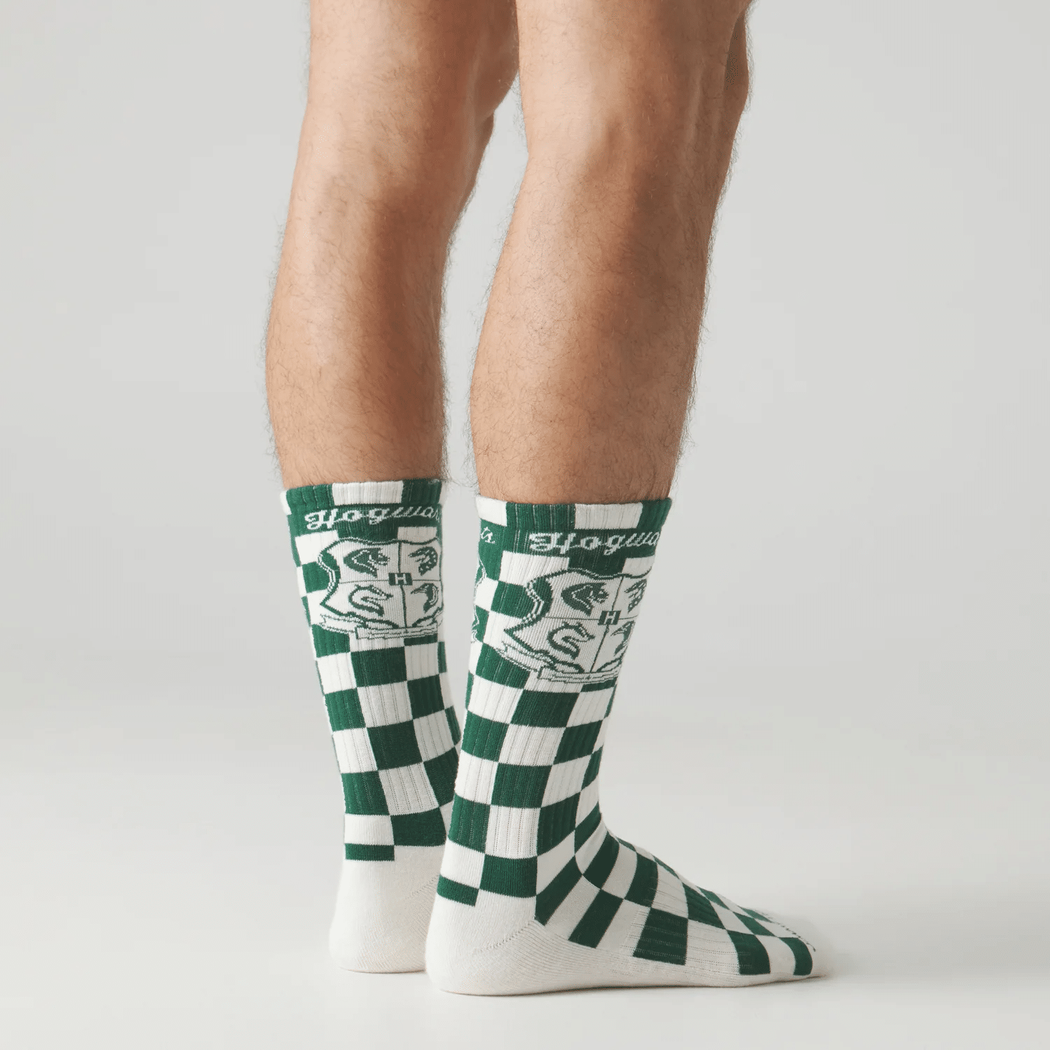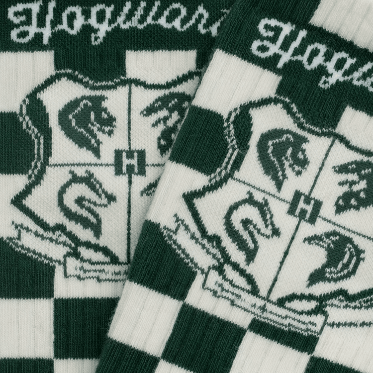 Calcetines Harry Potter de cuadros verdes y el escudo de Hogwarts. Fabricados con una mezcla premium de algodón orgánico peinado para ofrecer máxima comodidad y durabilidad.