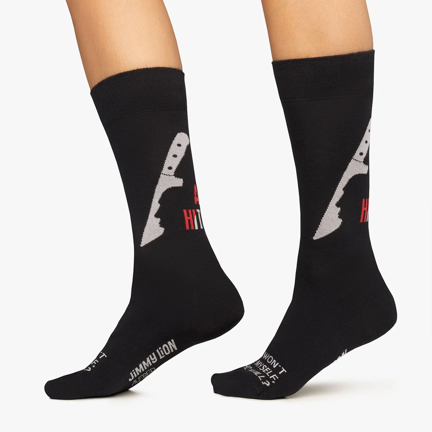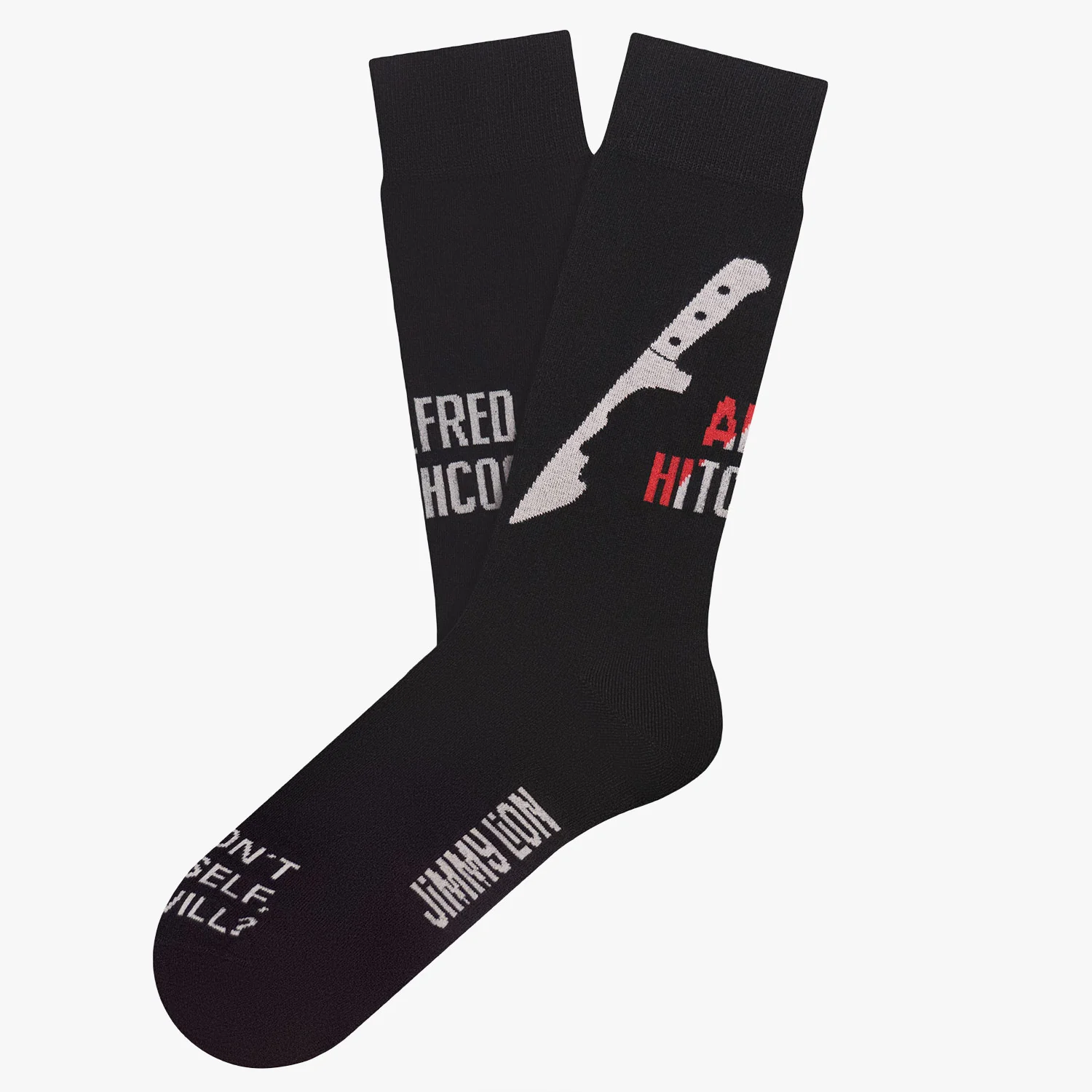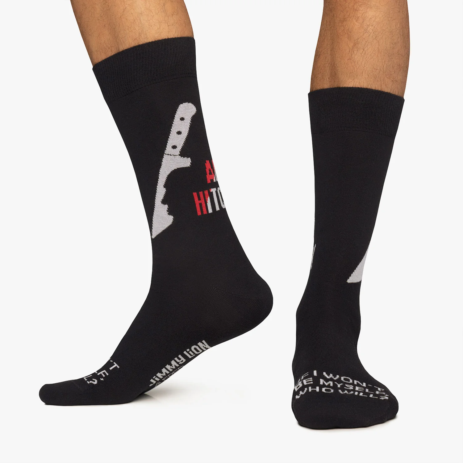 EL DISEÑO DE ESTOS TERRORÍFICOS CALCETINES UNISEX TE PONDRÁ LOS PELOS DE PUNTA Y TE SUMERGIRÁ DE NUEVO EN EL UNIVERSO DE ALFRED HITCHCOCK. EL DETALLE DEL CUCHILLO, LA SILUETA DEL FAMOSO CINEASTA Y LAS LETRAS DE SU NOMBRE MANCHADAS DE SANGRE, TE TRANSLADARÁN A LAS HISTORIAS MAS ESPELIZNANTES Y SANGUINARIAS DE LA HISTORIA DEL CINE. ADEMÁS EL COLOR NEGRO DEL FONDO DARÁ UN TOQUE ATERRADOR A CUALQUIER LOOK. CON ESTOS CALCETINES TAN ORIGINALES Y VERSÁTILES ¡DEJARÁS A TODOS SIN RESPIRACIÓN!