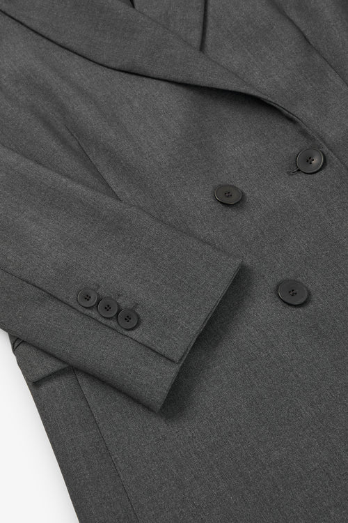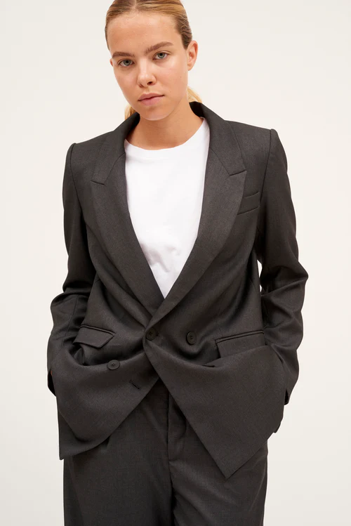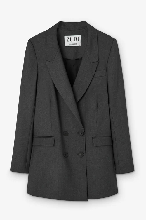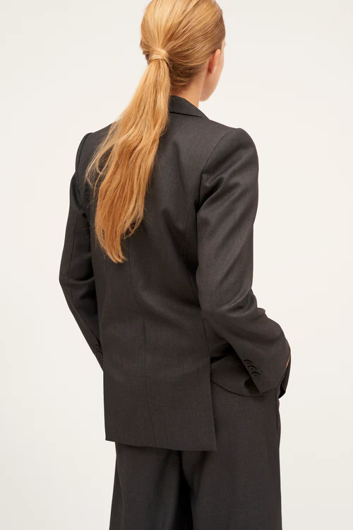 Victoria es una blazer cruzada de largo 3/4 confeccionada en tejido de mezcla con caída fluida. Solapa ancha y doble botonadura en el delantero.