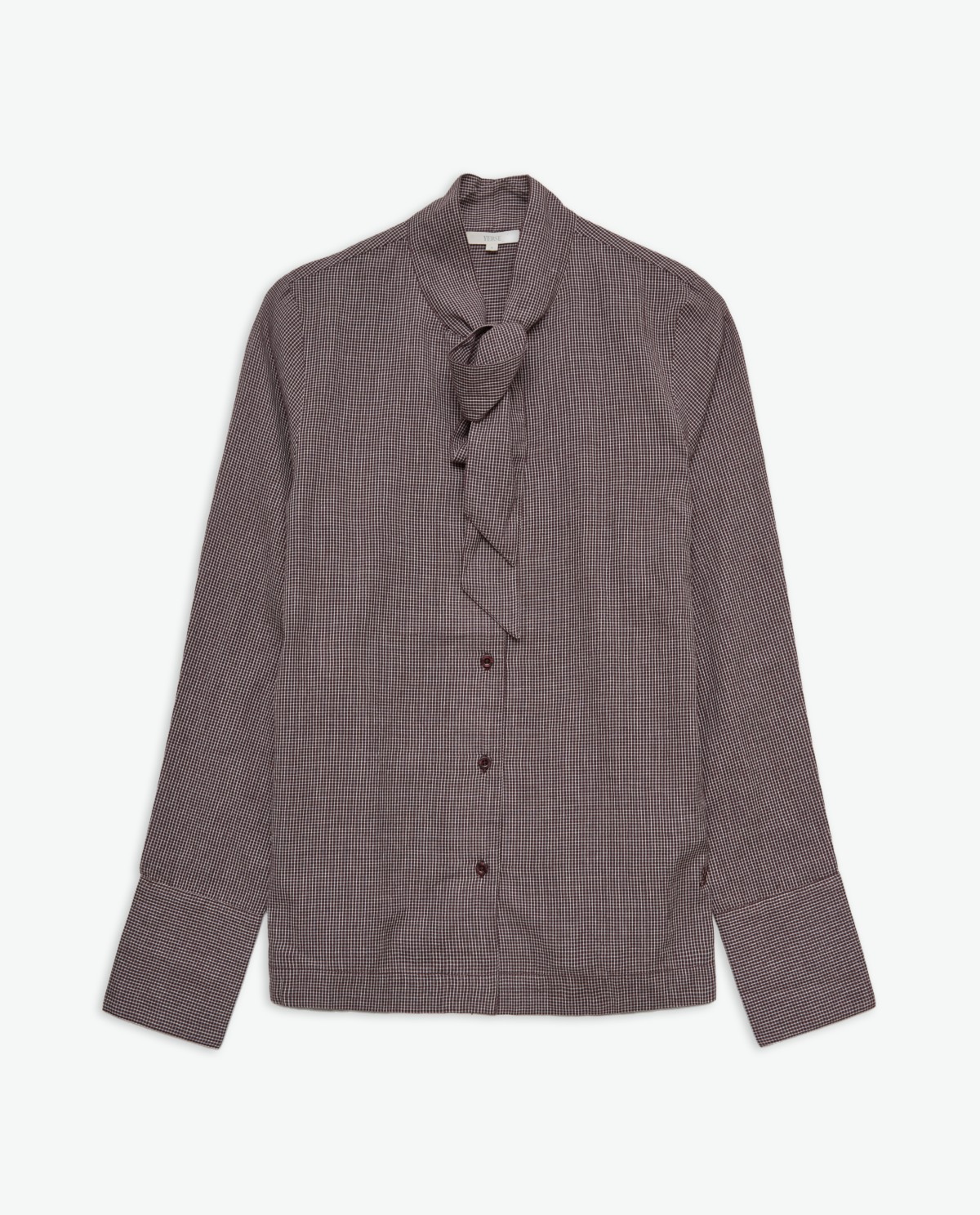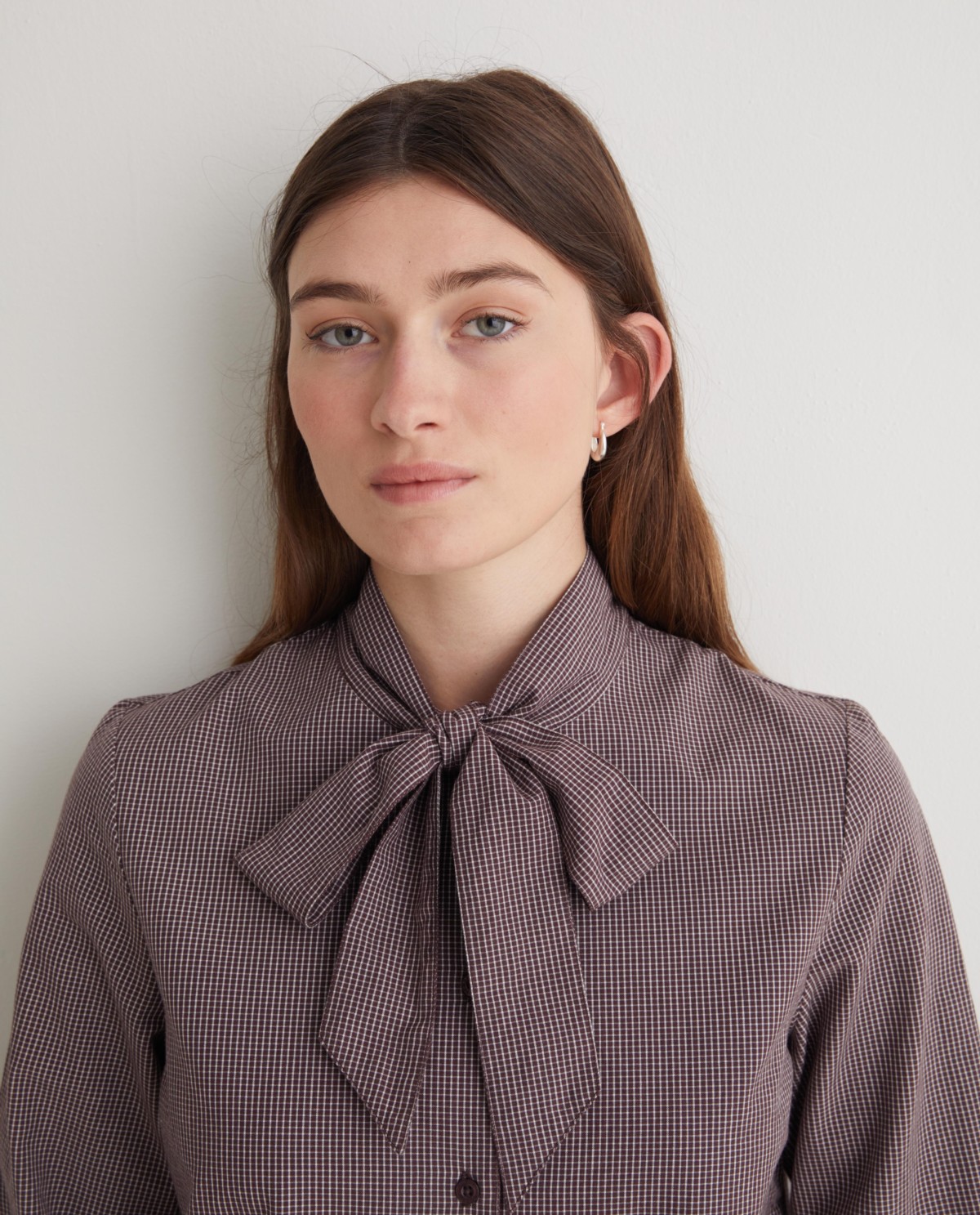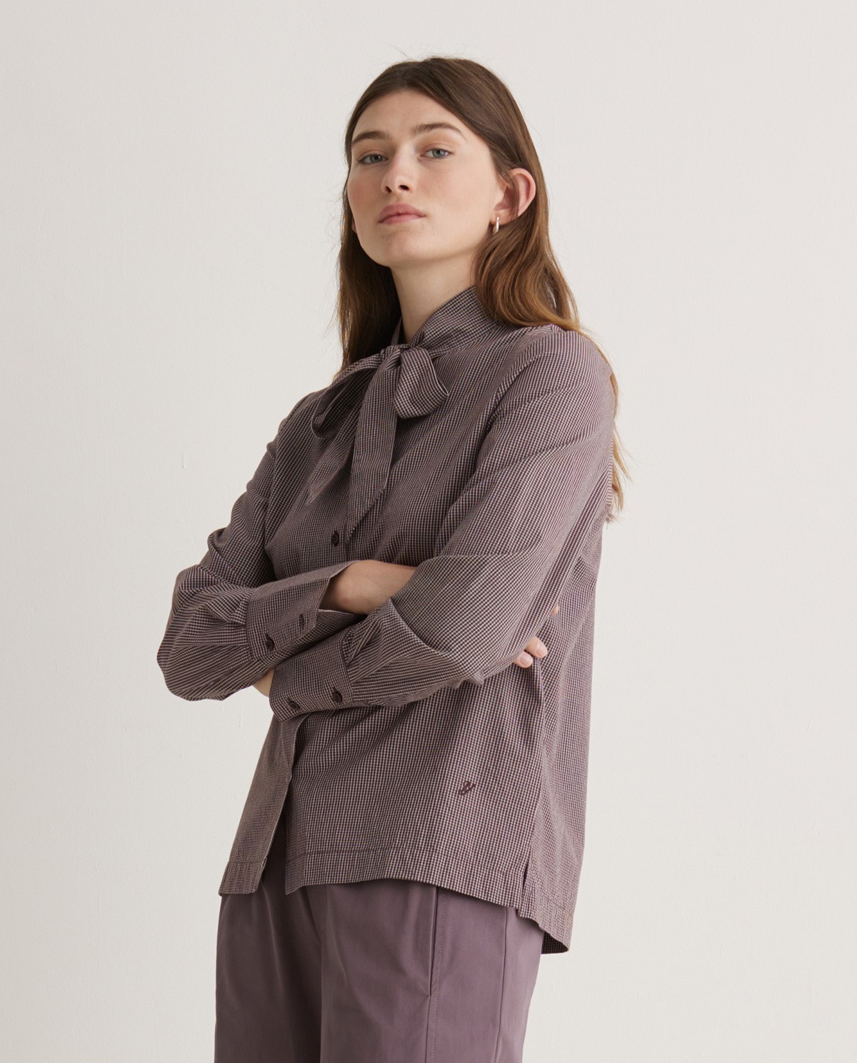 Blusa 100% algodón. Fit regular. Estampado de cuadros. Cuello redondo con lazo anudable. Manga larga. Puños abotonados. Cierre con botones. Logo bordado en bajo. Detalle pinza en la espalda.