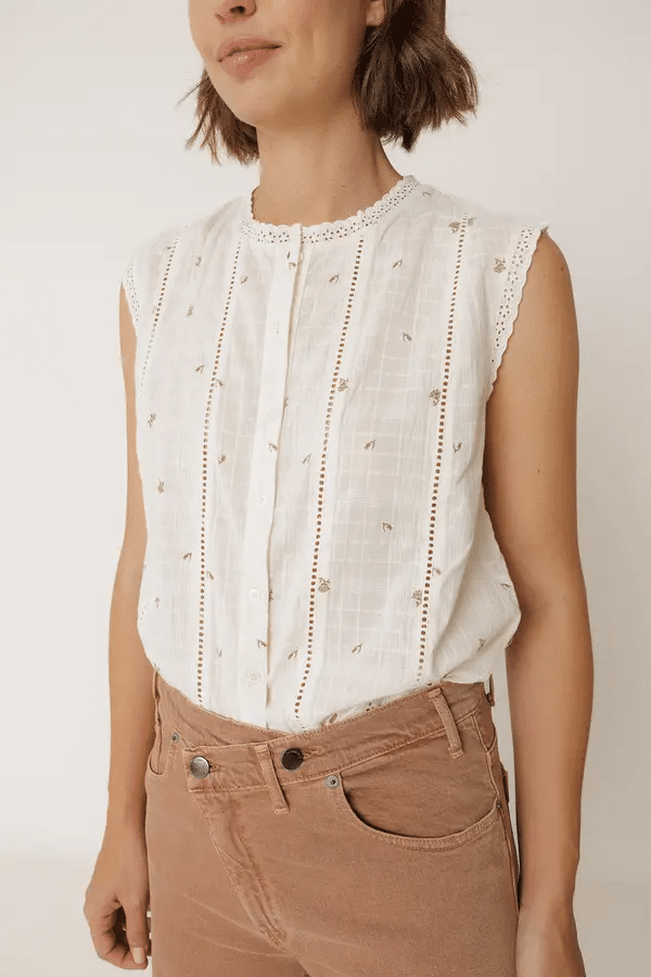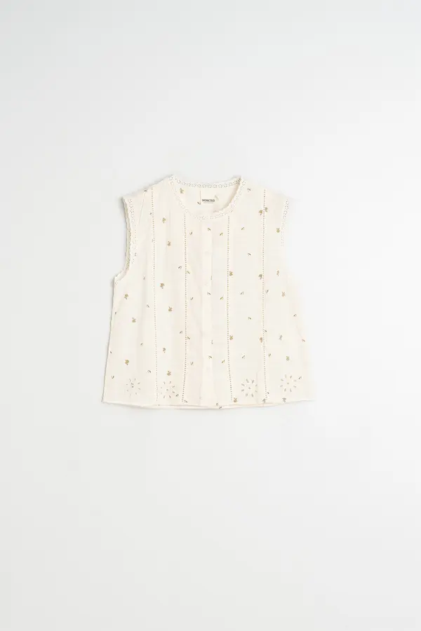 Camisa sin mangas con estampado floral tipo sello sobre dobby de algodón. Detalles bordados y recortados en el bajo. Una prenda con aire romántico, fácil de combinar en todos los looks. Cuello caja y hombro encajado con acabado en puntilla.