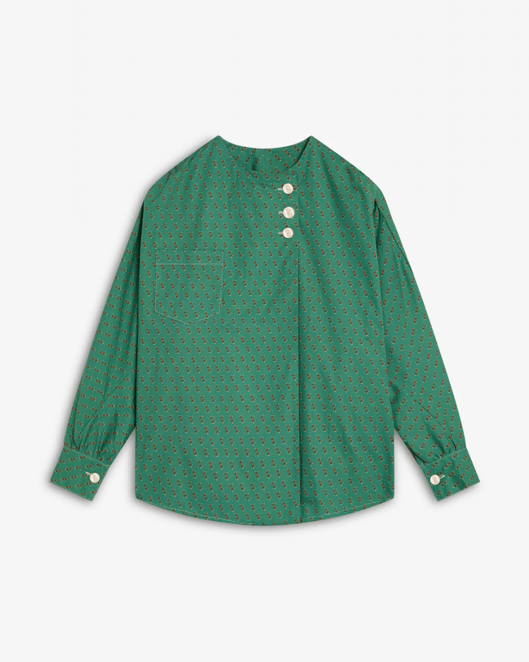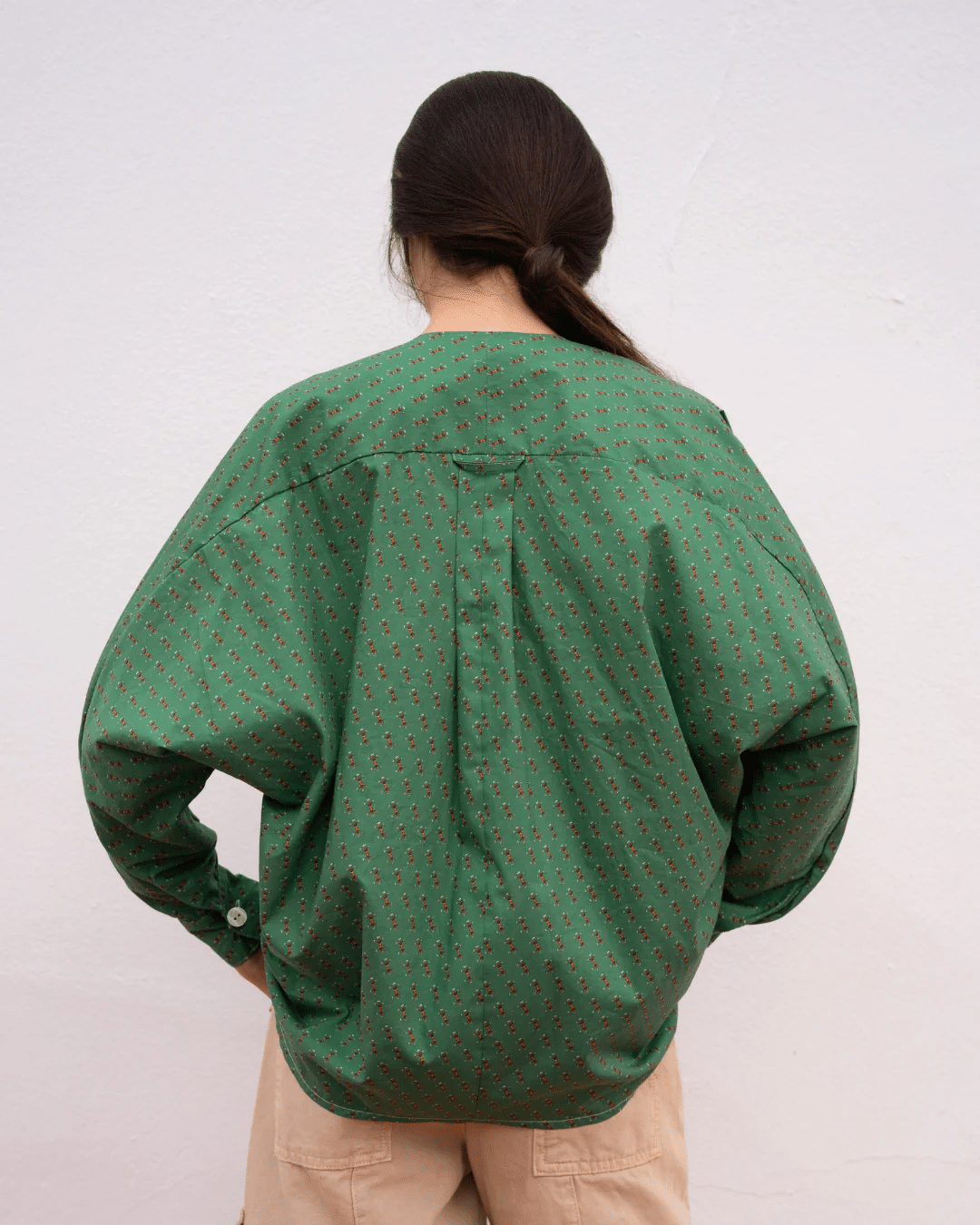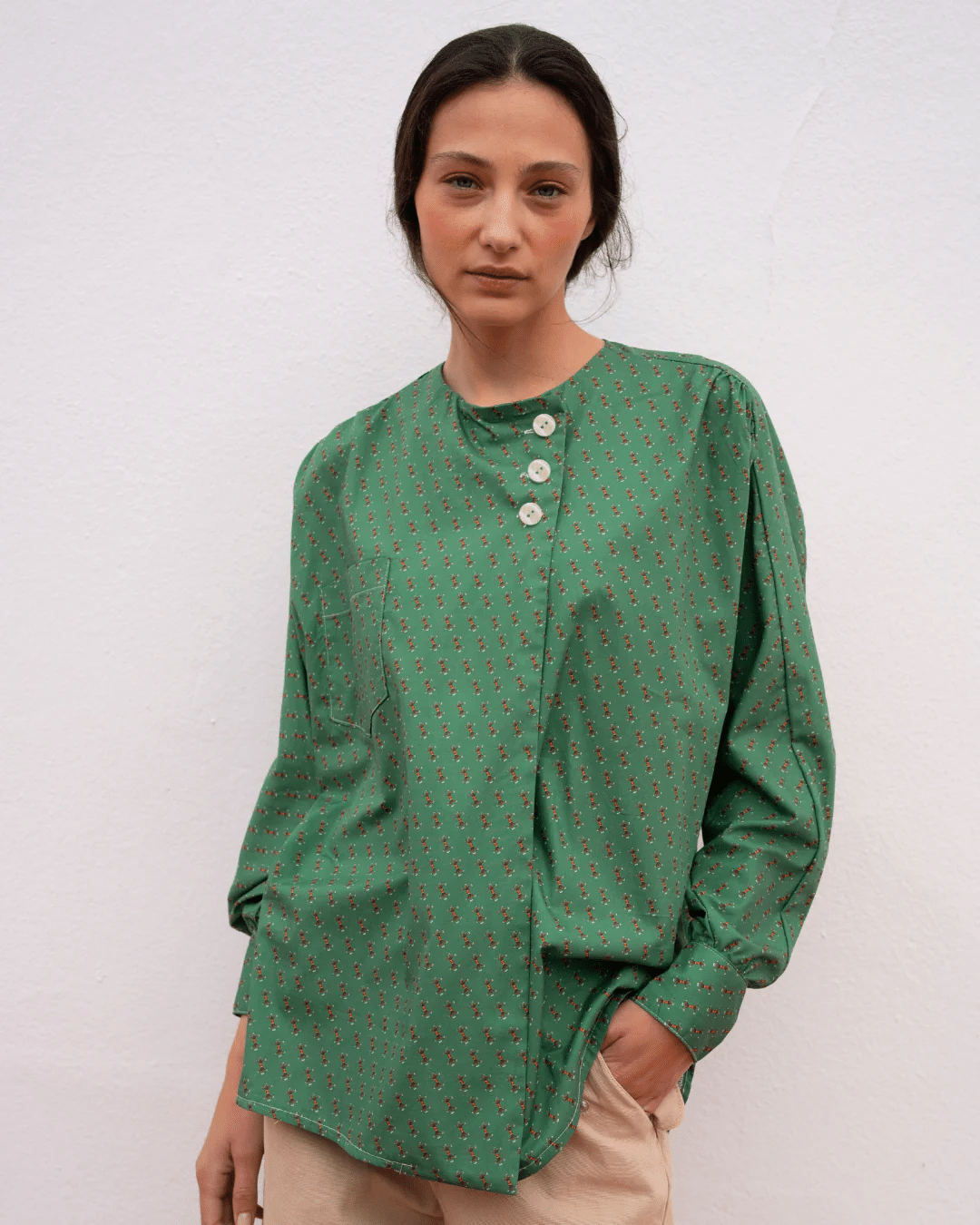 Camisa suelta y amplia con botonadura de tres botones. Diseñada para ofrecer un estilo relajado y moderno. Presenta una botonadura frontal en el pecho. Perfecta para usar sola o combinada con capas y accesorios. En tono verde con motivos de la colección Papyrus.