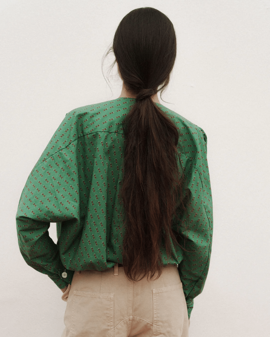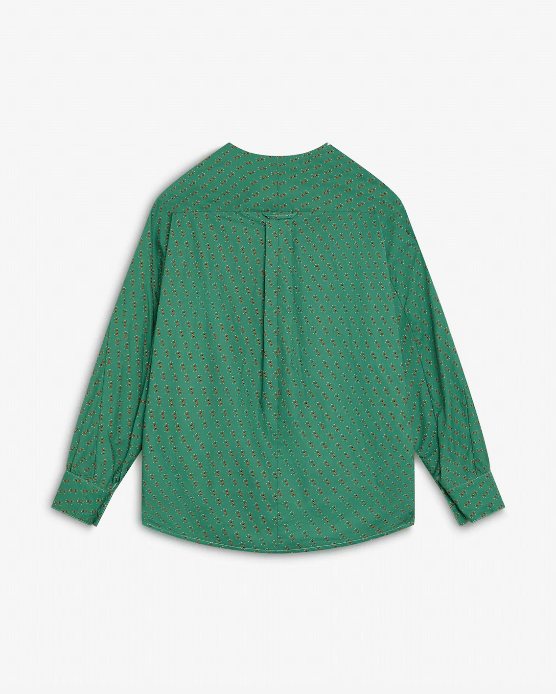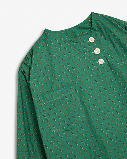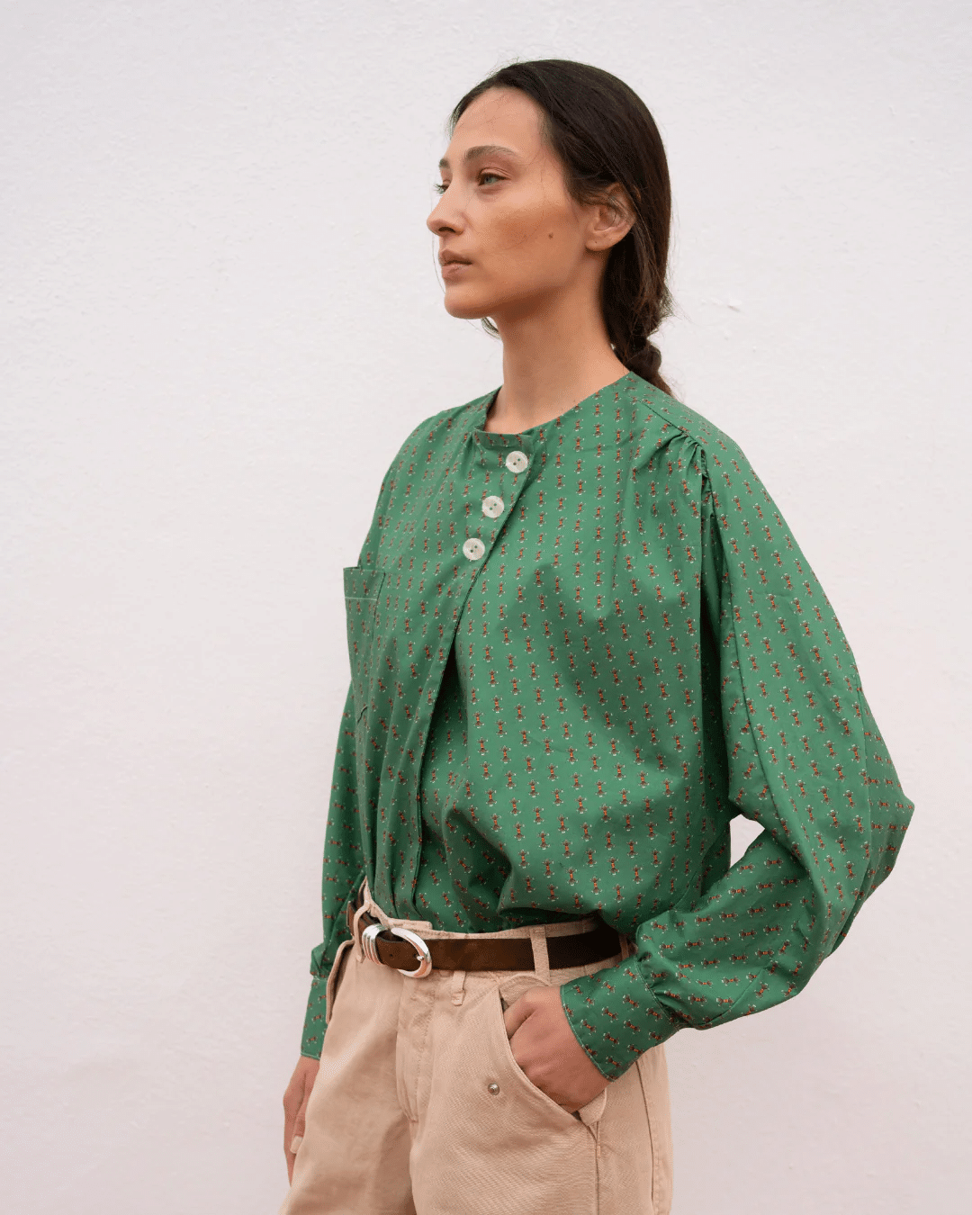 Camisa suelta y amplia con botonadura de tres botones. Diseñada para ofrecer un estilo relajado y moderno. Presenta una botonadura frontal en el pecho. Perfecta para usar sola o combinada con capas y accesorios. En tono verde con motivos de la colección Papyrus.