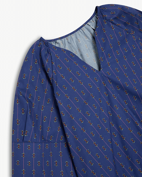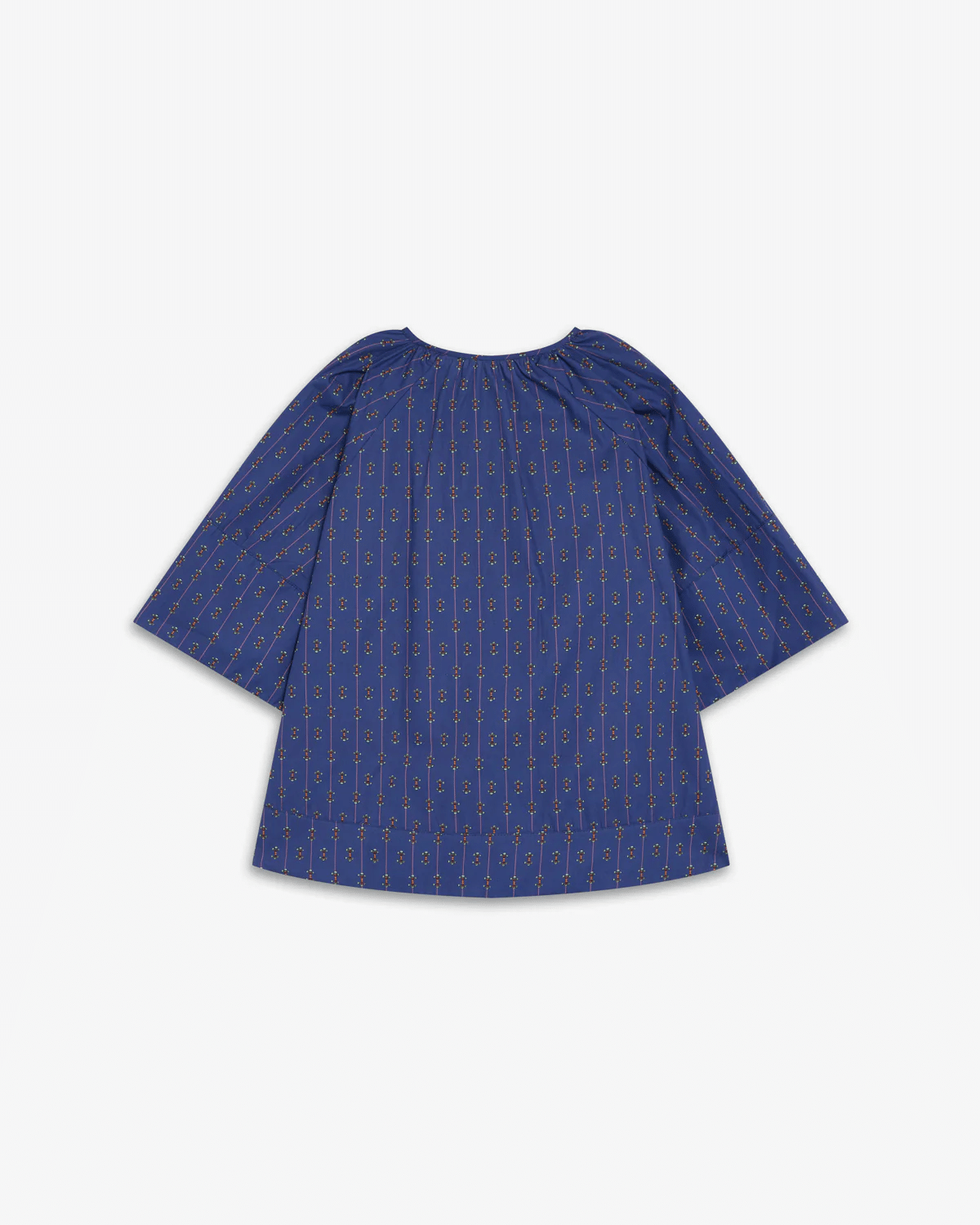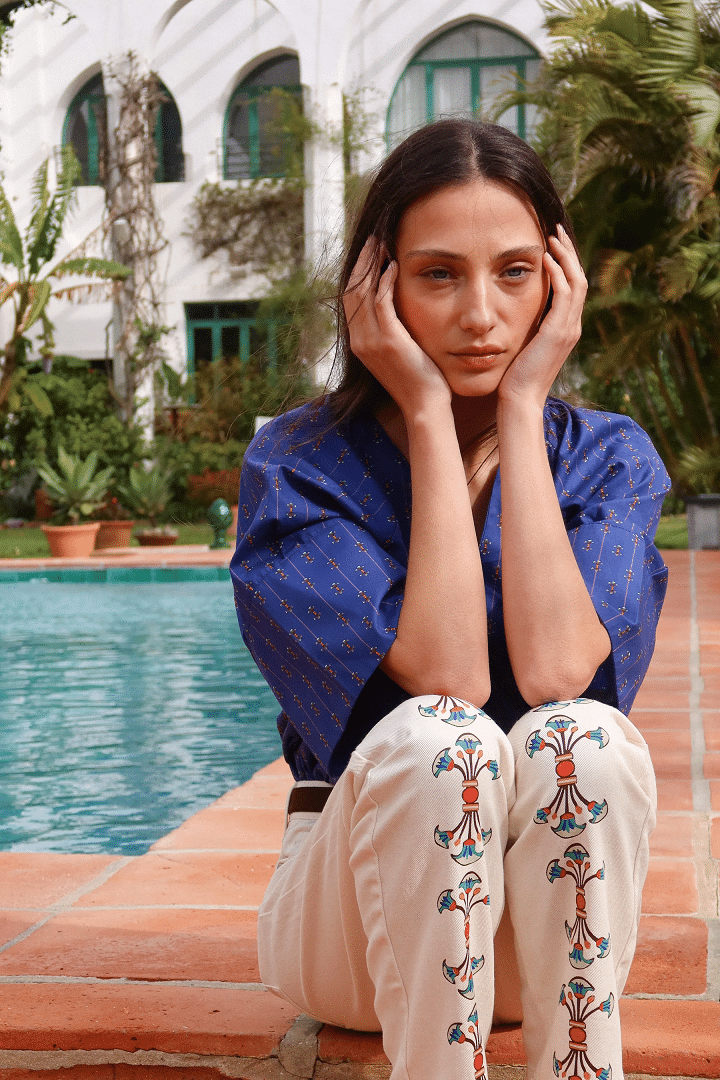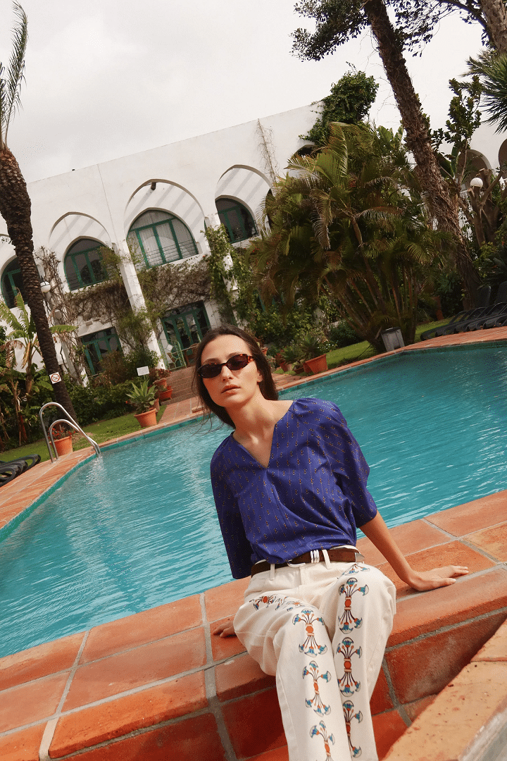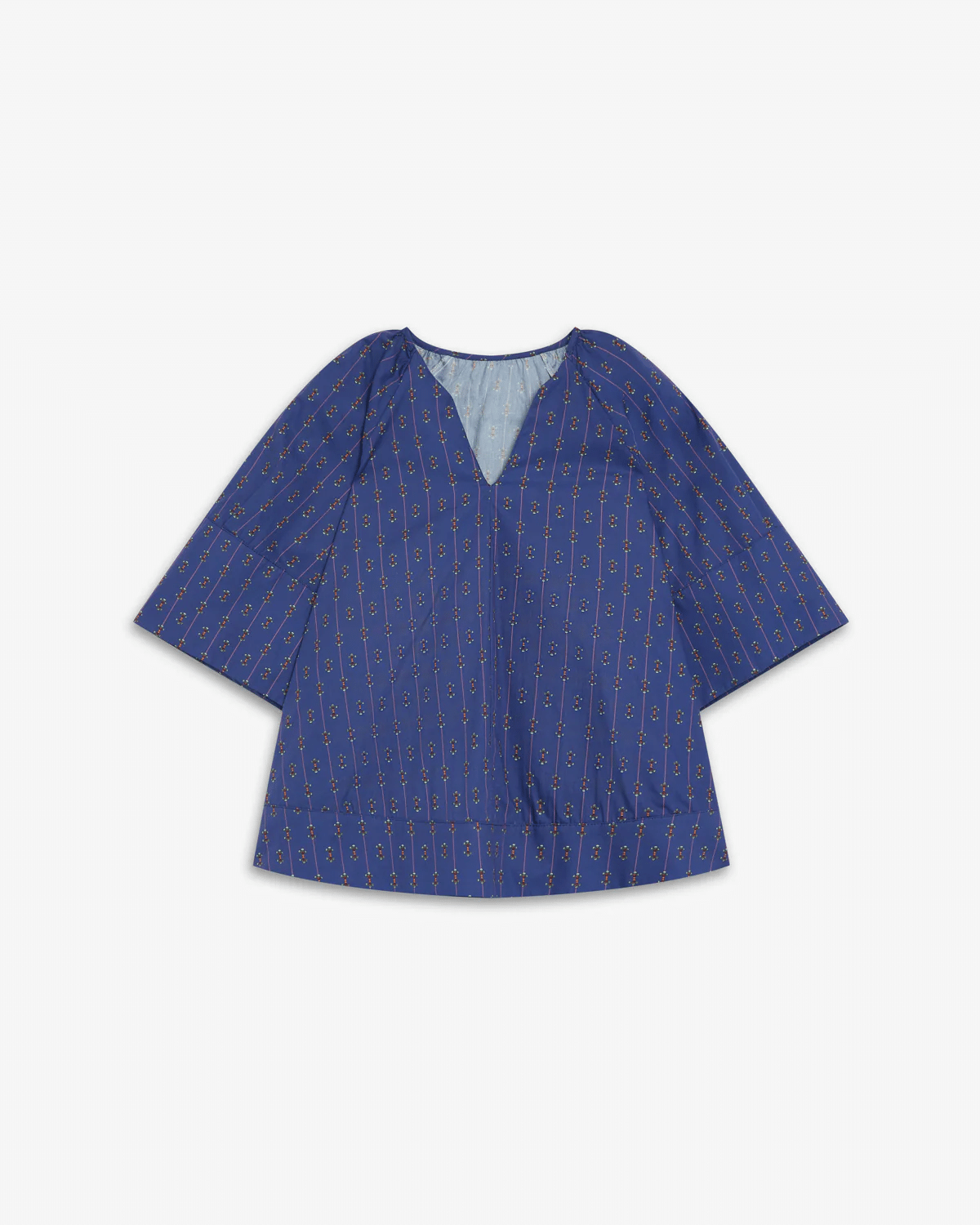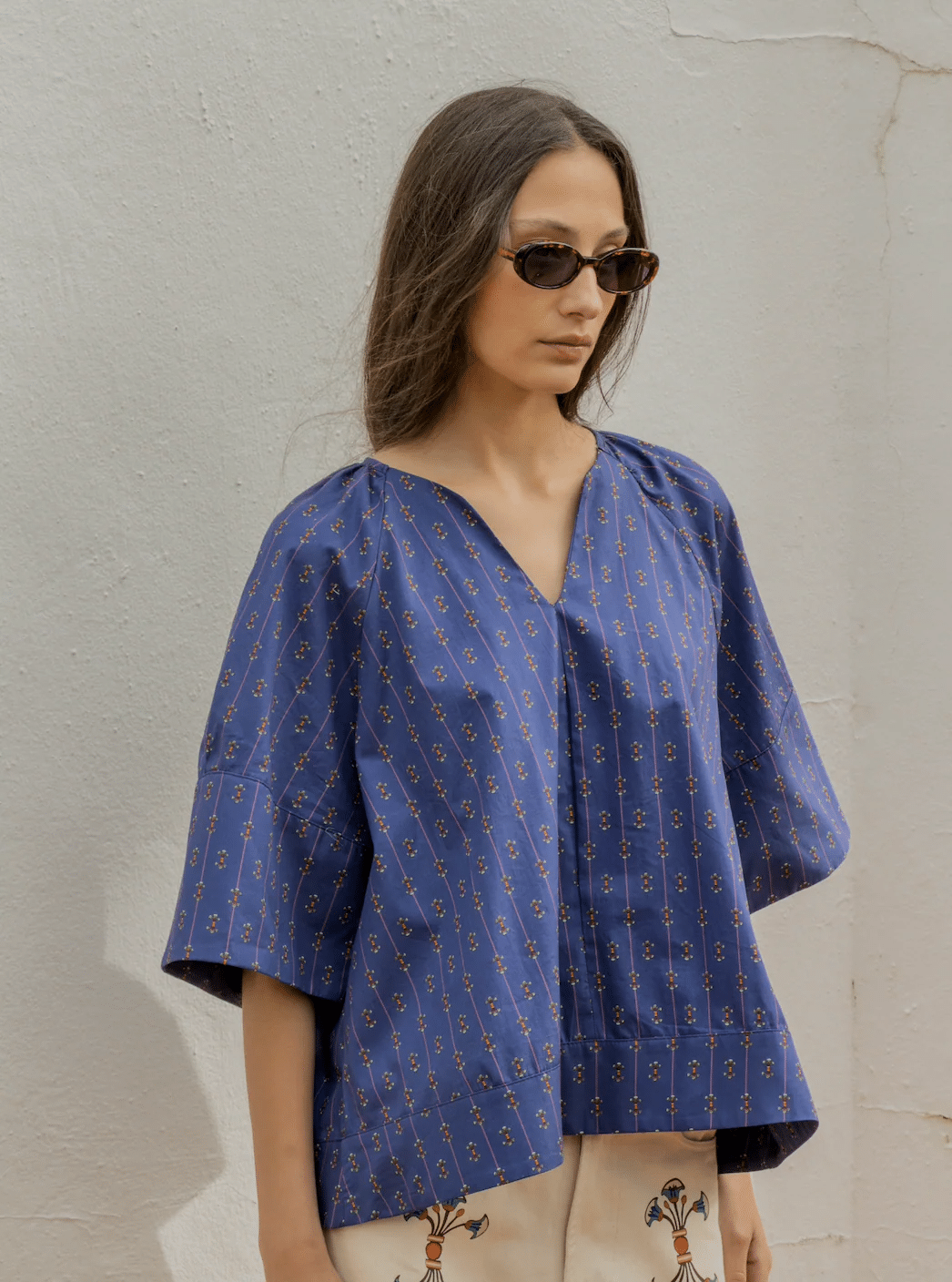 Blusa estampada crudo de manga media corta con escote pico. Confeccionada en un tono azul con estampado exclusivo, uno de los motivos estrella de la colección Papyrus. Su escote en pico aporta un toque femenino y elegante, mientras que el corte ancho y corto garantiza comodidad y versatilidad para combinar con pantalones, faldas o shorts.