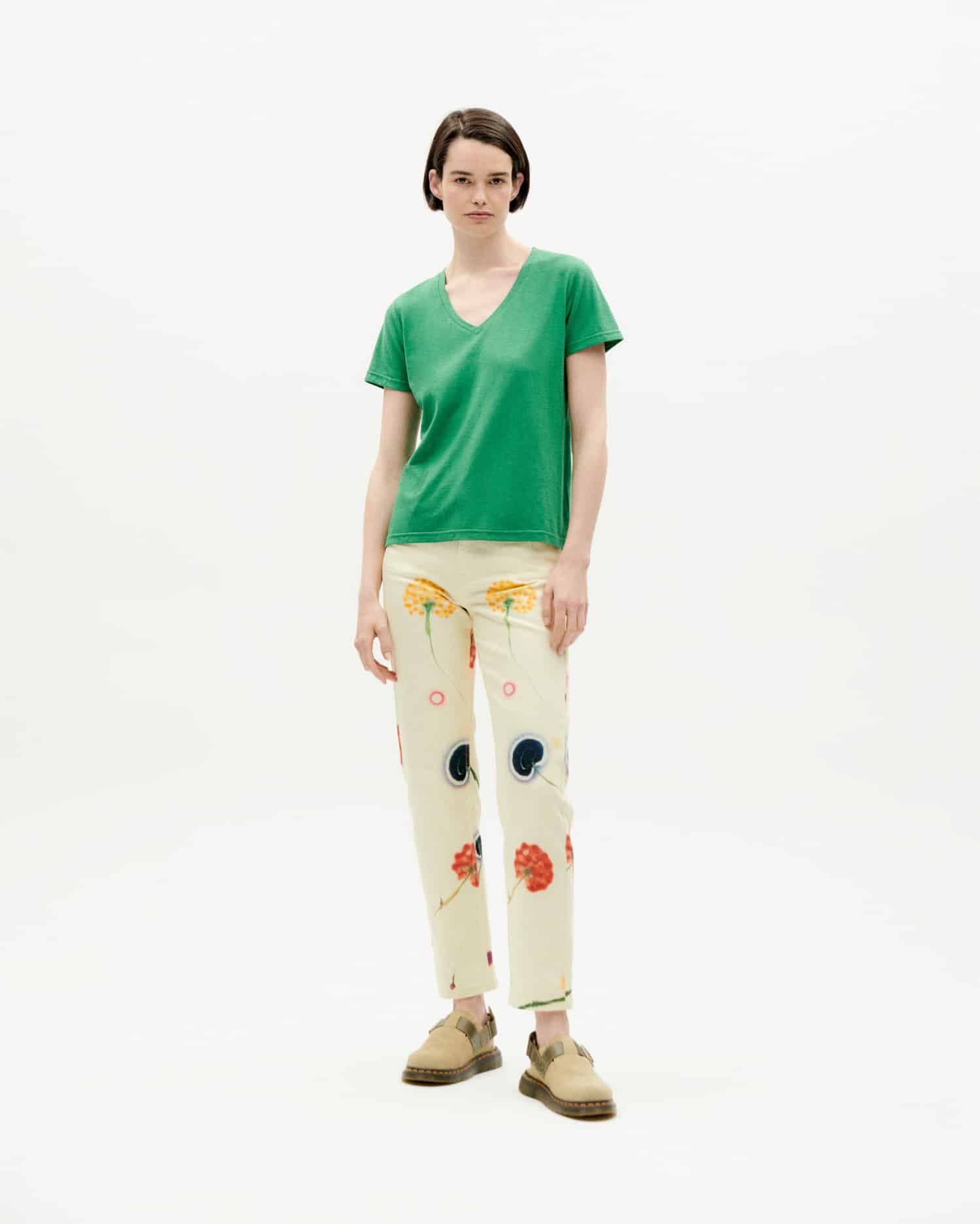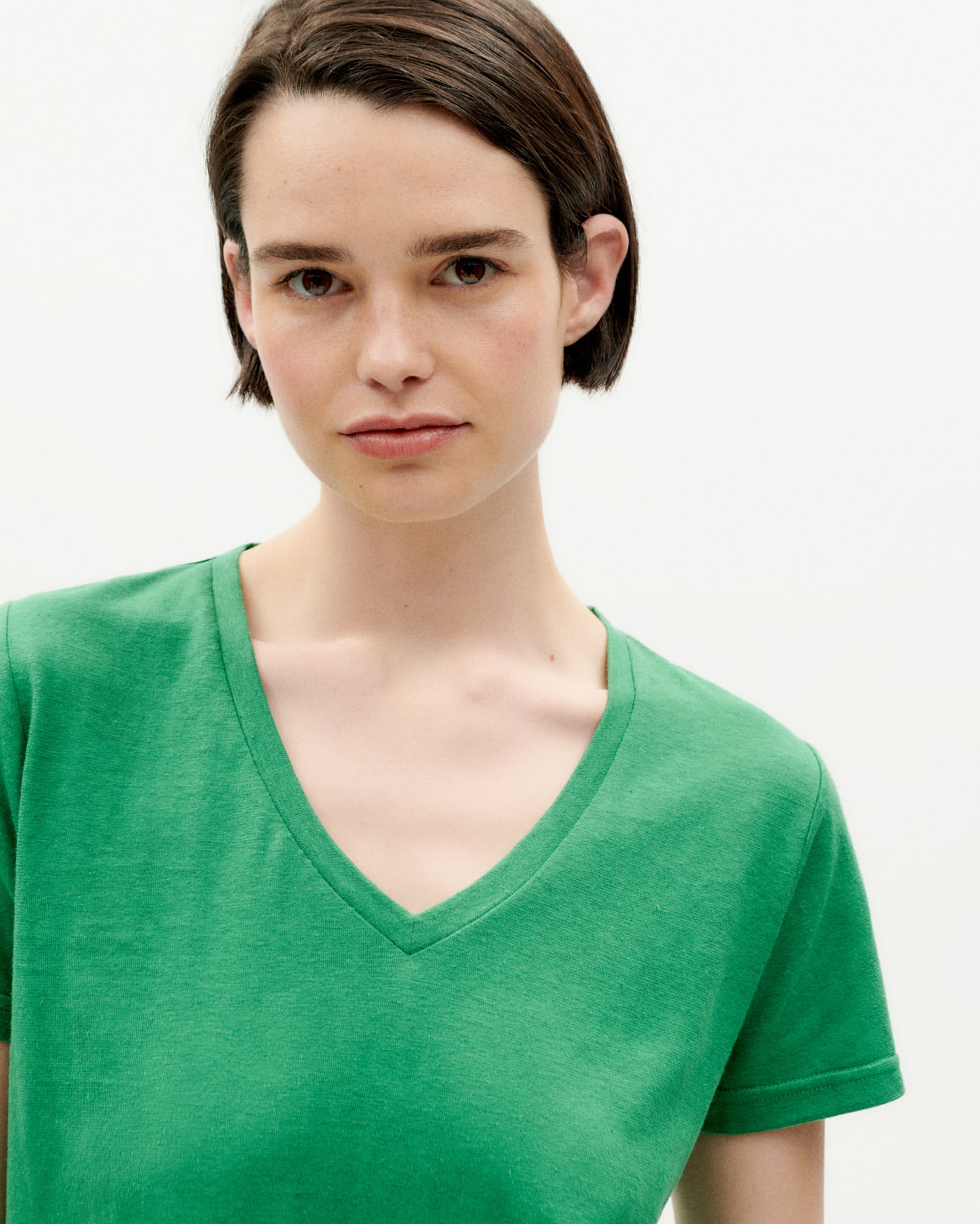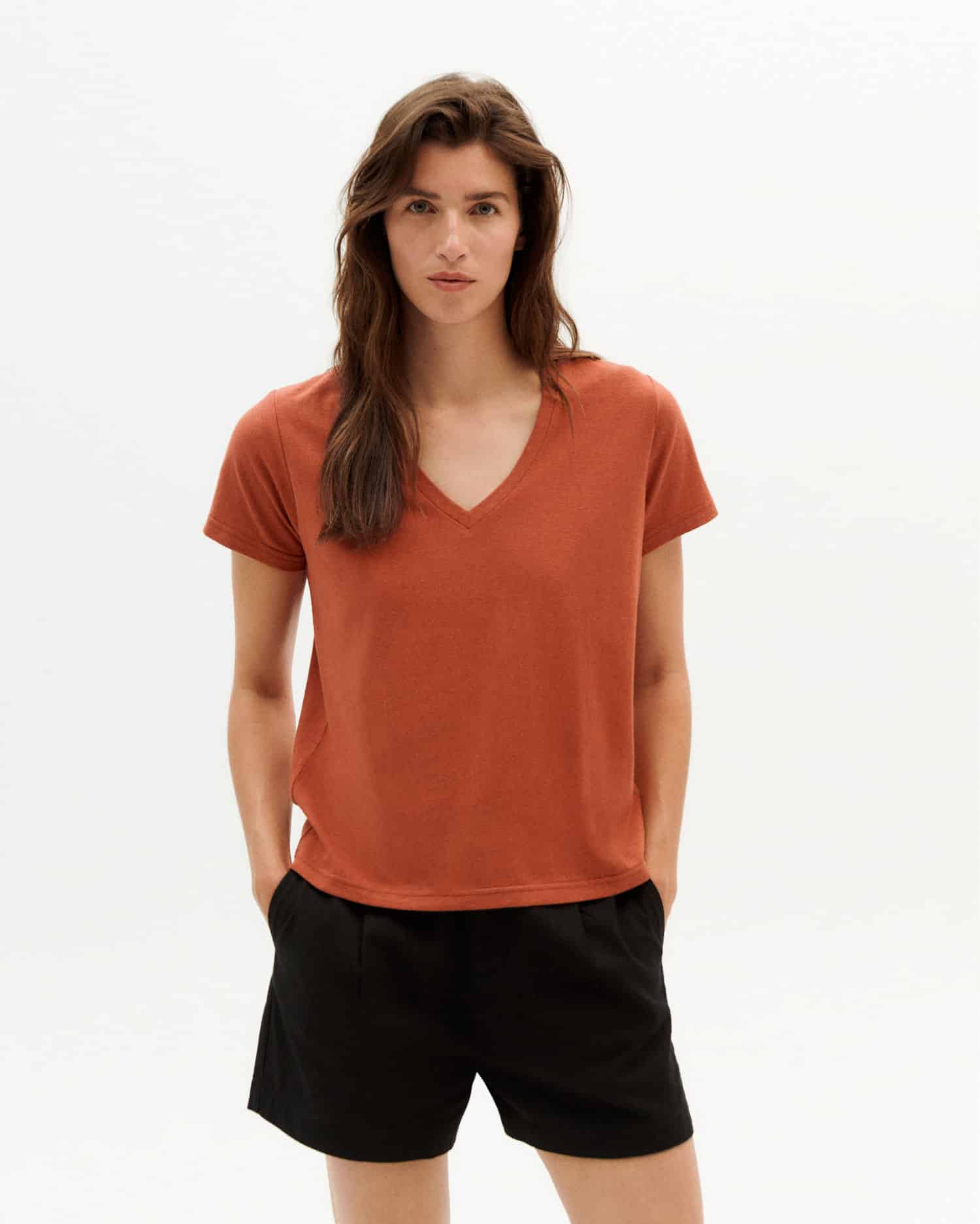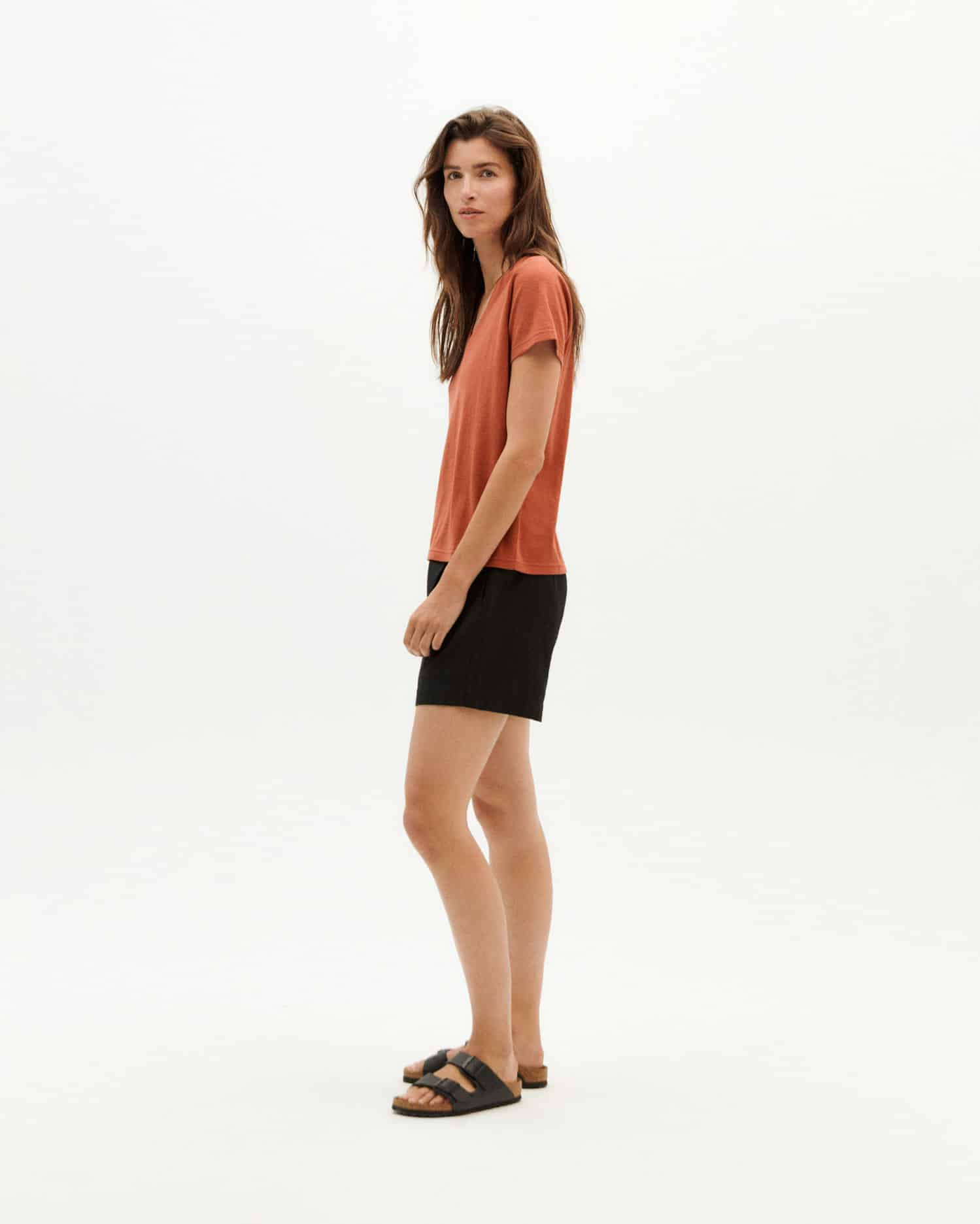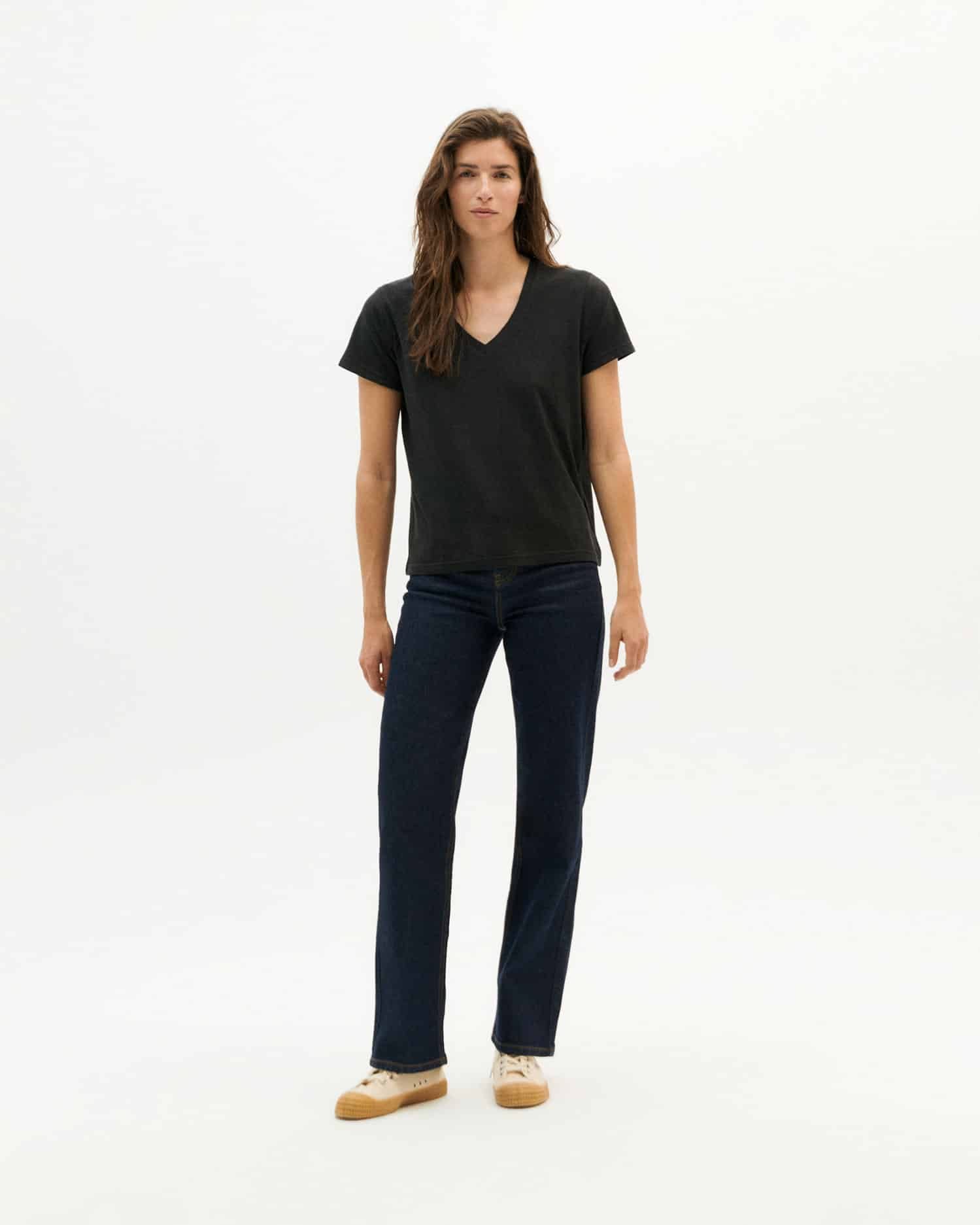 CAMISETA DE MANGA CORTA CON ESCOTE PICO Y CORTE RECTO. EL LARGO DE LA PRENDA ES REGULAR.