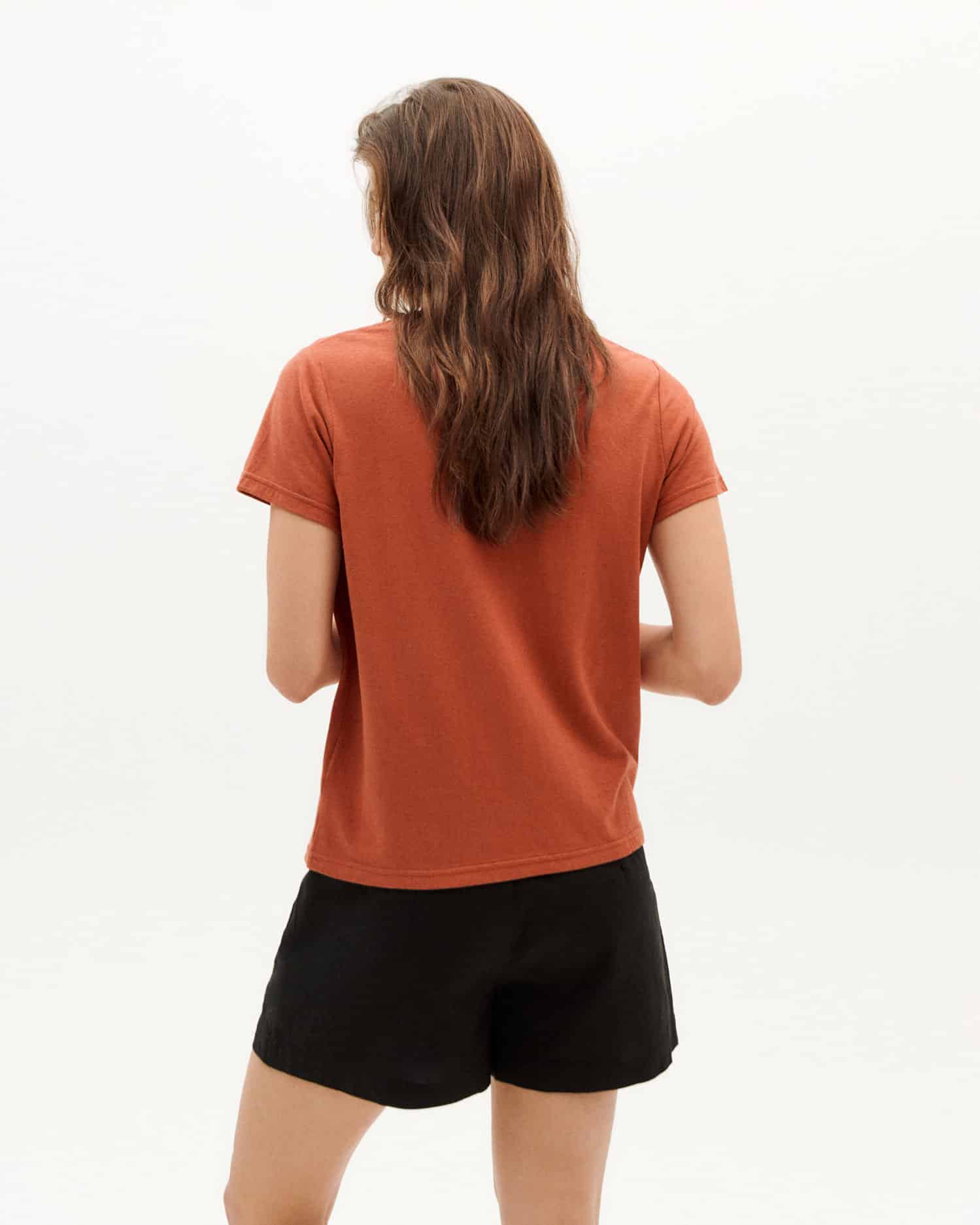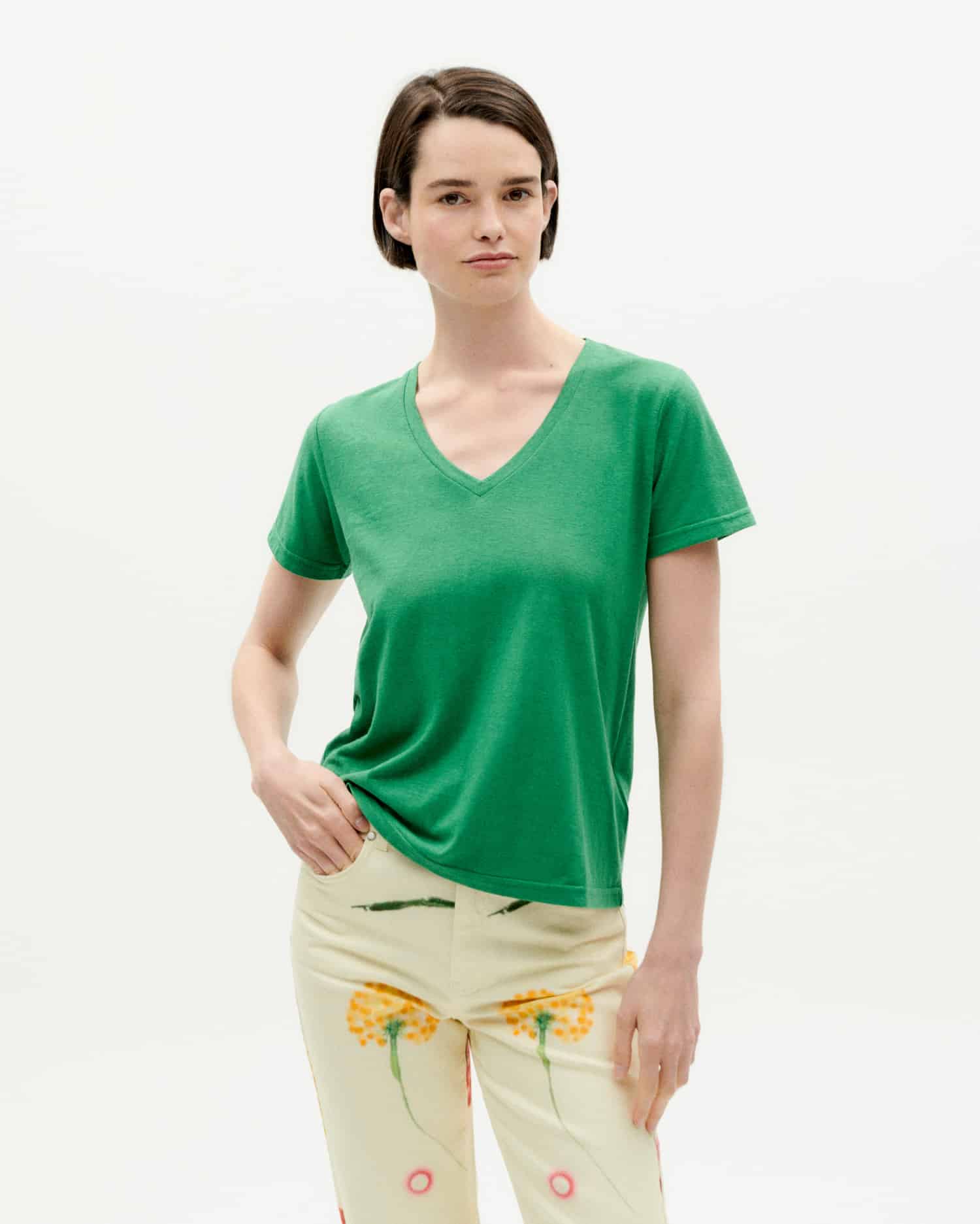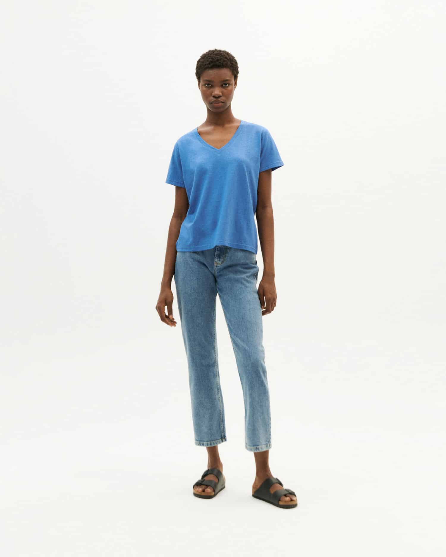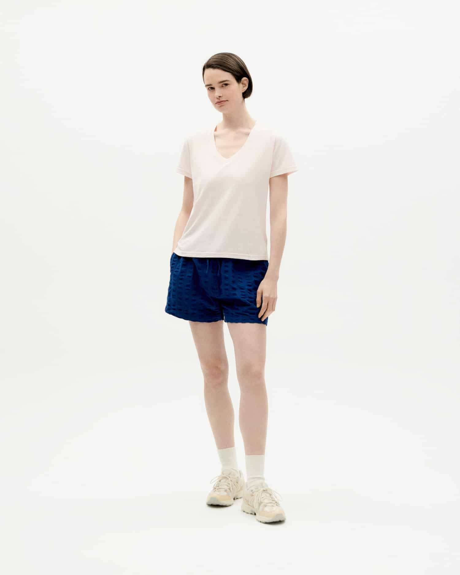 CAMISETA DE MANGA CORTA CON ESCOTE PICO Y CORTE RECTO. EL LARGO DE LA PRENDA ES REGULAR.
