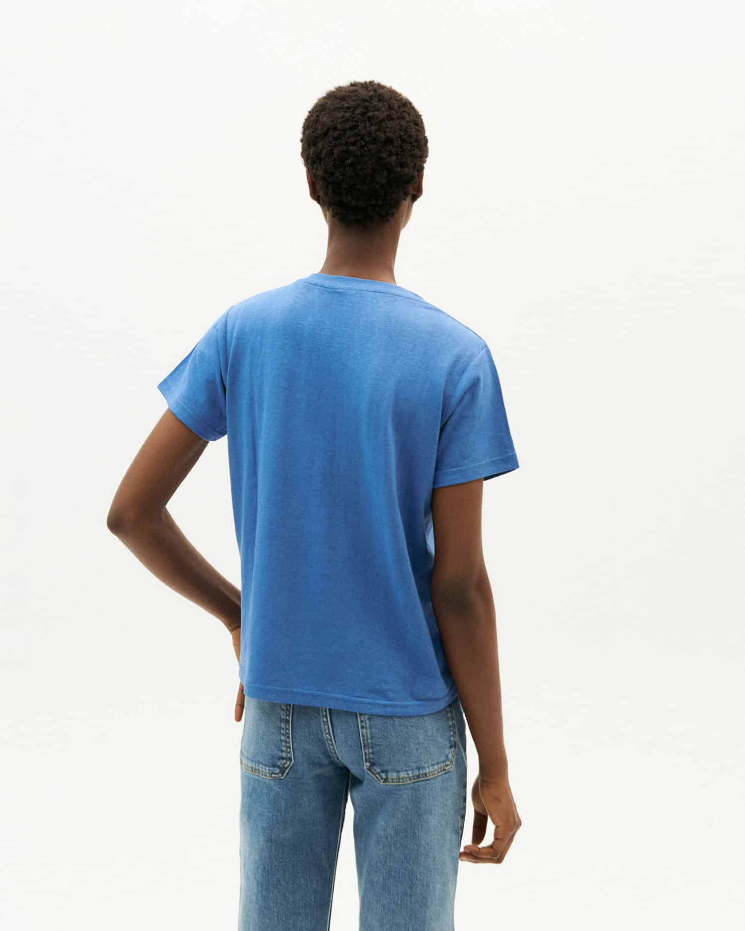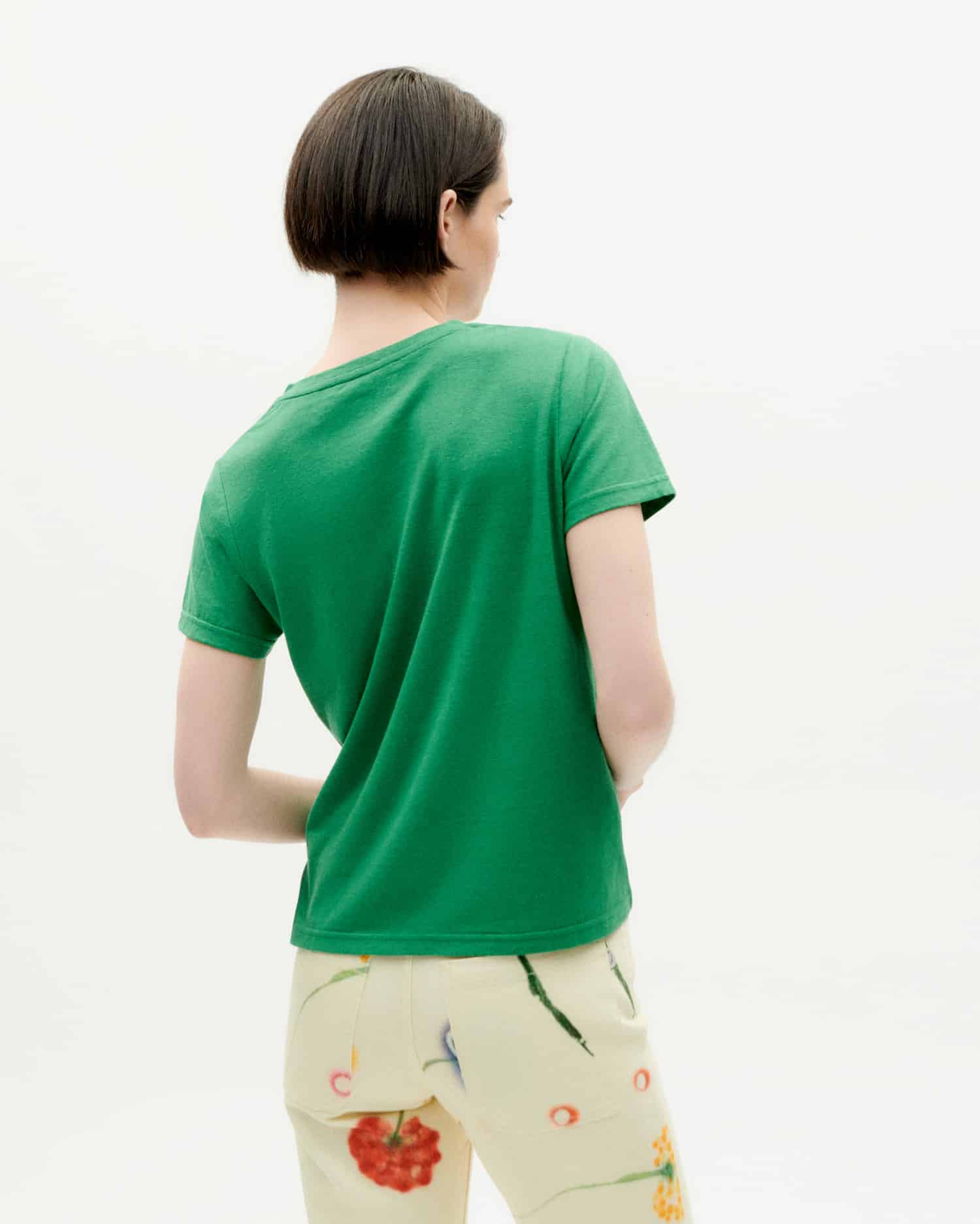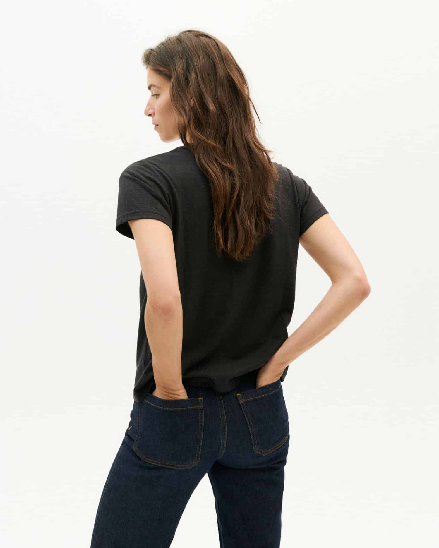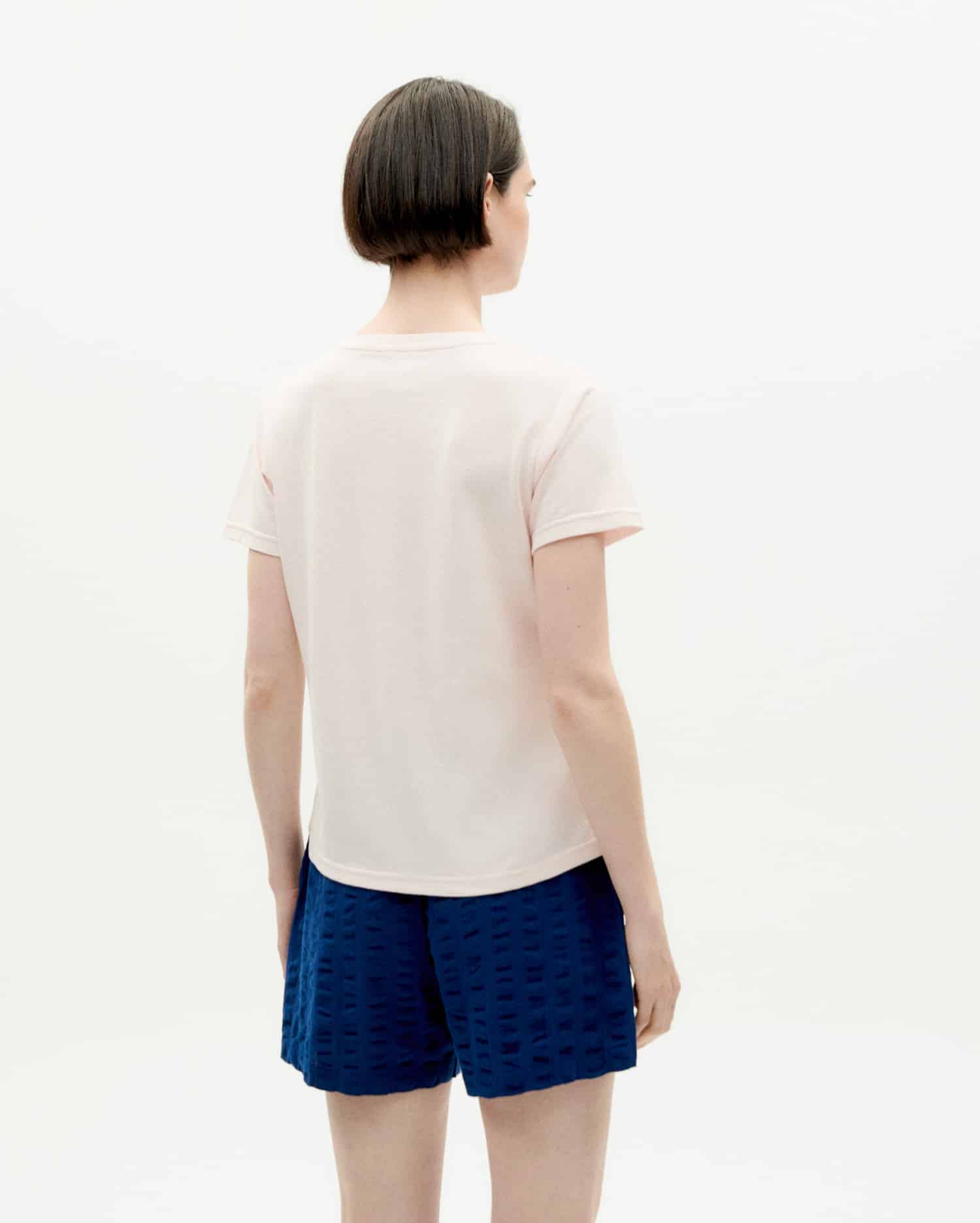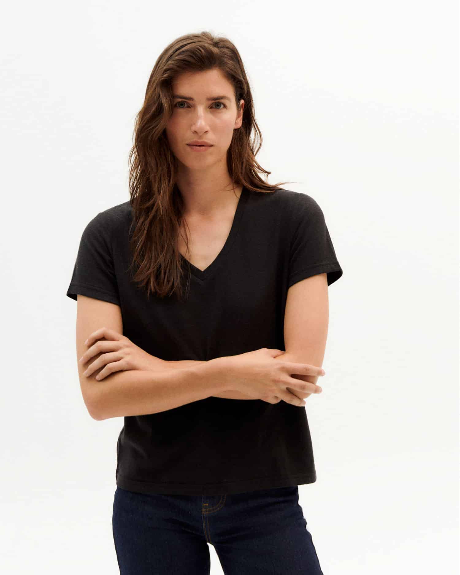 CAMISETA DE MANGA CORTA CON ESCOTE PICO Y CORTE RECTO. EL LARGO DE LA PRENDA ES REGULAR.