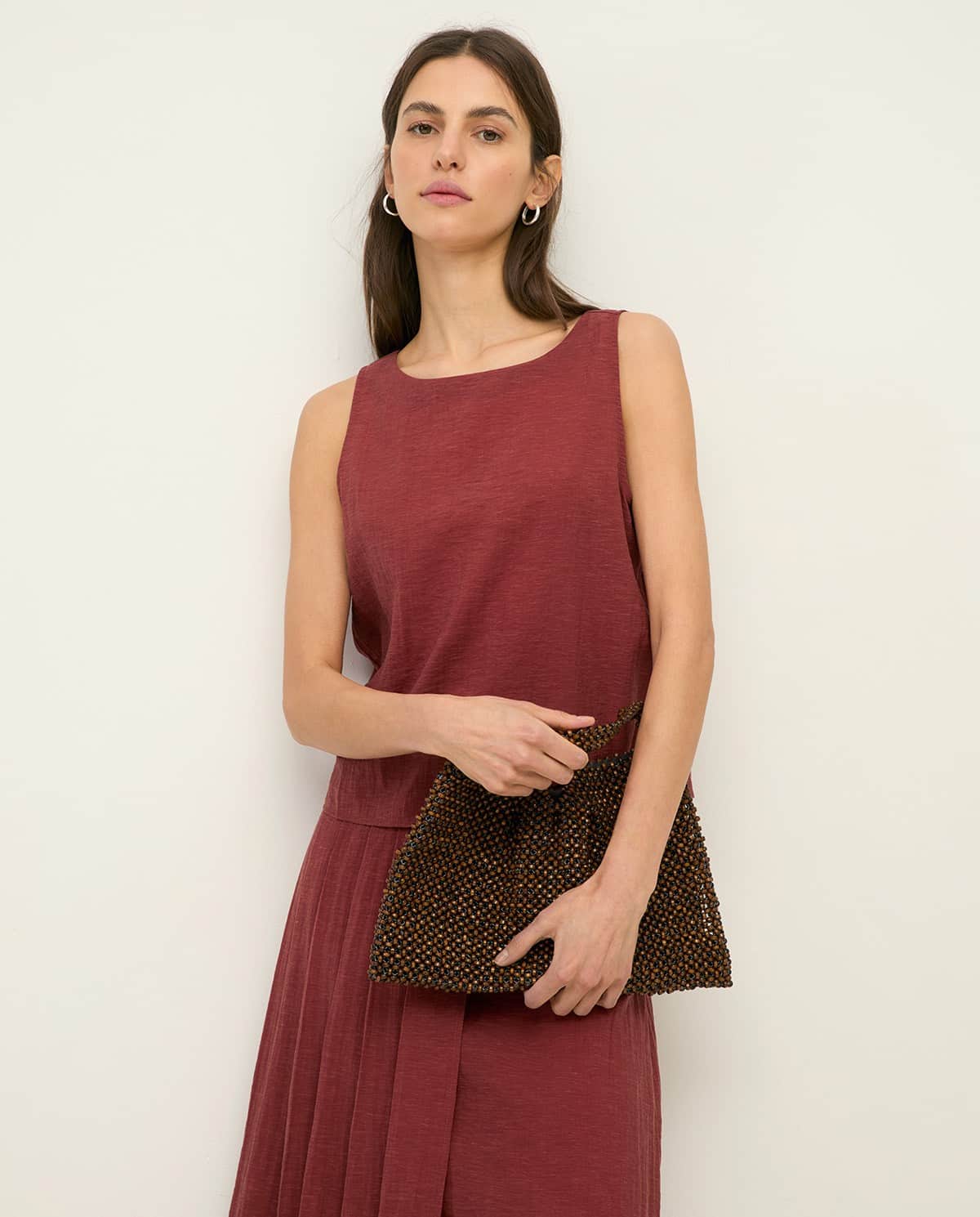 Top en color terracota. Tejido con textura. Regular fit. Cuello barco. Sin mangas. Abertura lateral en bajo. Longitud desde el hombro 55 cm, talla S.