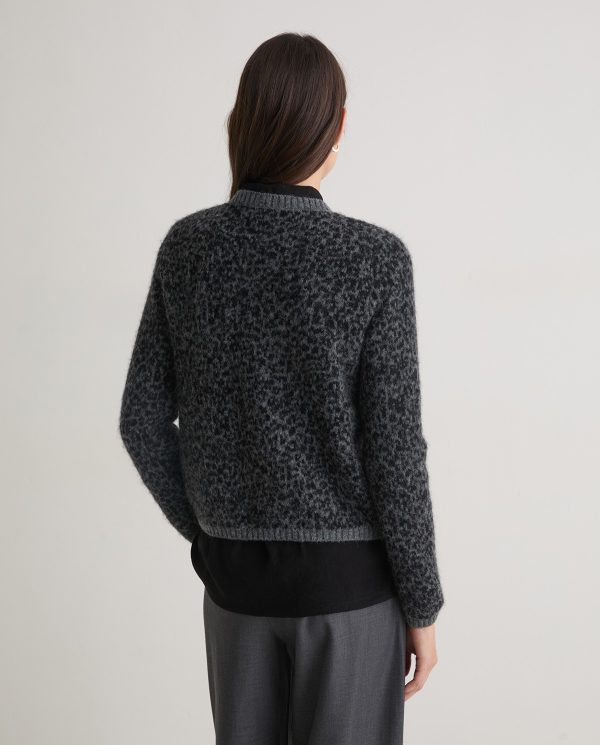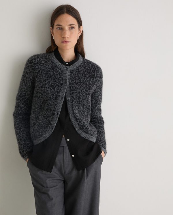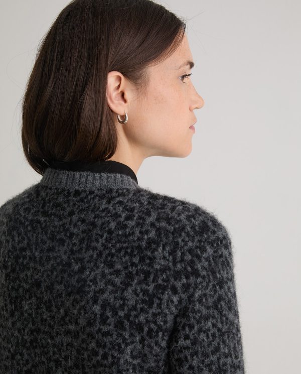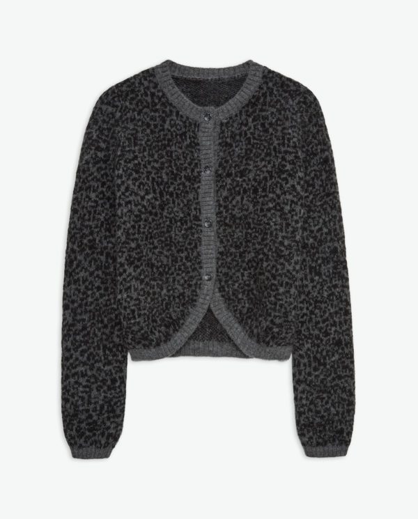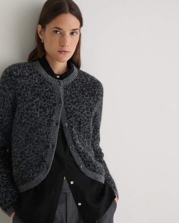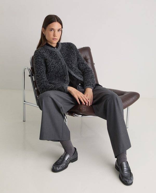 Cárdigan estampado animal print. Tejido mezcla de lana y alpaca. Regular fit con acabado frontal redondeado. Cuello redondo. Manga larga. Cierre frontal con botones. Acabados canalé en contraste.
