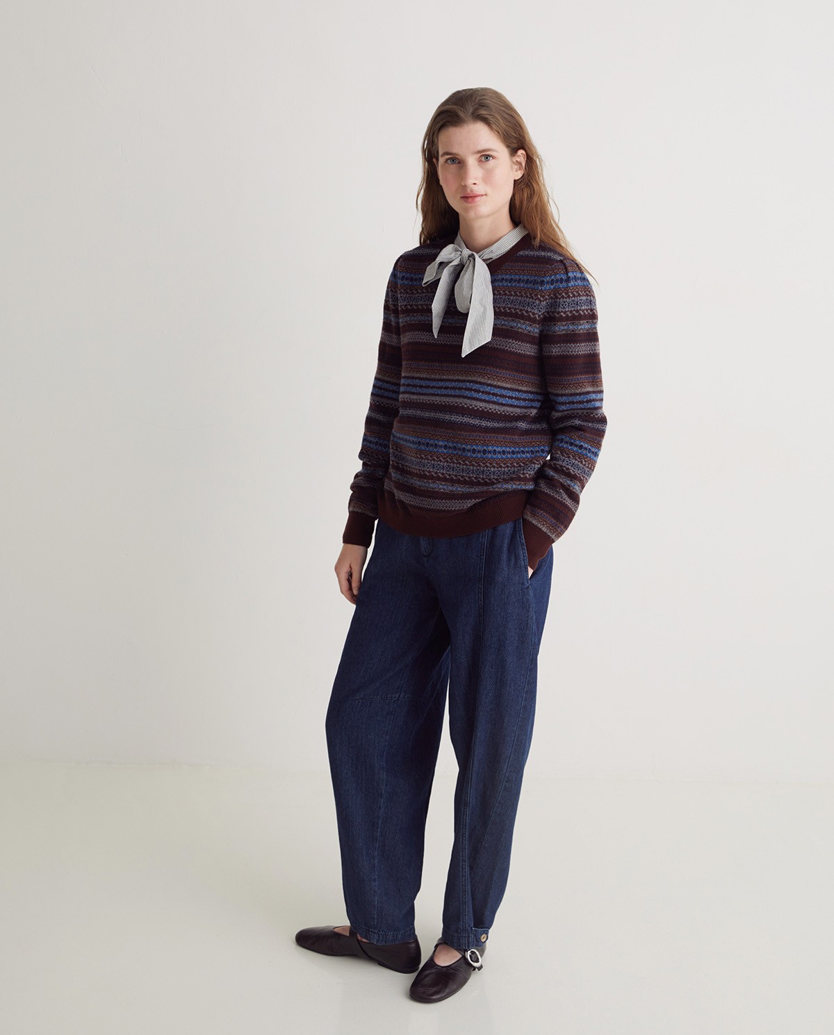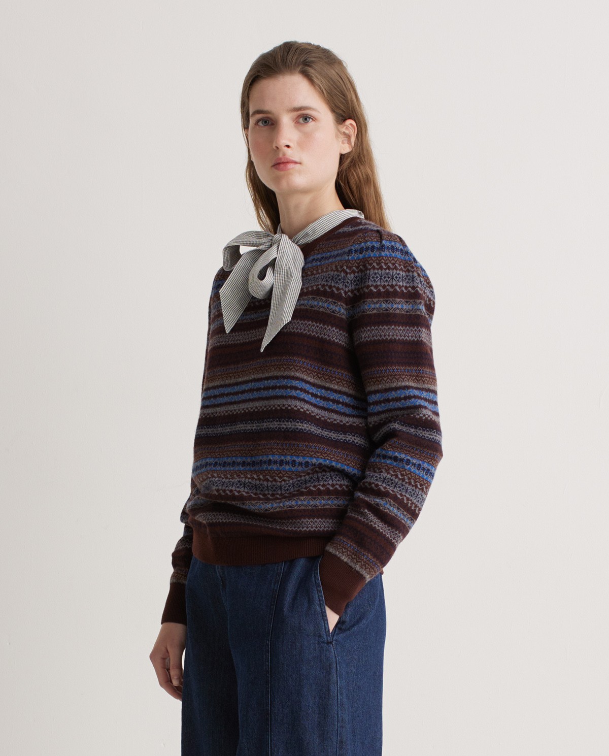 Jersey jacquard. Tejido mezcla de lana y viscosa. Diseño estampado. Cuello redondo. Manga larga. Acabados en canalé.