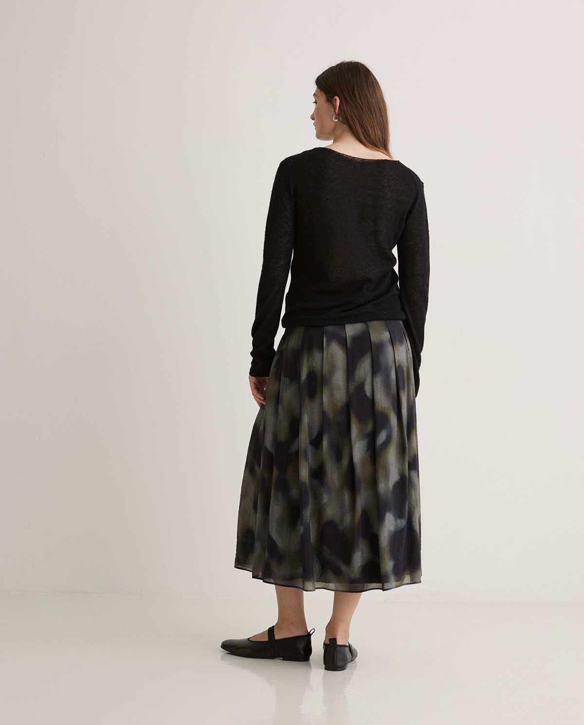 Falda midi. Confeccionada con viscosa. Con forro. Estampado multicolor. Diseño evasé. Cierre con cremallera lateral. Detalle pliegues.