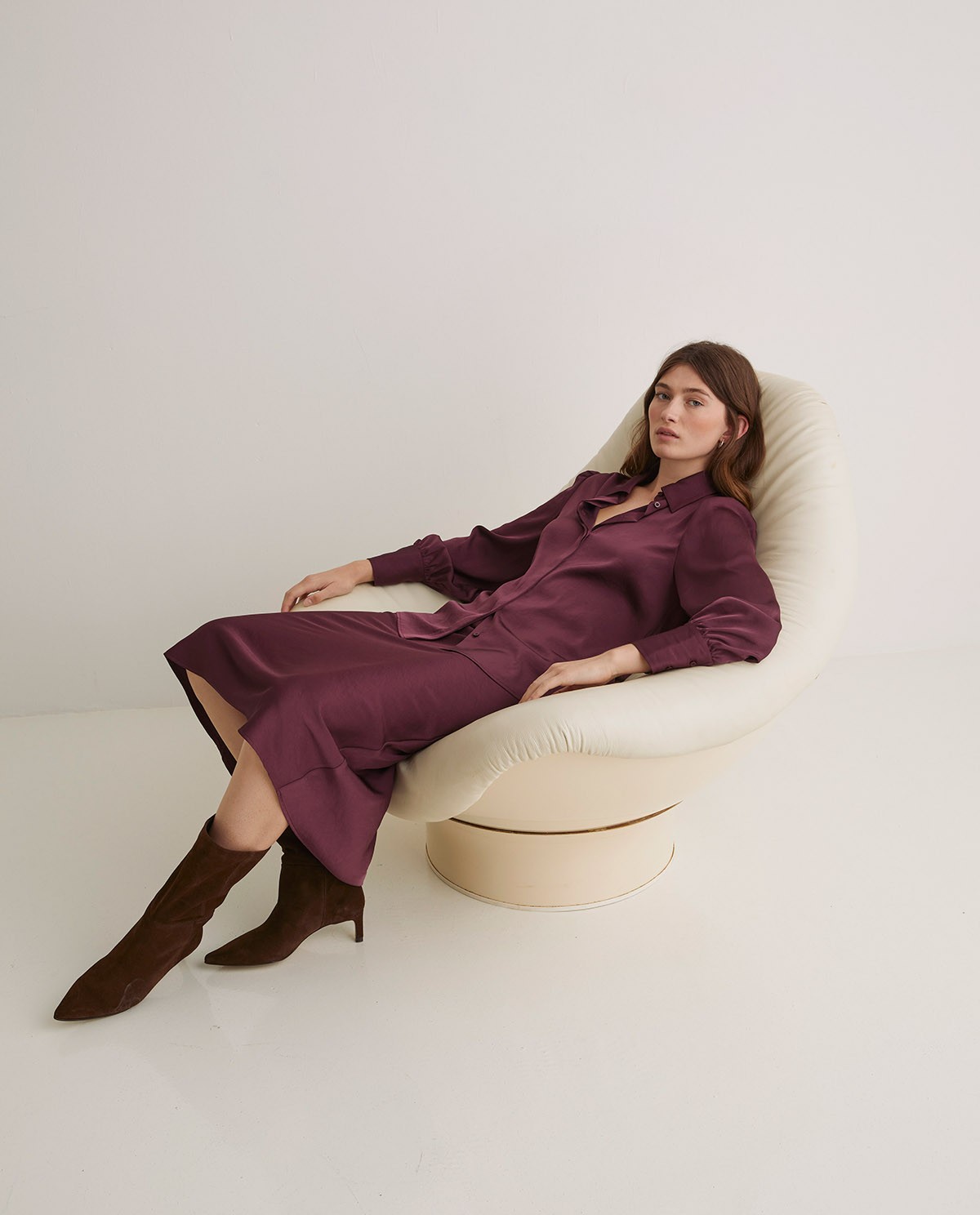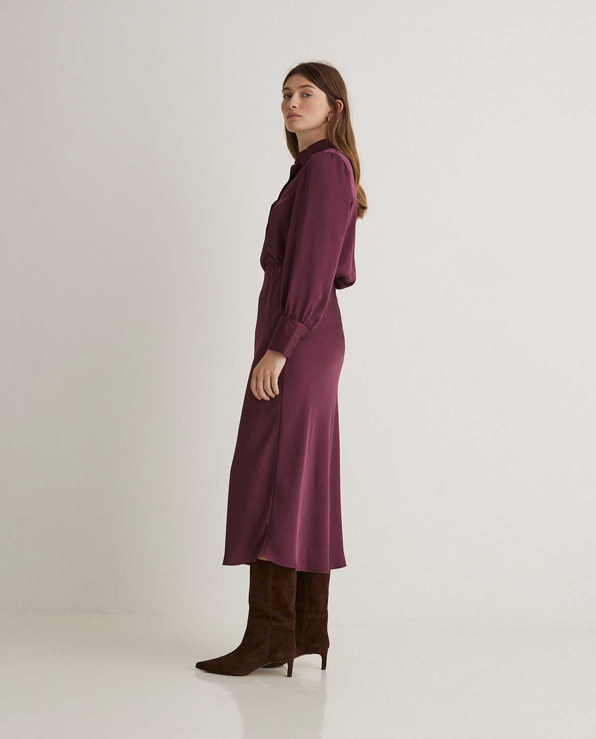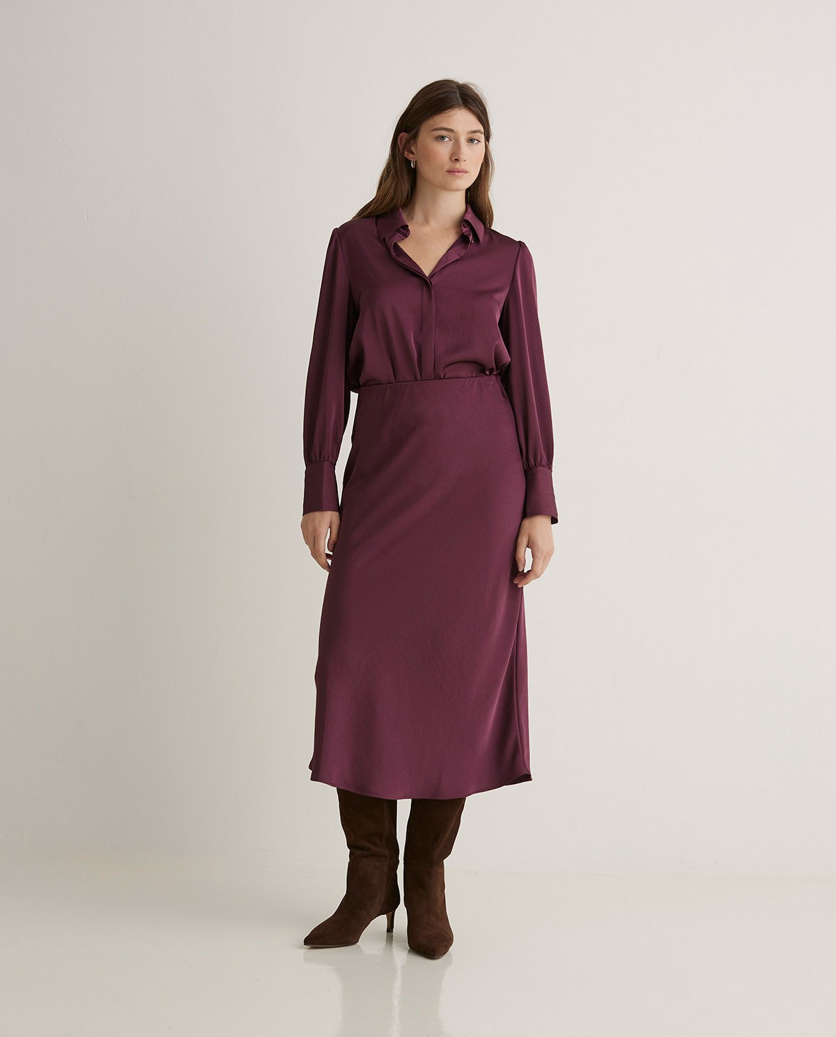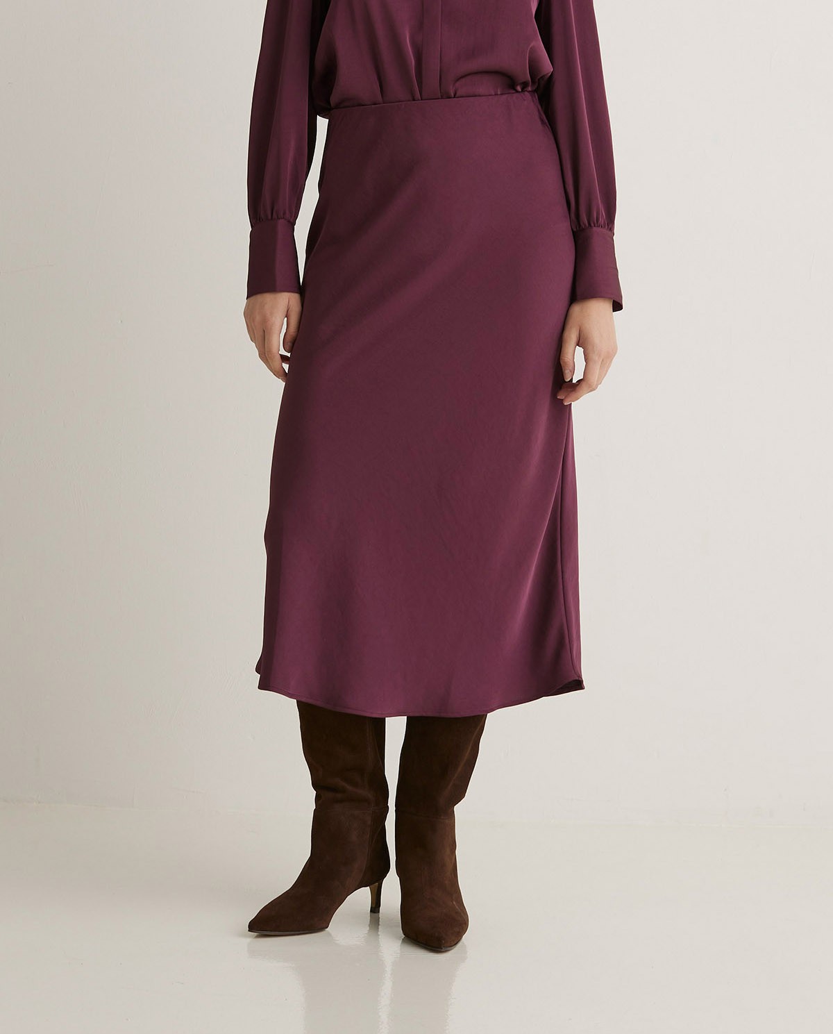 Falda fluida midi. Tejido satinado. Sin cierre. Goma elástica en la cintura.