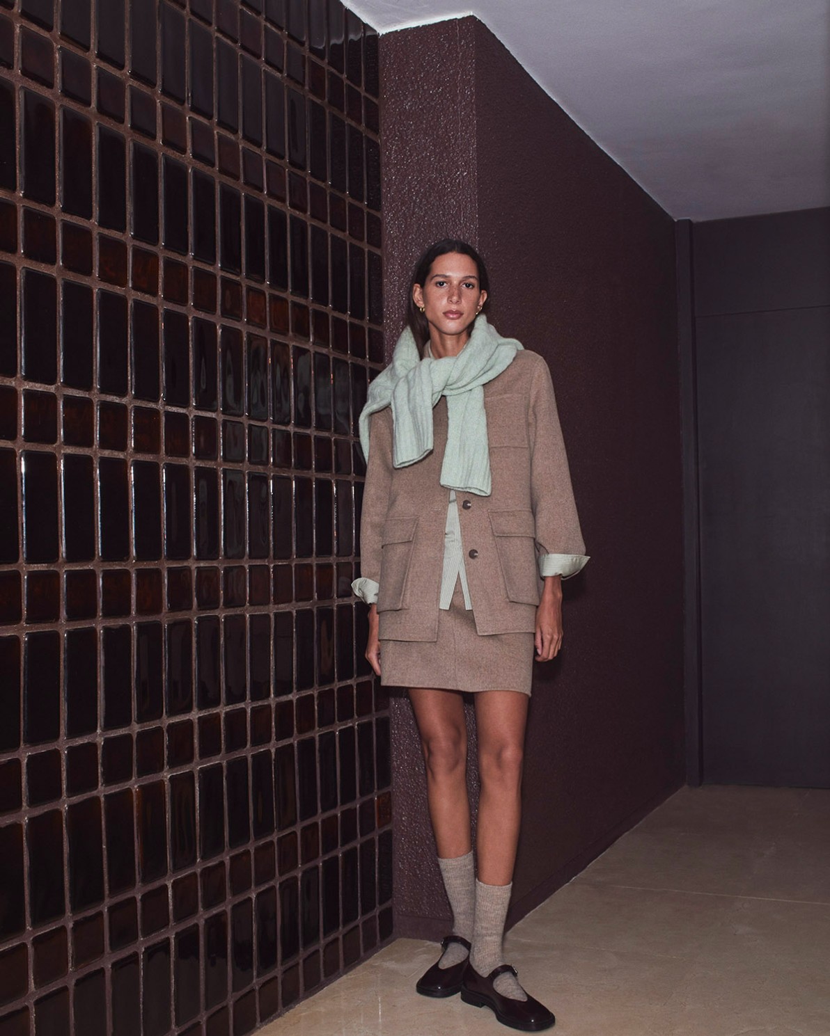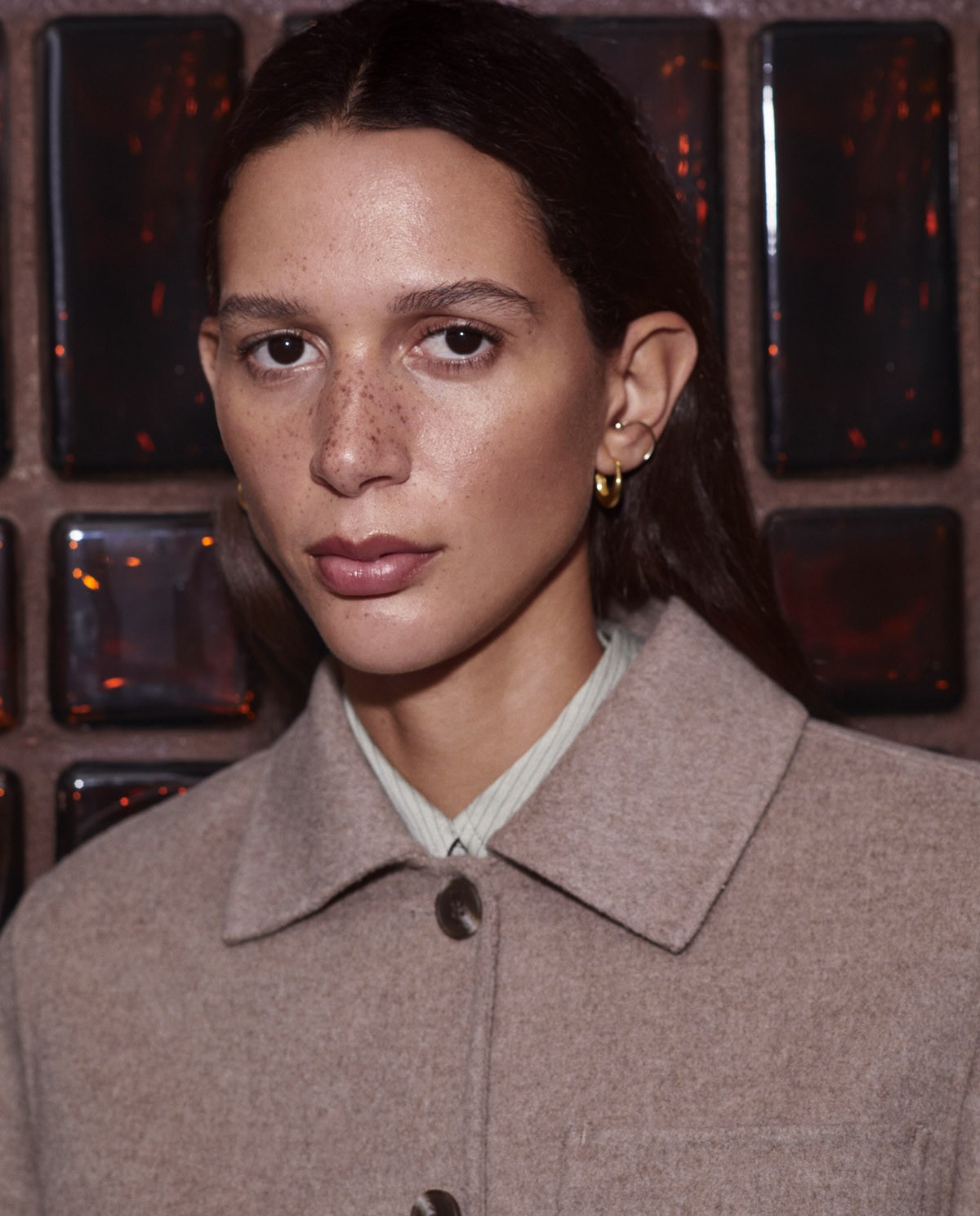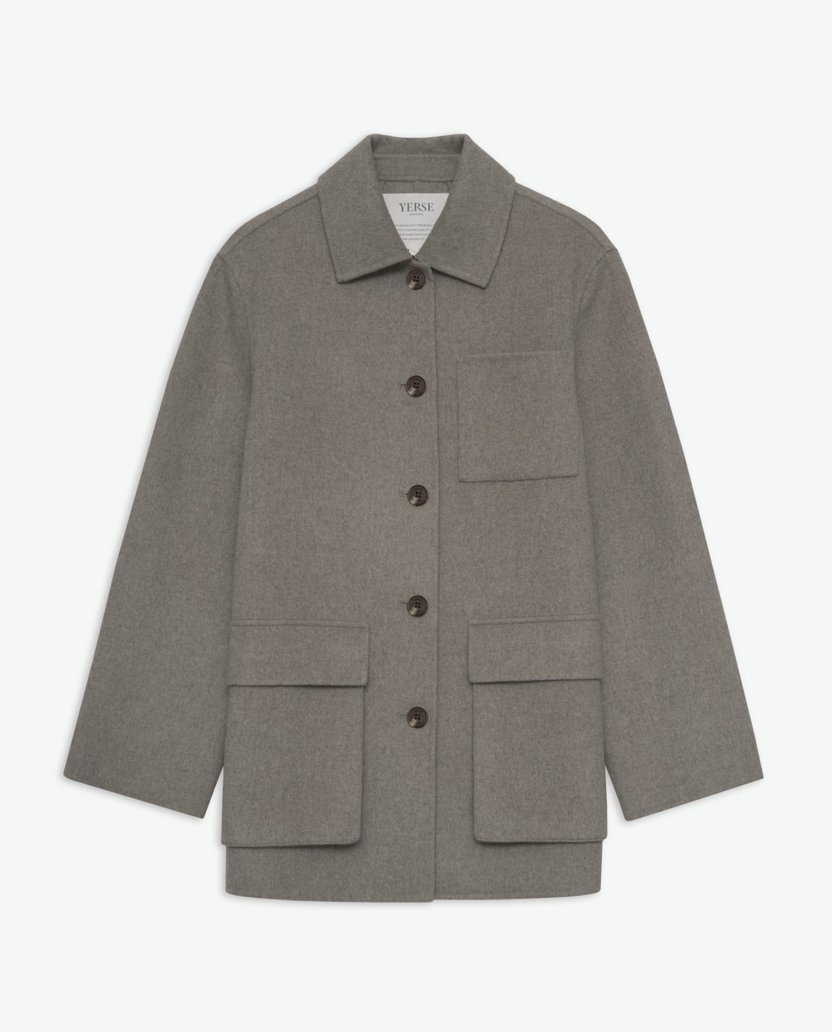 Abrigo corto handmade. Regular fit. Tejido doble faz, mezcla de lana con fibras recicladas. Cuello camisero. Manga larga. Cierre frontal con botones. Dos bolsillos frontales con solapa y un bolsillo de plastrón en el pecho.