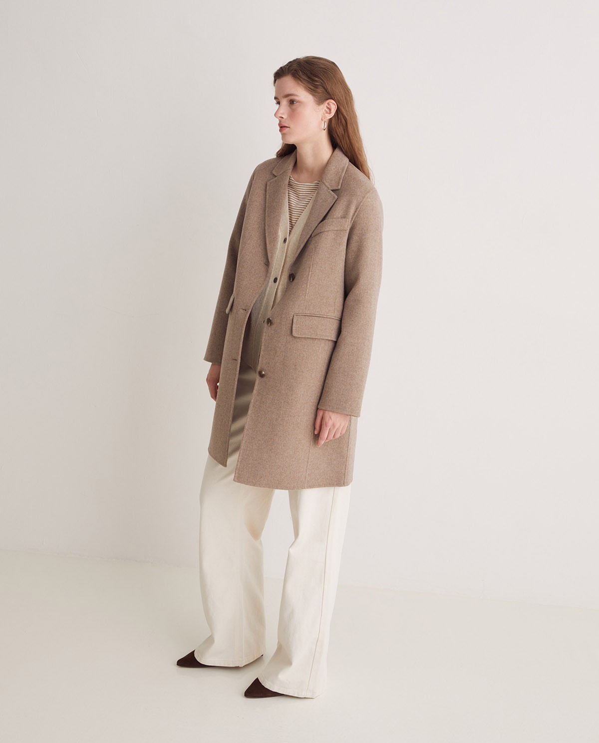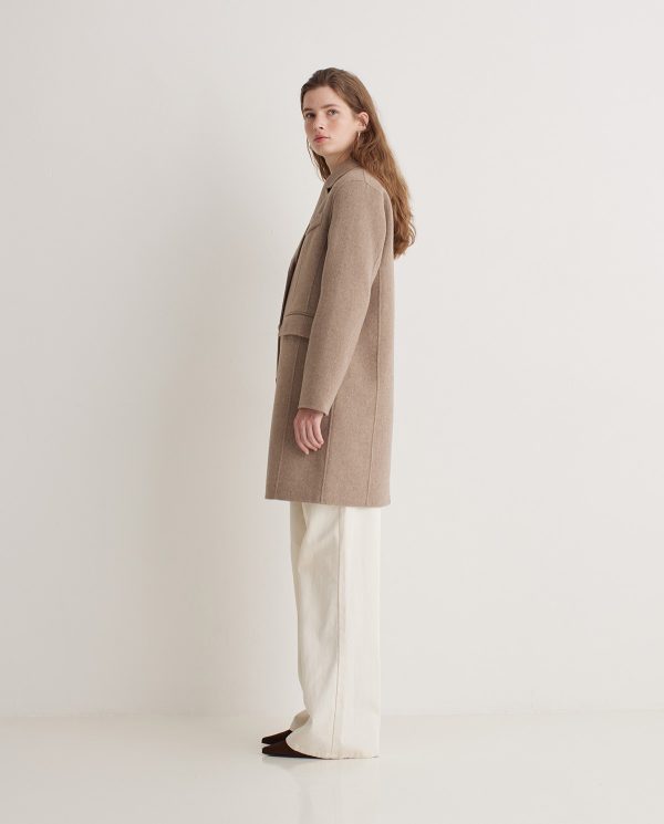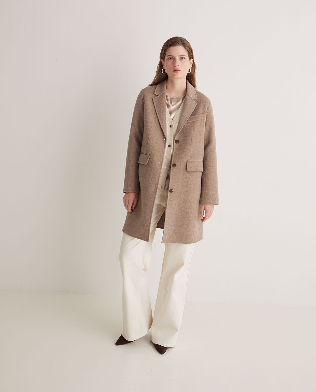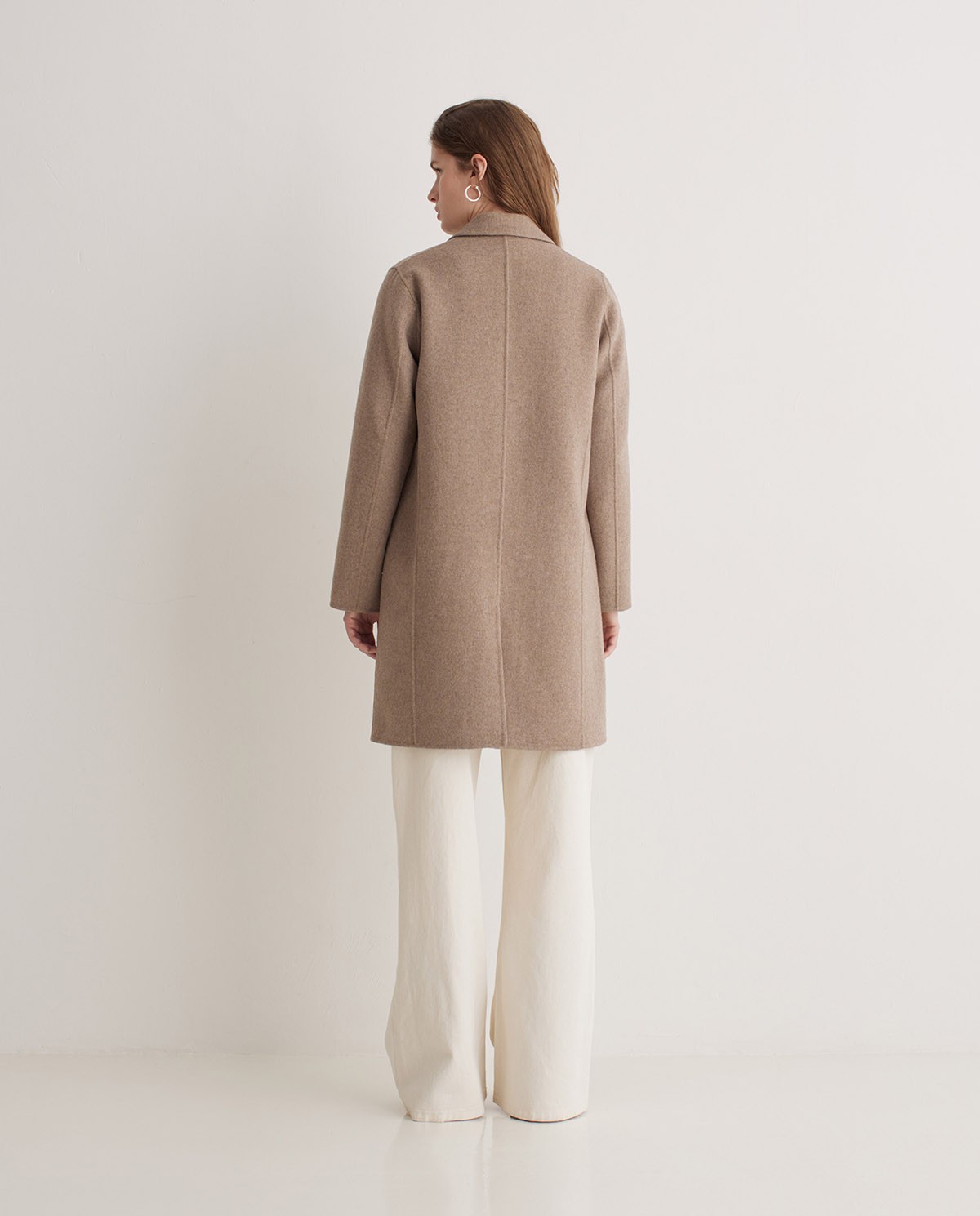 Abrigo midi handmade. Regular fit. Tejido mezcla con lana y fibras recicladas. Sin forro. Cuello camisero. Manga larga. Cierre frontal con botones. Abertura posterior. Dos bolsillos frontales con solapa y un bolsillo de vivo en el pecho.