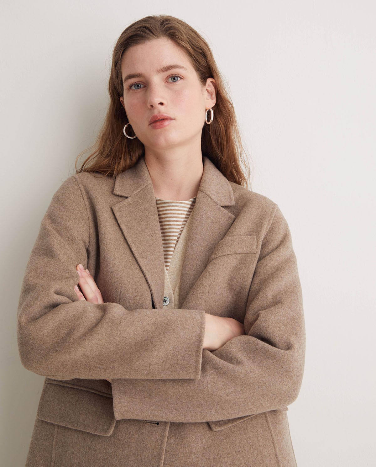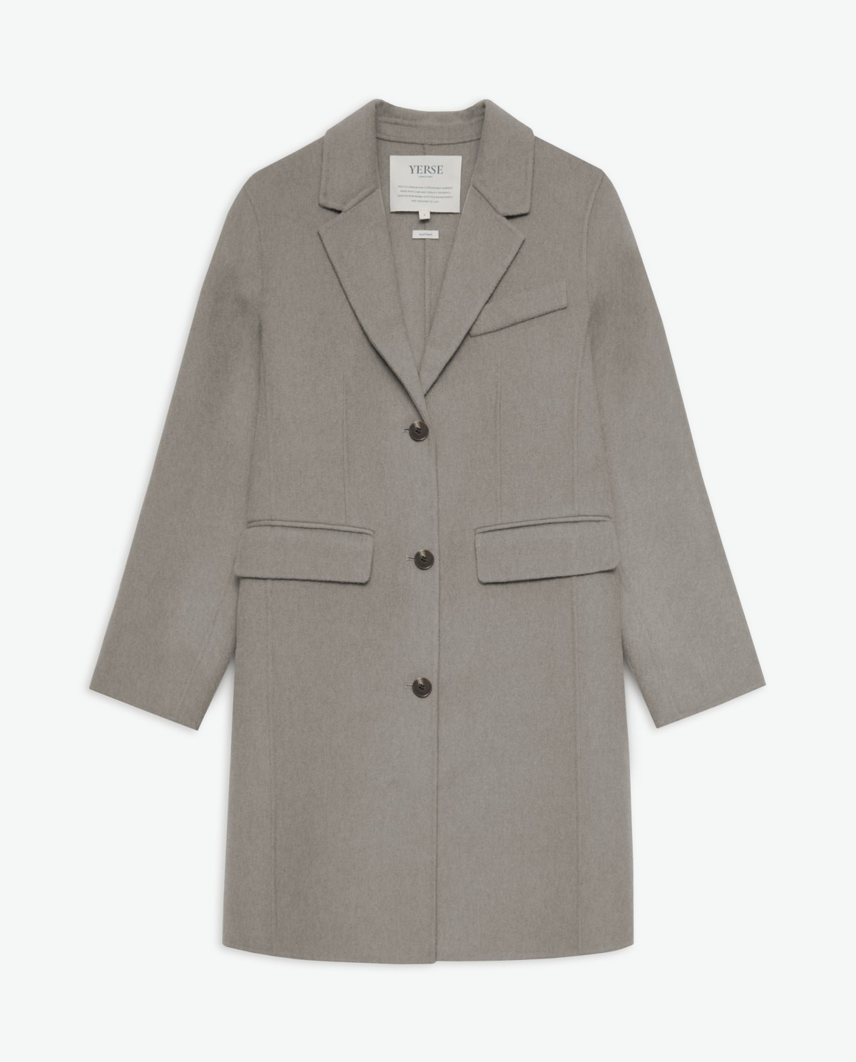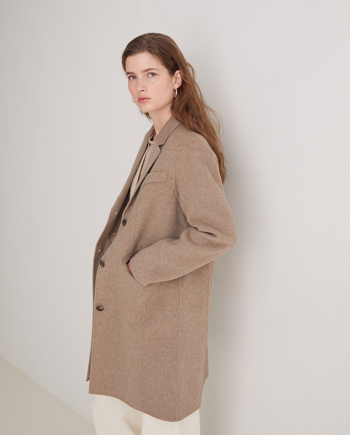 Abrigo midi handmade. Regular fit. Tejido mezcla con lana y fibras recicladas. Sin forro. Cuello camisero. Manga larga. Cierre frontal con botones. Abertura posterior. Dos bolsillos frontales con solapa y un bolsillo de vivo en el pecho.