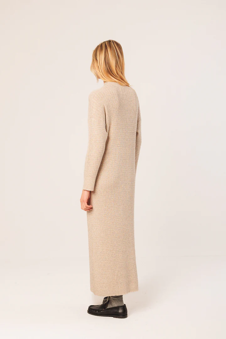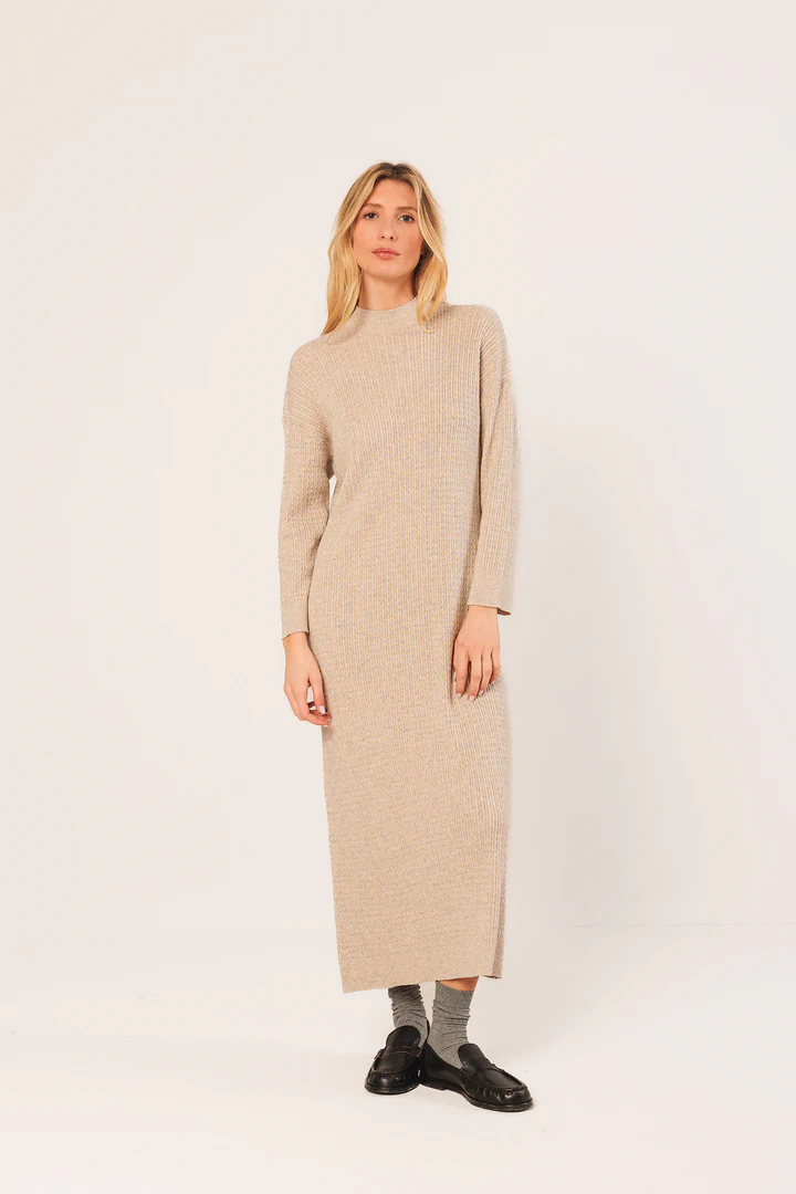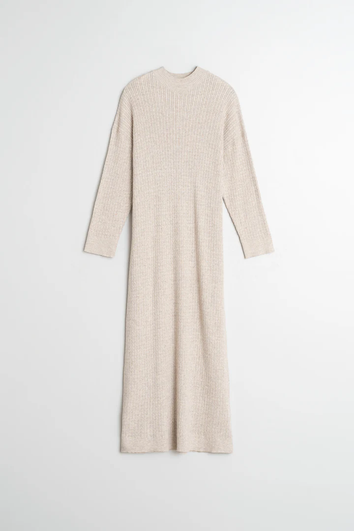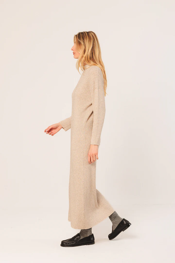 Este vestido nunca falla. Es largo, hombro caído y con cuello perkins y manga larga. El corte es relajado y está compuesto de punto de lana sostenible con seda, lo que le da caída y suavidad.
