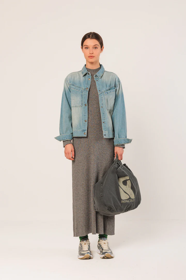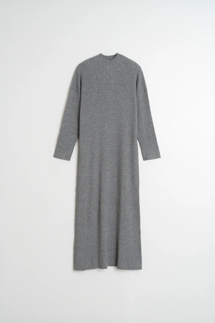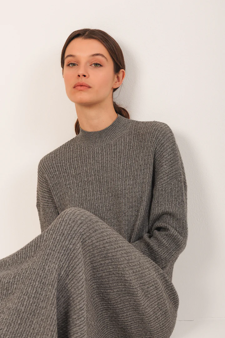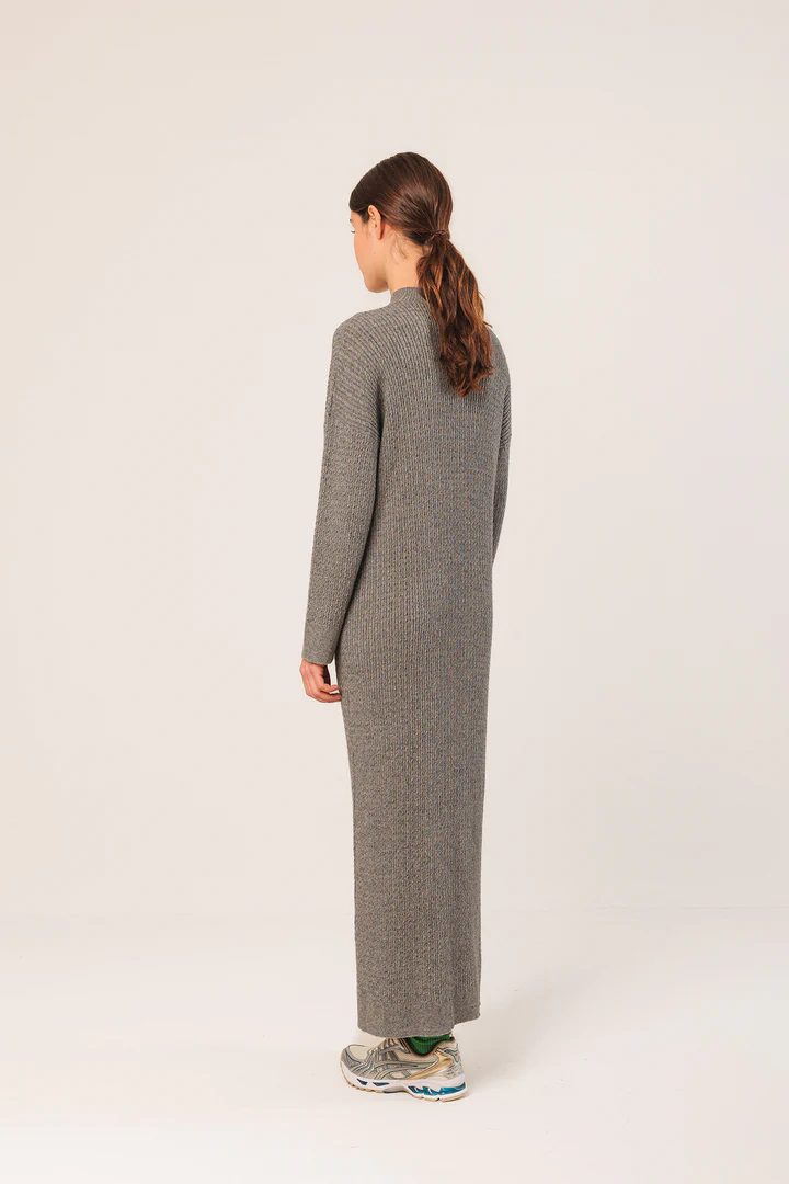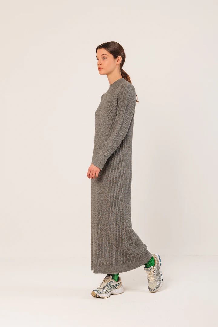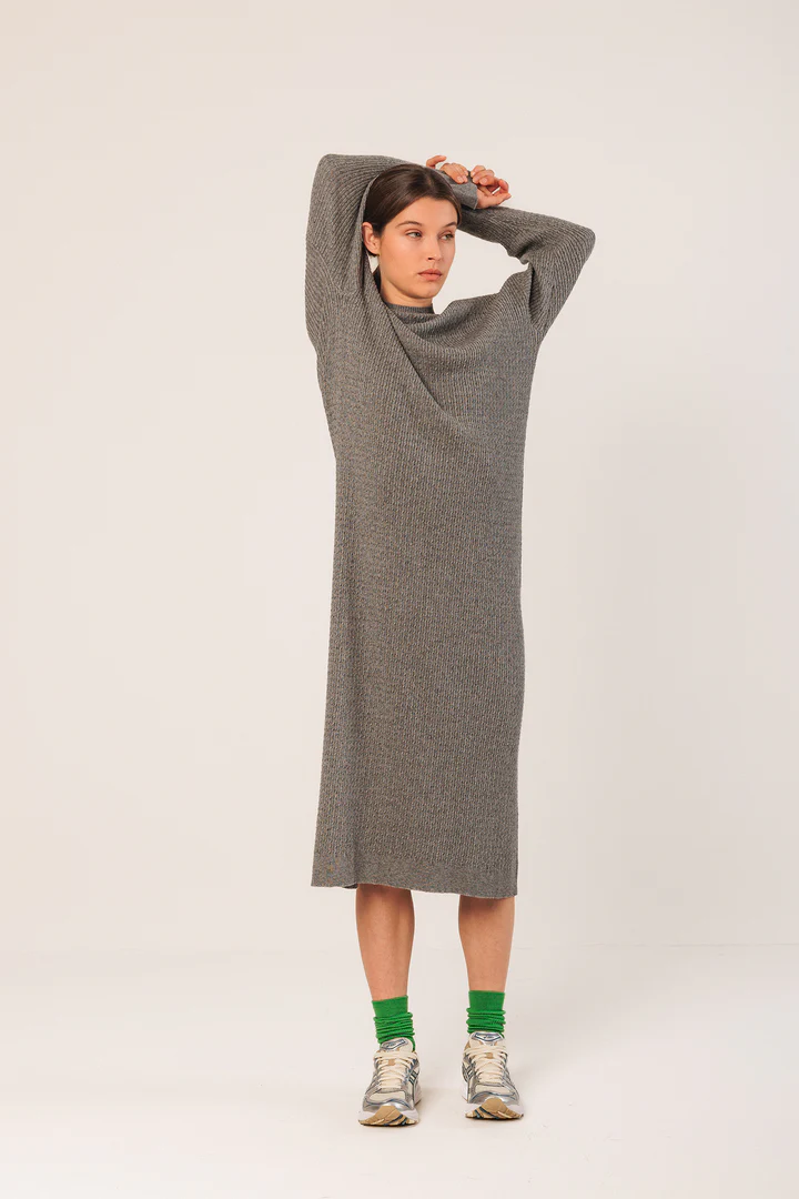 Este vestido nunca falla. Es largo, hombro caído y con cuello perkins y manga larga. El corte es relajado y está compuesto de punto de lana sostenible con seda, lo que le da caída y suavidad.