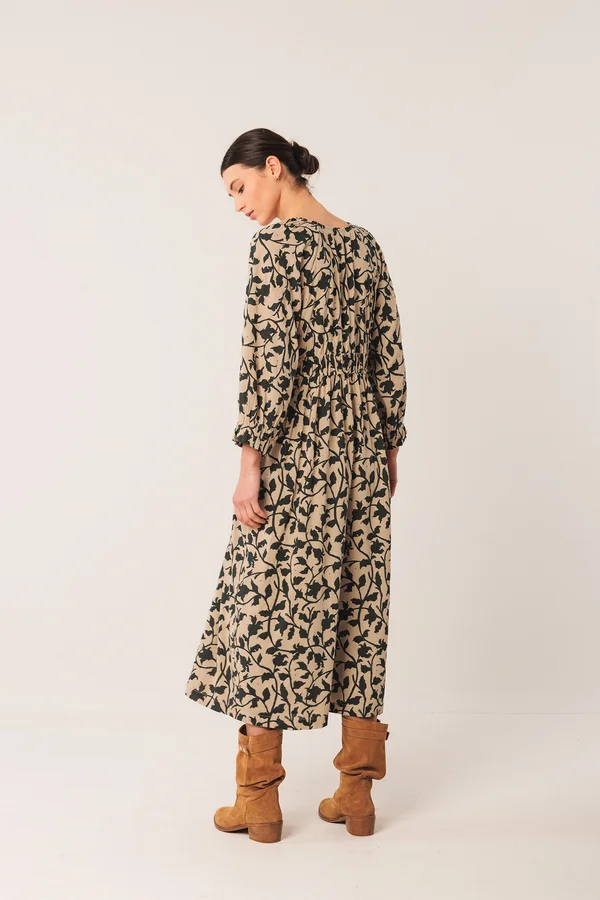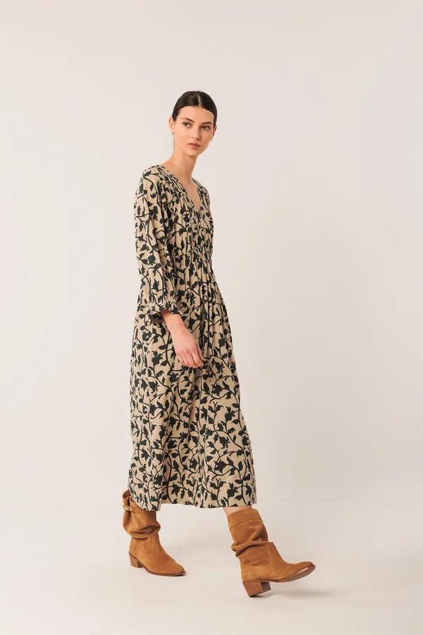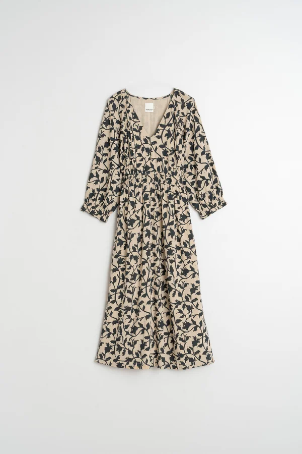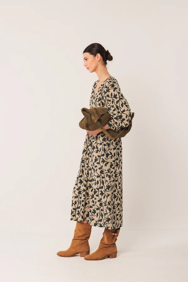 Un vestido midi no puede faltar en el armario. Tiene el escote en V y manga globo con puño. Cintura engomada para estilizar la silueta pero no se ajusta al cuerpo. Tiene bolsillos ocultos en los laterales y es de largo midi.