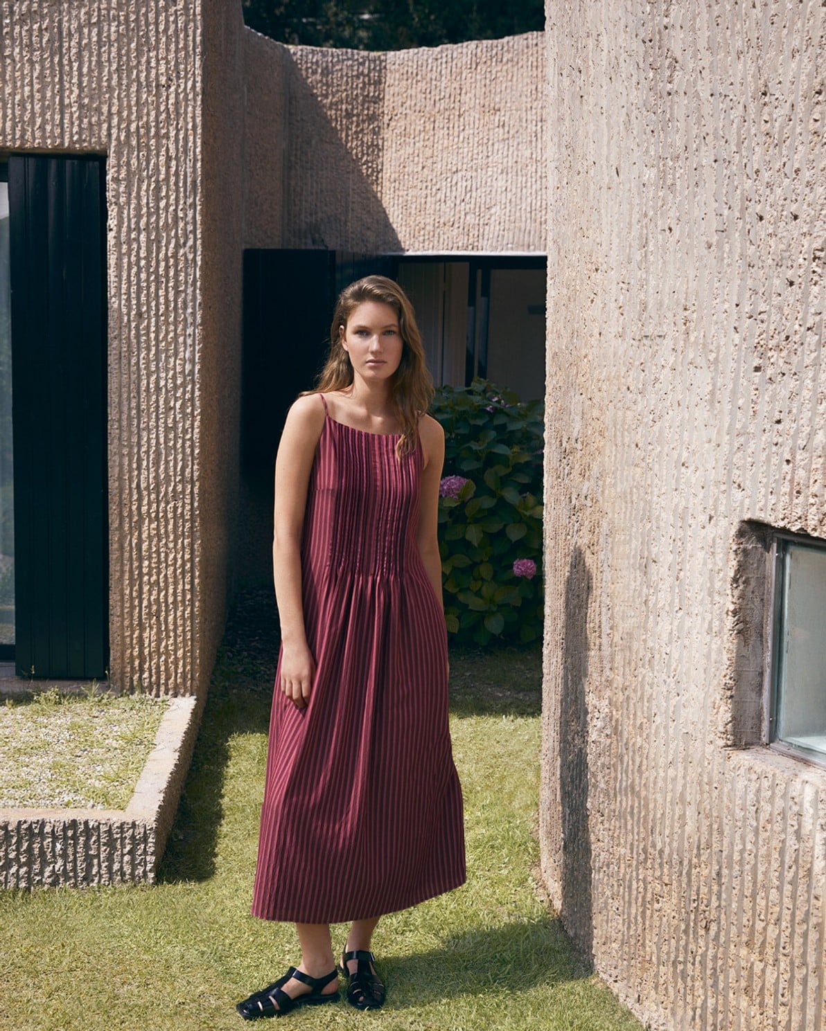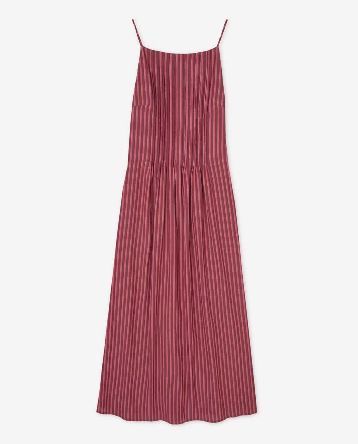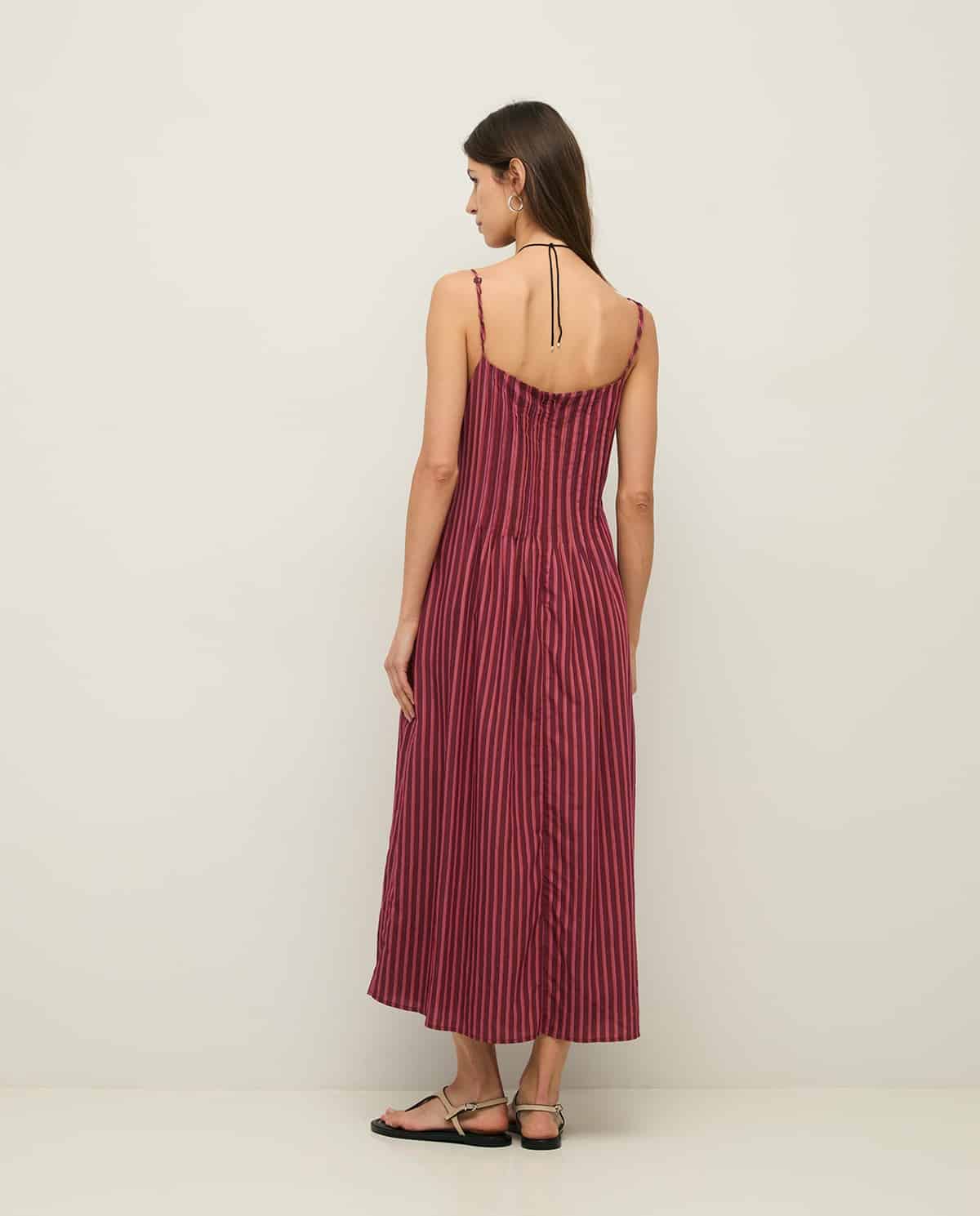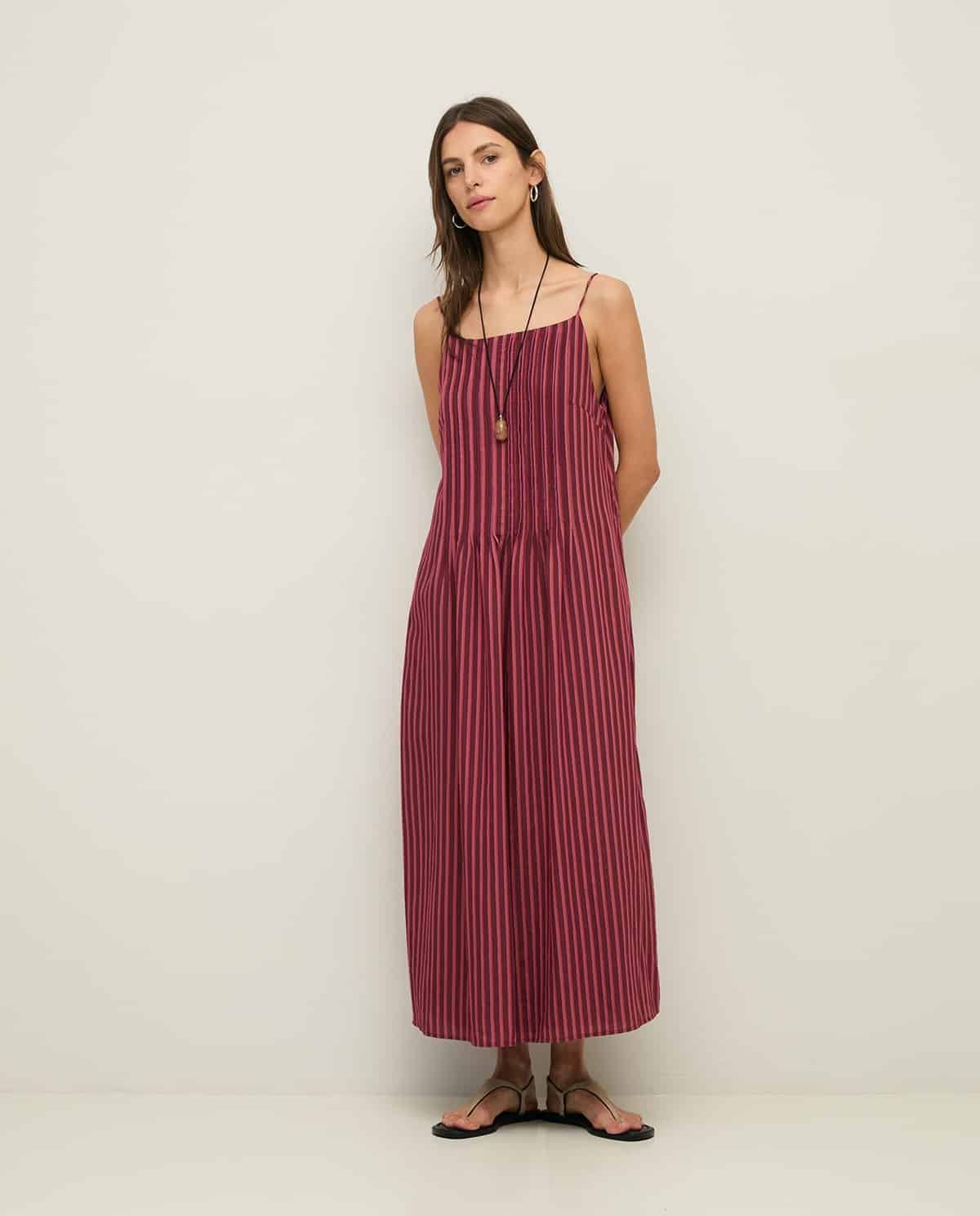 Vestido midi de tirantes finos y regulables. Elaborado en tejido mezcla de viscosa. Corte fluido y rayas verticales en tono burdeos y rosa. Escote recto, cierre mediante cremallera trasera. Forro interior. Detalle de jaretas verticales. Bolsillos laterales. Longitud desde el hombro 120cm, talla S.