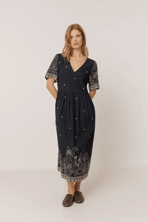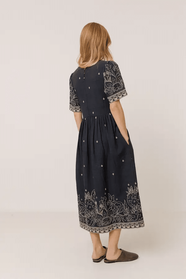 Es un vestido bordado de tejido natural en mezcla de algodón ideal para esos días en los que quieres ir cómoda, especial y con carácter. Vestido con cuello pico con cierre trasero de botones. Hombro encajado y manga corta amplia con bordado floral y cenefas.