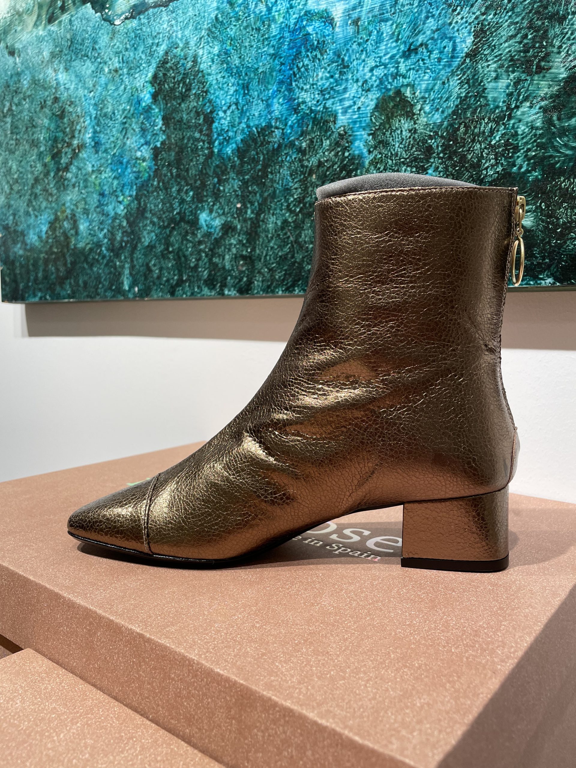 LOS BOTINES SOL SON UNA PIEZA ESENCIAL CON DISEÑO VERSÁTIL Y ATEMPORAL, ELABORADOS LOCALMENTE CON MATERIALES DE ALTA CALIDAD QUE PROMETEN PERDURAR EN EL TIEMPO. SU DISEÑO ES UN CLÁSICO PERO CON MULTITUD DE PEQUEÑOS DETALLES QUE LO CONVIERTEN EN EL BOTÍN PERFECTO. PUNTERA SUTILMENTE CUADRADA, CAÑA QUE SE AFINA A LA ALTURA DEL TOBILLO, CREMALLERA DORADA CON TIRADOR DE DISEÑO EN LA PARTE TRASERA Y TACÓN DE 4,5 CM EN BLOQUE Y FORMA DE U. PLANTILLA CLOUD ACOLCHADA PARA LA MÁXIMA COMODIDAD.