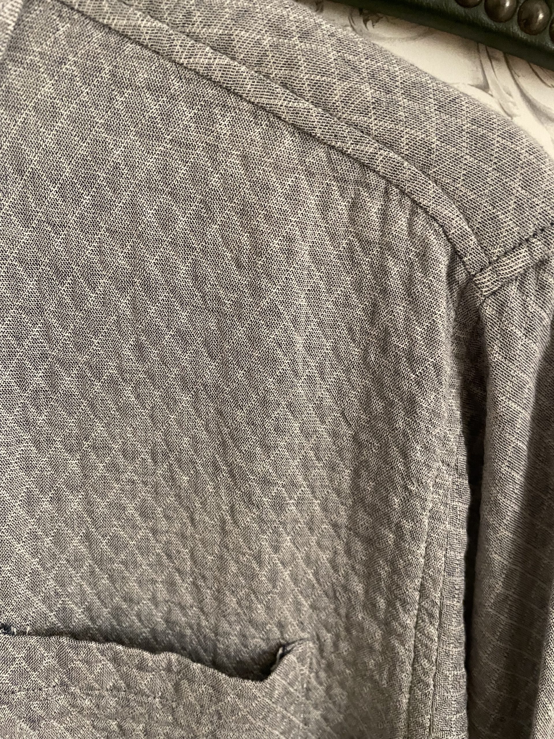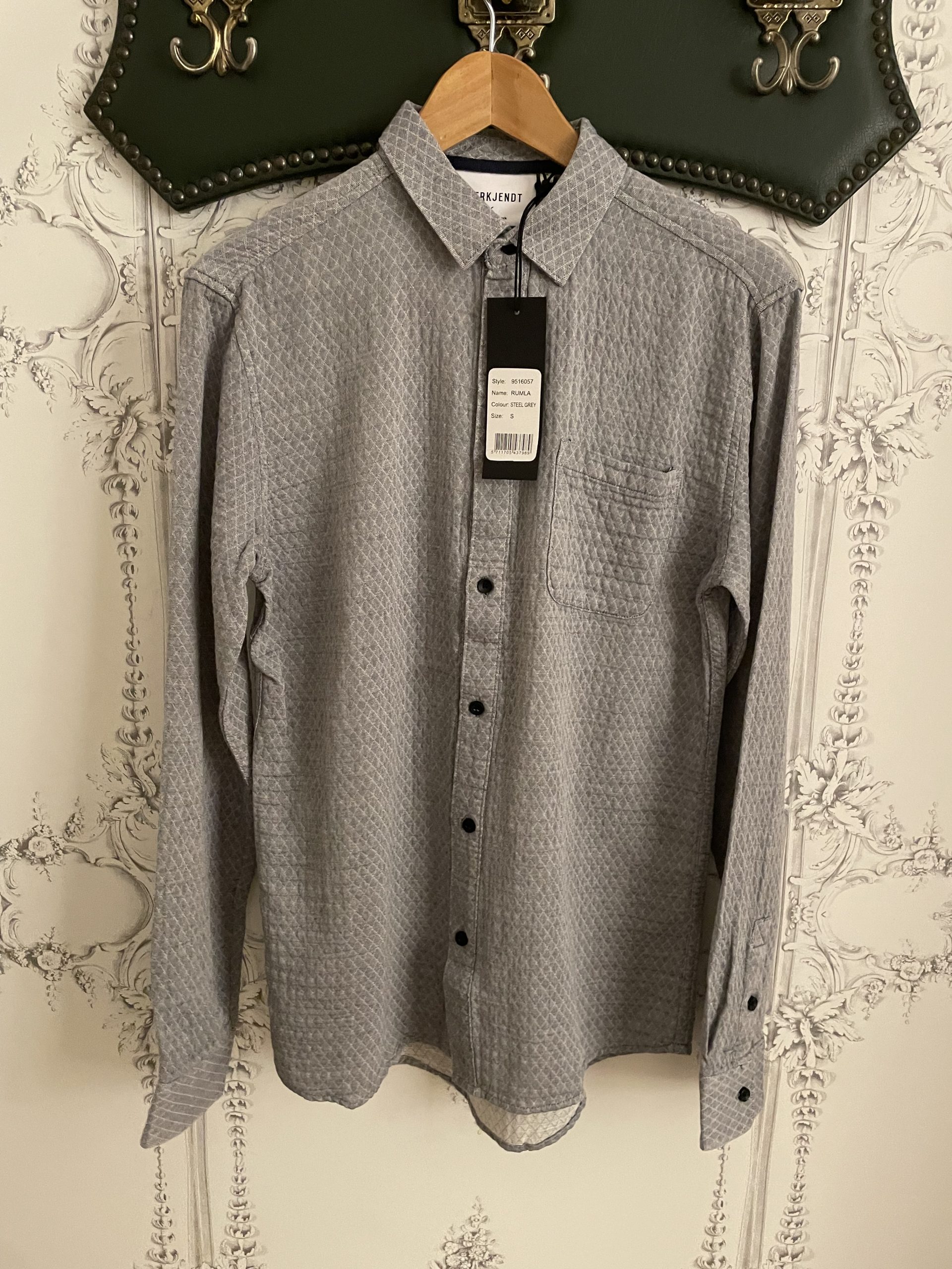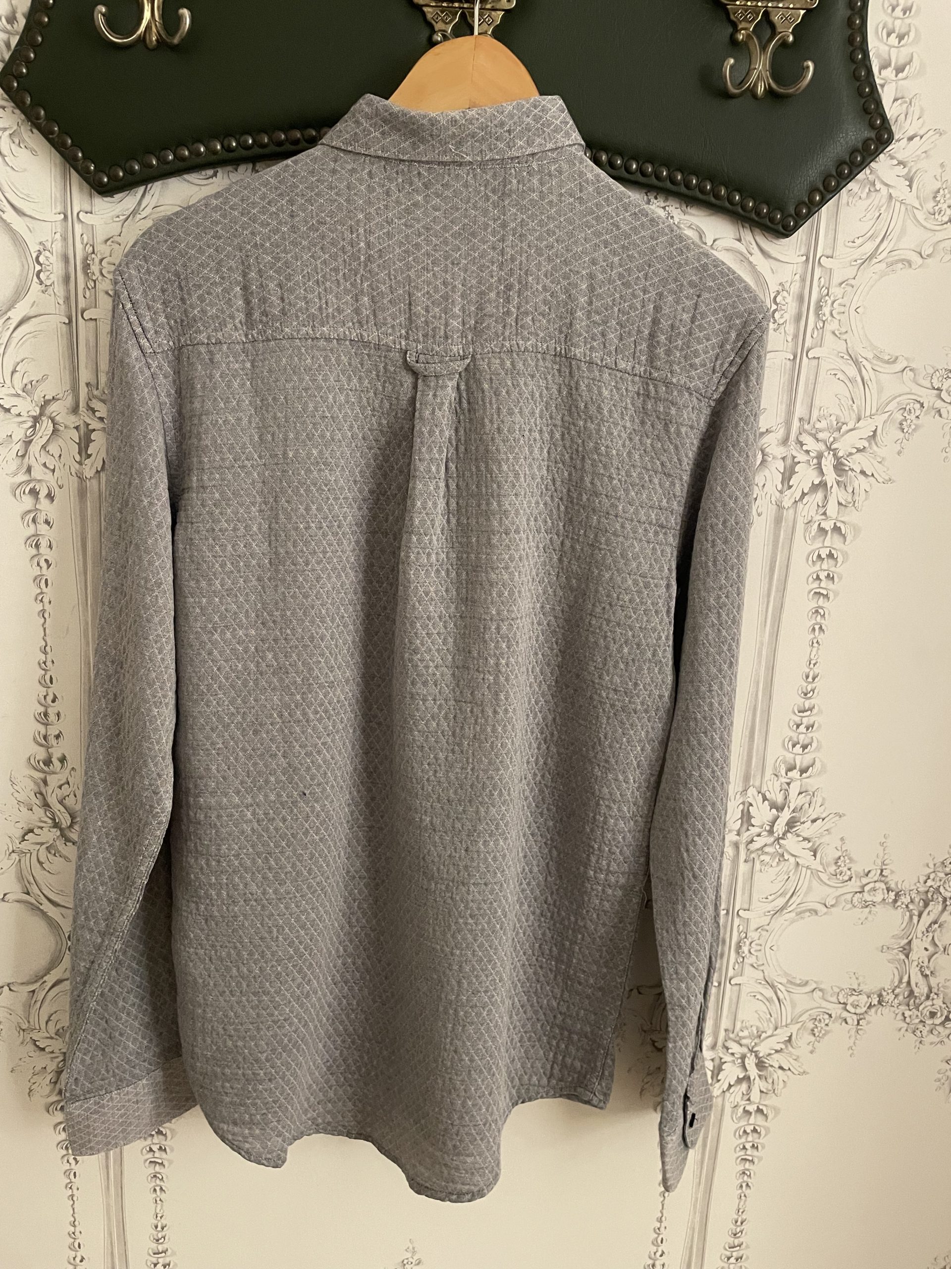 CAMISA DE MANGA LARGA FIT REGULAR CON DETALLE DE DIBUJO GEOMÉTRICO EN EL TEJIDO. CIERRE CON BOTONES NEGROS.