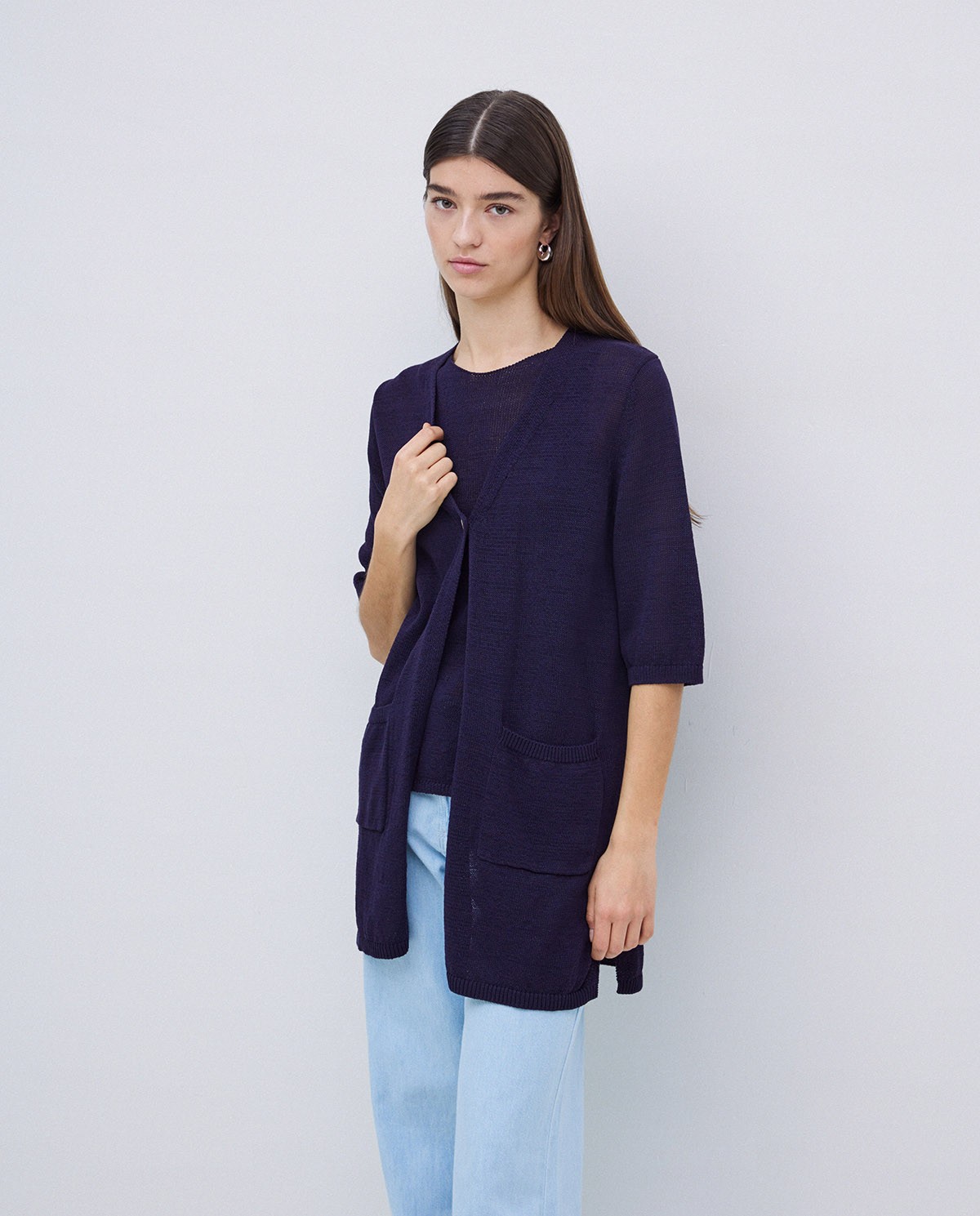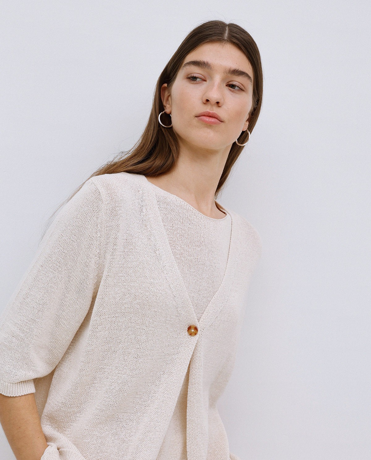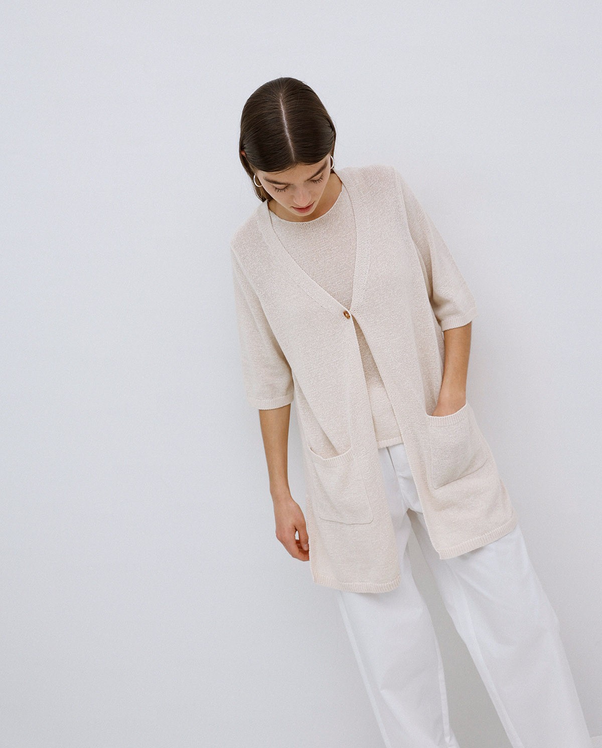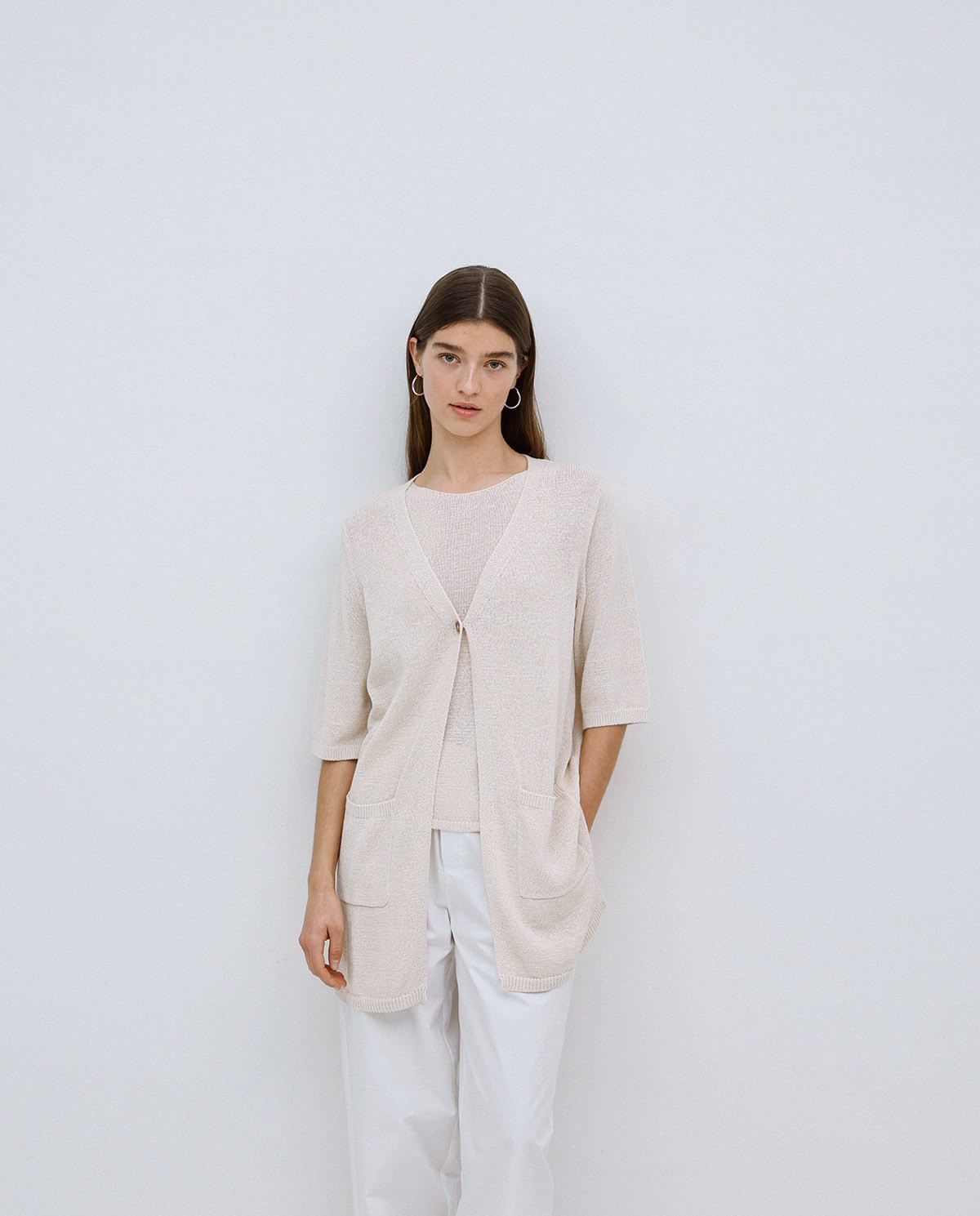 CÁRDIGAN TEJIDO PUNTO. TEJIDO MEZCLA DE ALGODÓN Y LINO. DISEÑO RECTO. ESCOTE DE PICO. MANGA TRES CUARTOS. CIERRE CON BOTONES ESTILO CAREY ABERTURAS LATERALES. DOS BOLSILLOS DE PLASTRÓN DELATEROS.