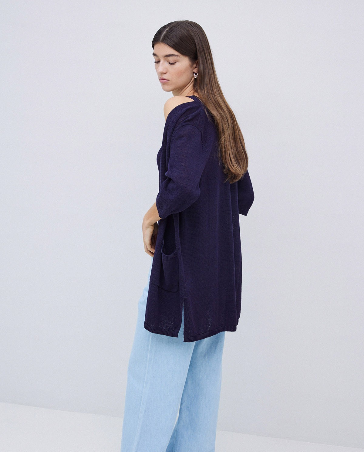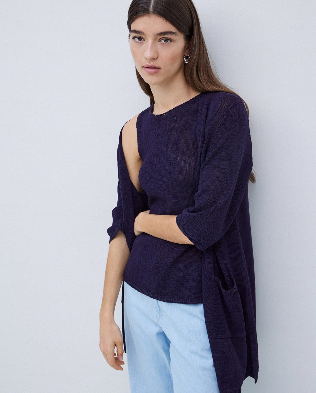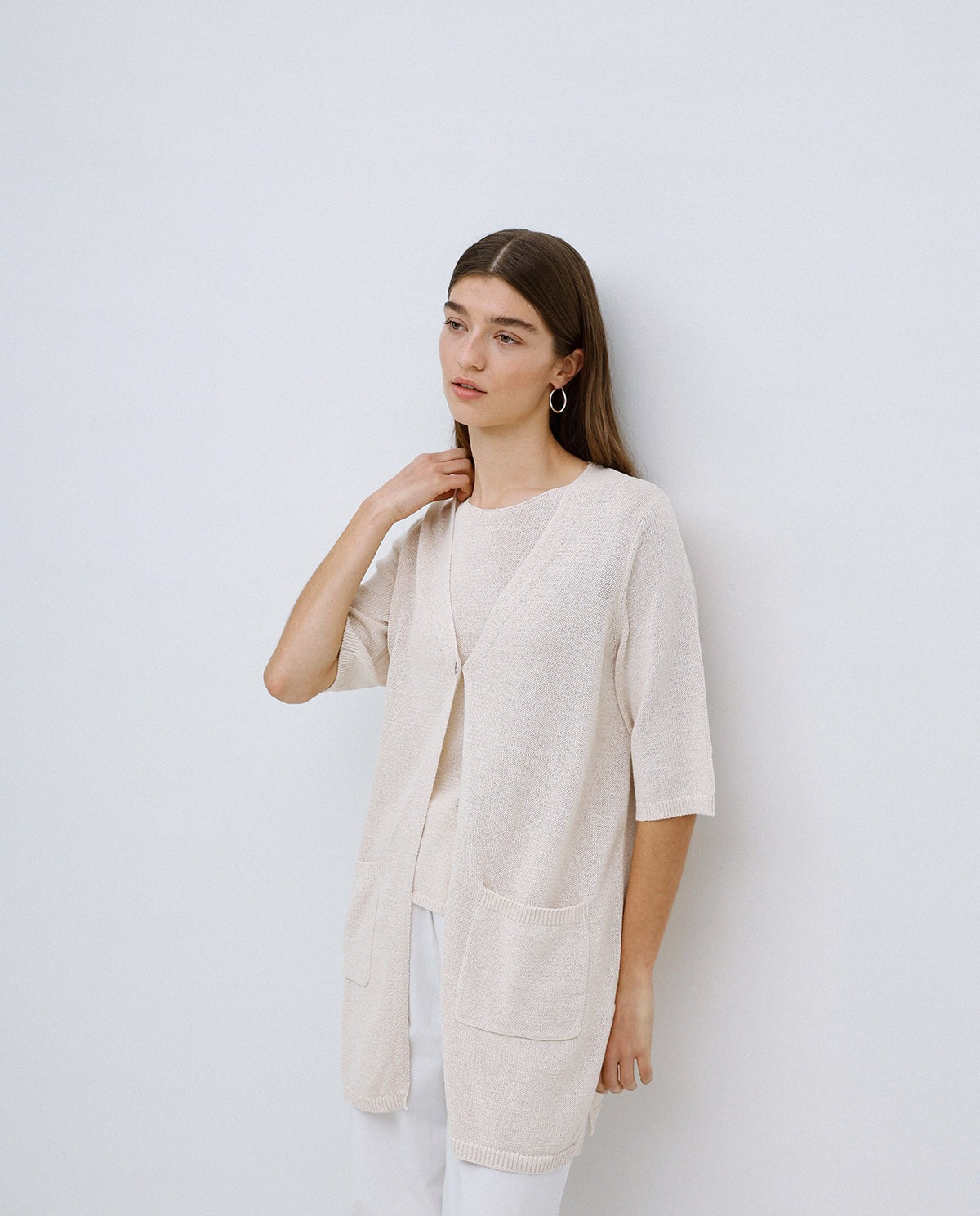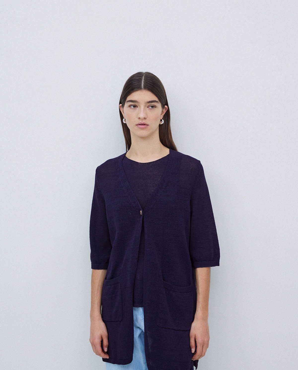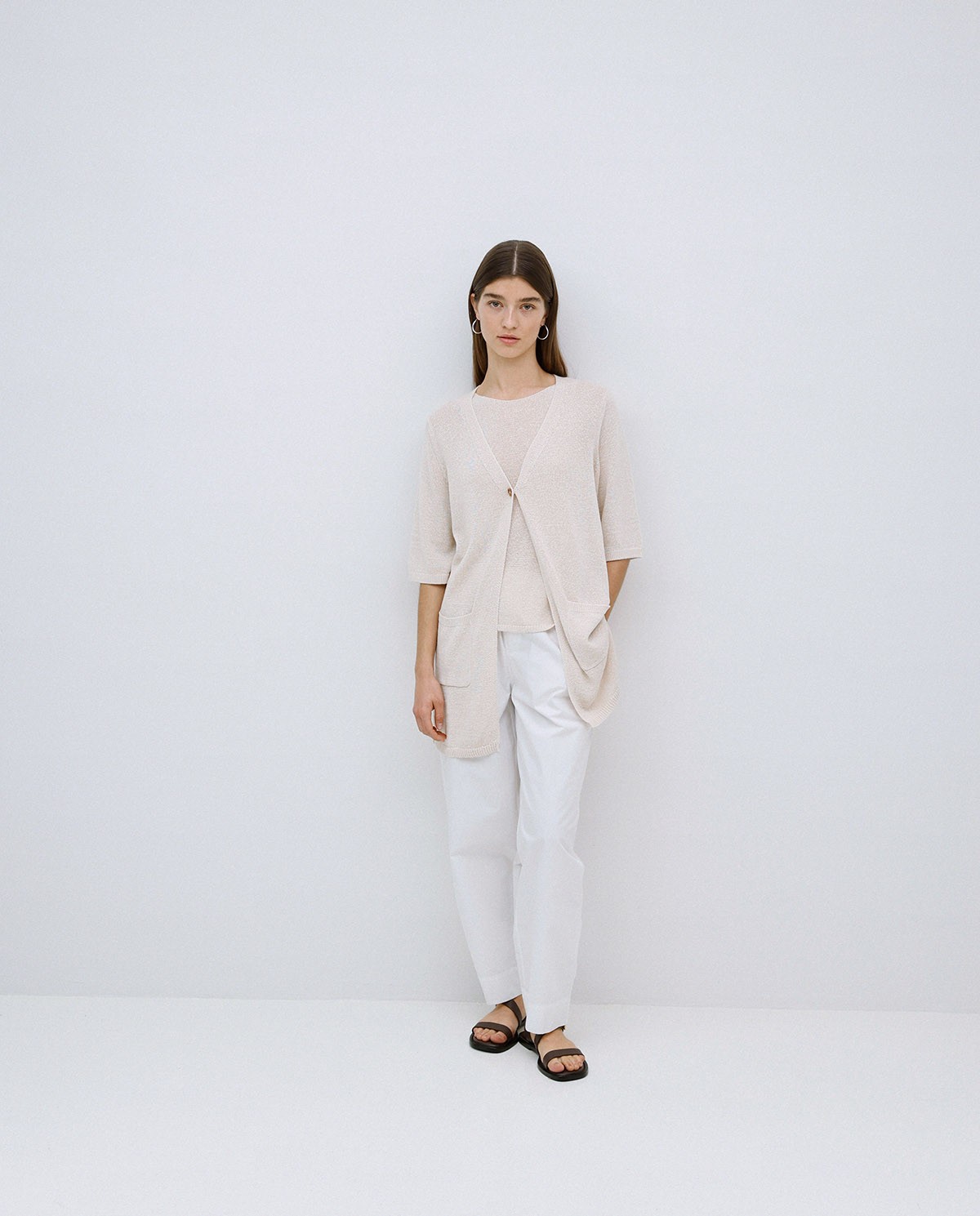 CÁRDIGAN TEJIDO PUNTO. TEJIDO MEZCLA DE ALGODÓN Y LINO. DISEÑO RECTO. ESCOTE DE PICO. MANGA TRES CUARTOS. CIERRE CON BOTONES ESTILO CAREY ABERTURAS LATERALES. DOS BOLSILLOS DE PLASTRÓN DELATEROS.