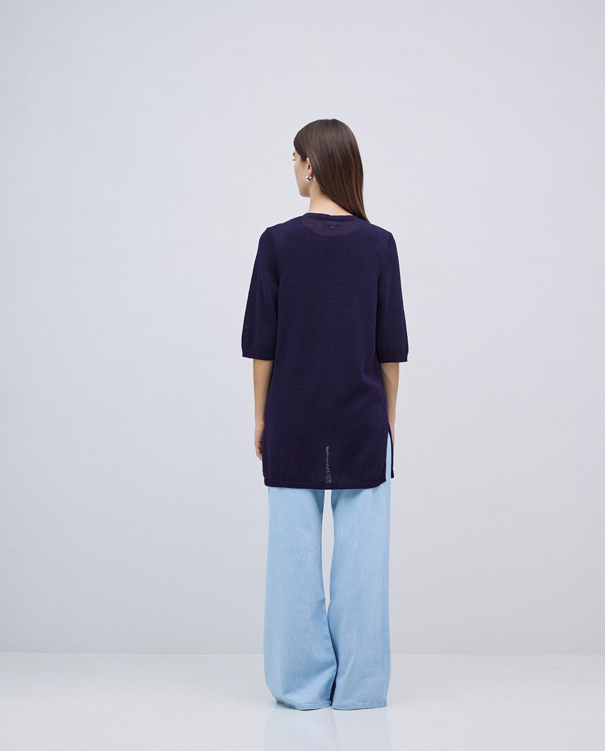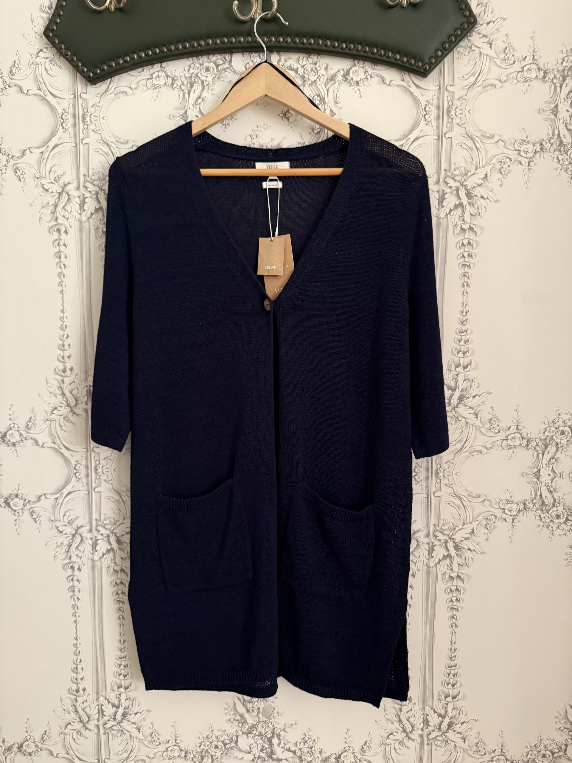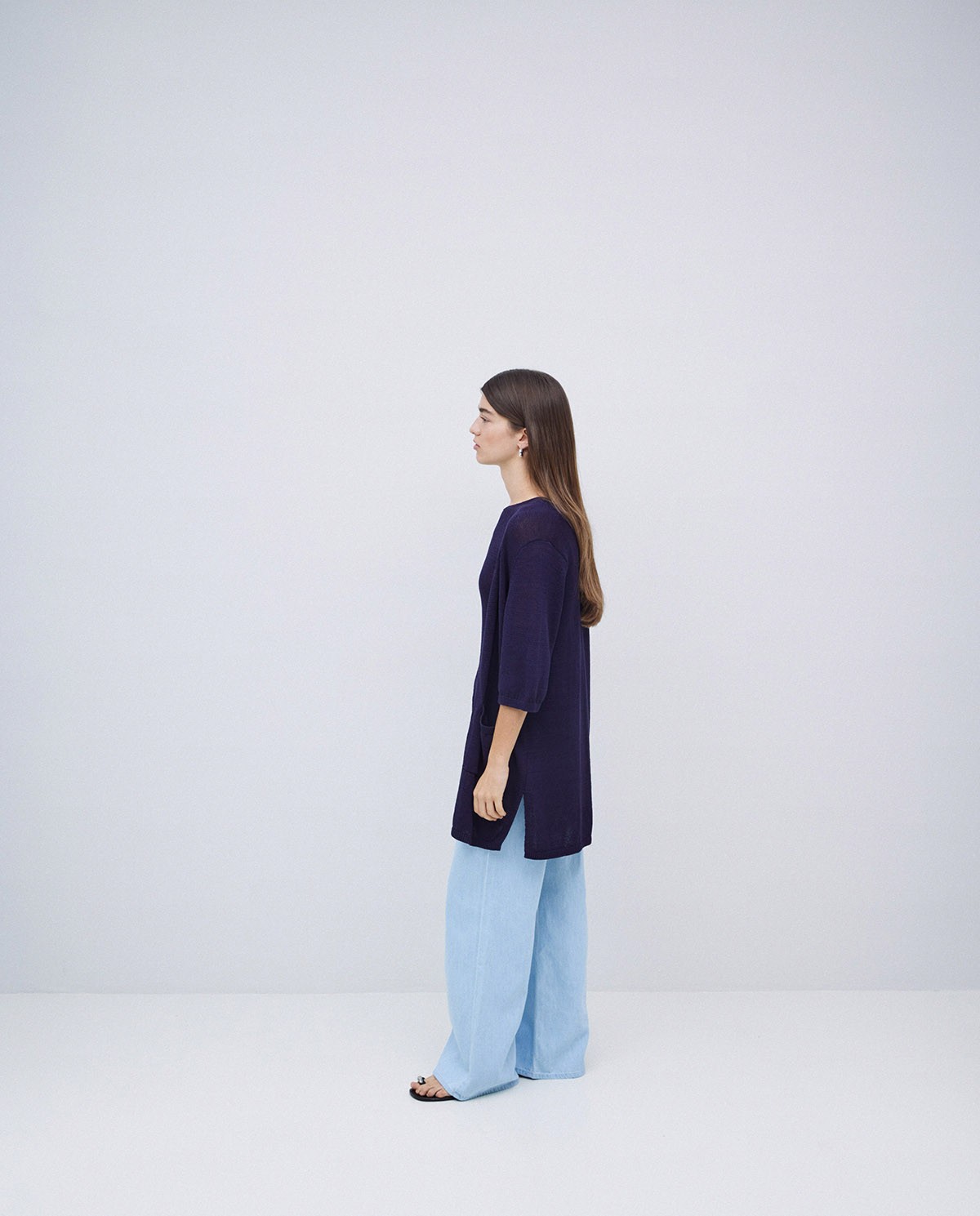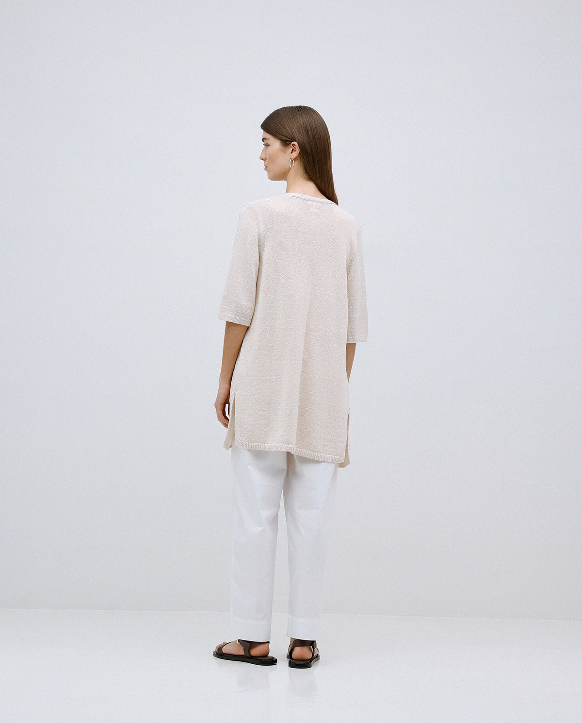 CÁRDIGAN TEJIDO PUNTO. TEJIDO MEZCLA DE ALGODÓN Y LINO. DISEÑO RECTO. ESCOTE DE PICO. MANGA TRES CUARTOS. CIERRE CON BOTONES ESTILO CAREY ABERTURAS LATERALES. DOS BOLSILLOS DE PLASTRÓN DELATEROS.